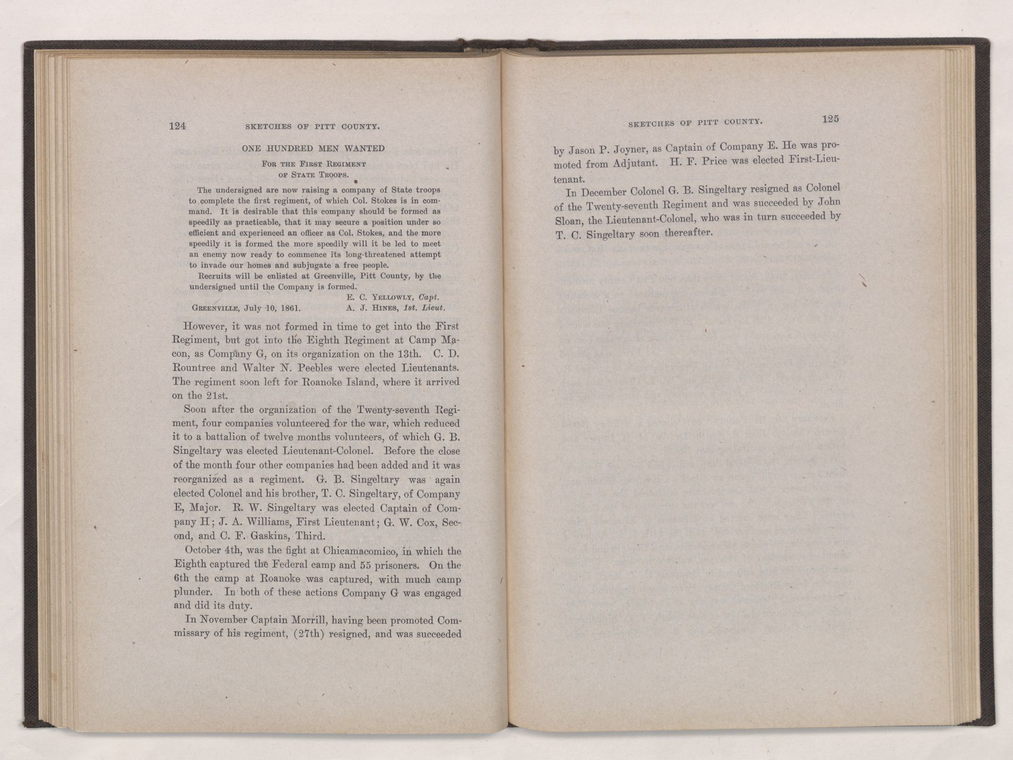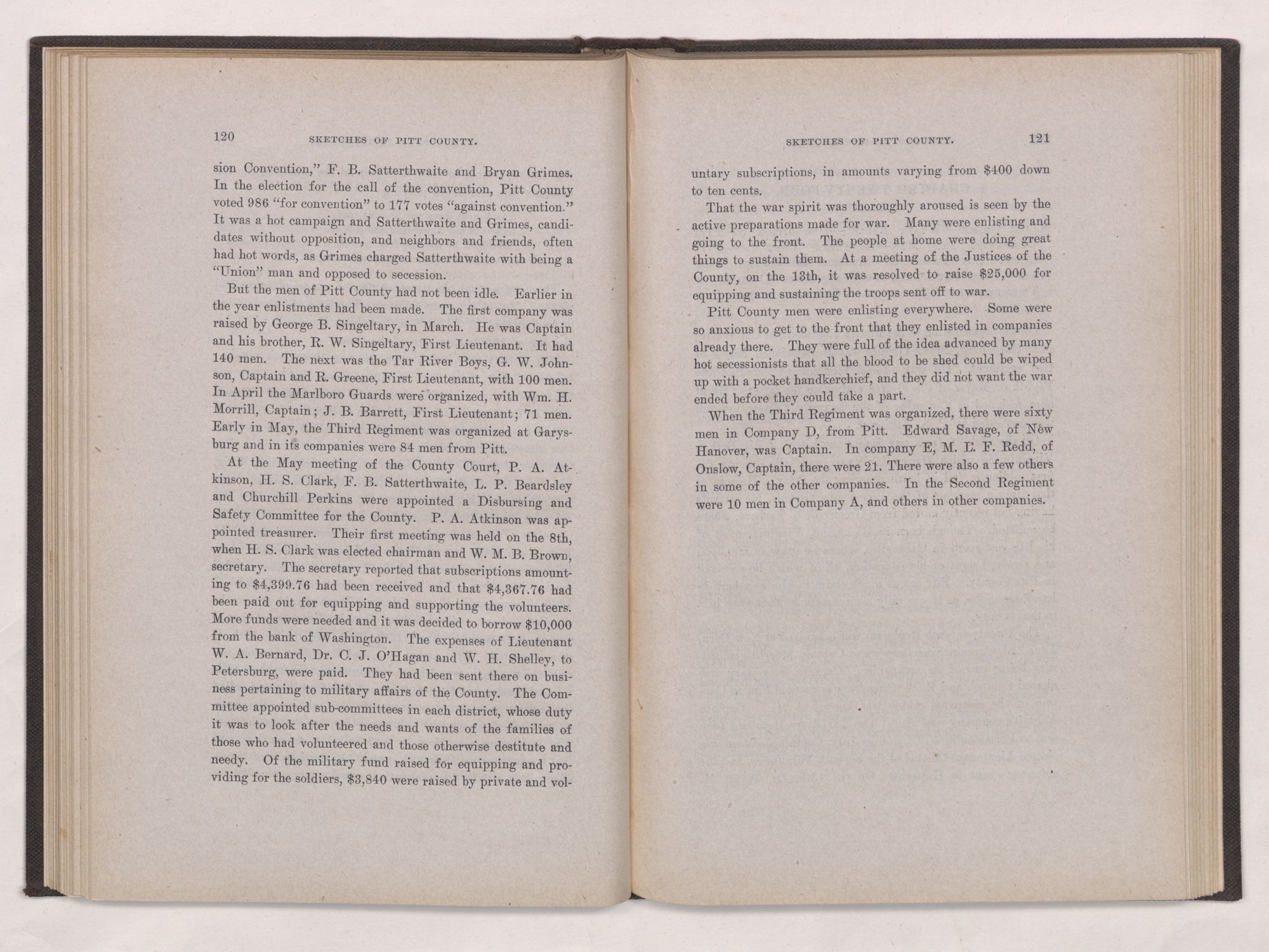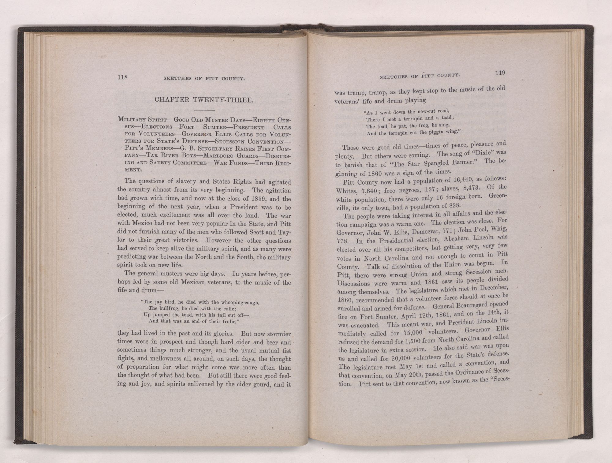 | CHAPTER TWENTY-THREE. Military Spirit—Good Old Muster Days—Eighth Census—Elections—Fort Sumter—President Calls for Volunteers—Governor Ellis Calls for Volunteers for State's Defense—Secession Convention—Pitt's Members—G. B. Singeltary Raises First Company—Tar River Boys—Marlboro Guards—Disbursing and Safety Committee—War Funds—Third Regiment | 118 |