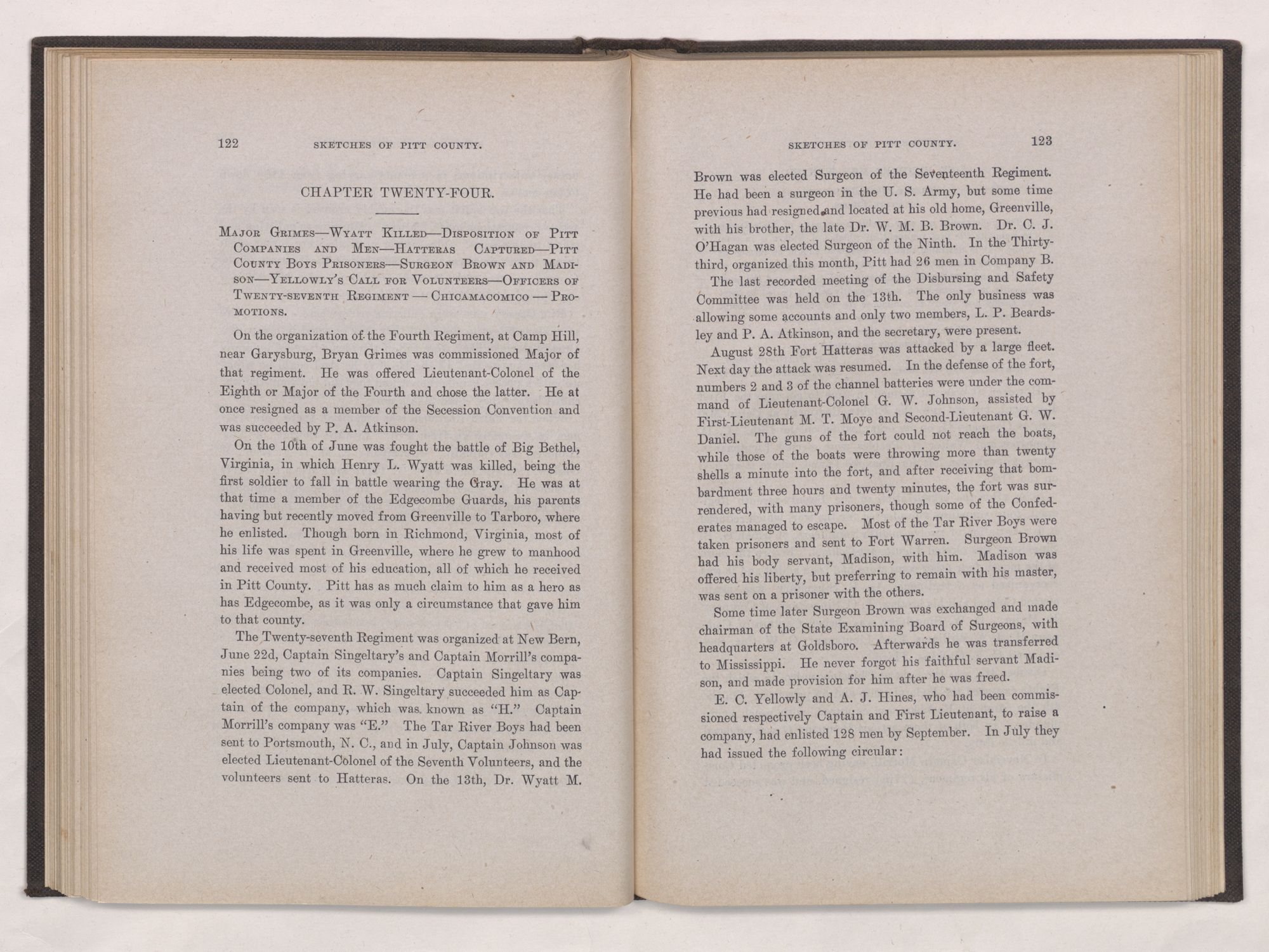 | CHAPTER TWENTY-FOUR. Major Grimes—Wyatt Killed—Disposition of Pitt Companies and Men—Hatteras Captured—Pitt County Boys Prisoners—Surgeon Brown and Madison—Yellowly's Call for Volunteers—Officers of Twenty-seventh Regiment—Chicamacomico—Promotions | 122 |