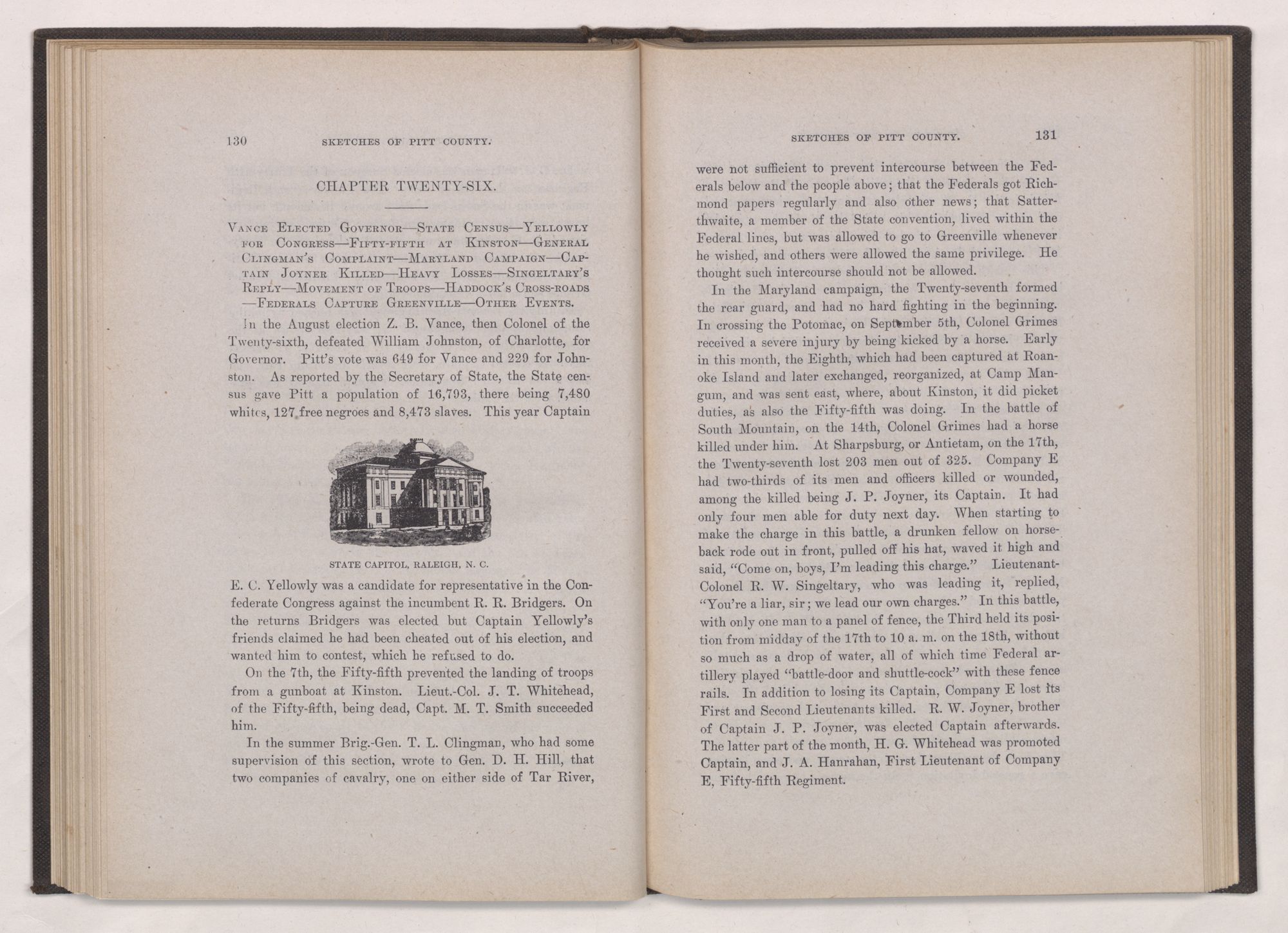 | CHAPTER TWENTY-SIX. Vance Elected Governor—State Census—Yellowly for Congress—Fifty-fifth at Kinston—General Clingman's Complaint—Maryland Campaign—Captain Joyner Killed—Heavy Losses—Singeltary's Reply—Movement of Troops—Haddock's Cross-roads—Federals Capture Greenville—Other Events | 130 |