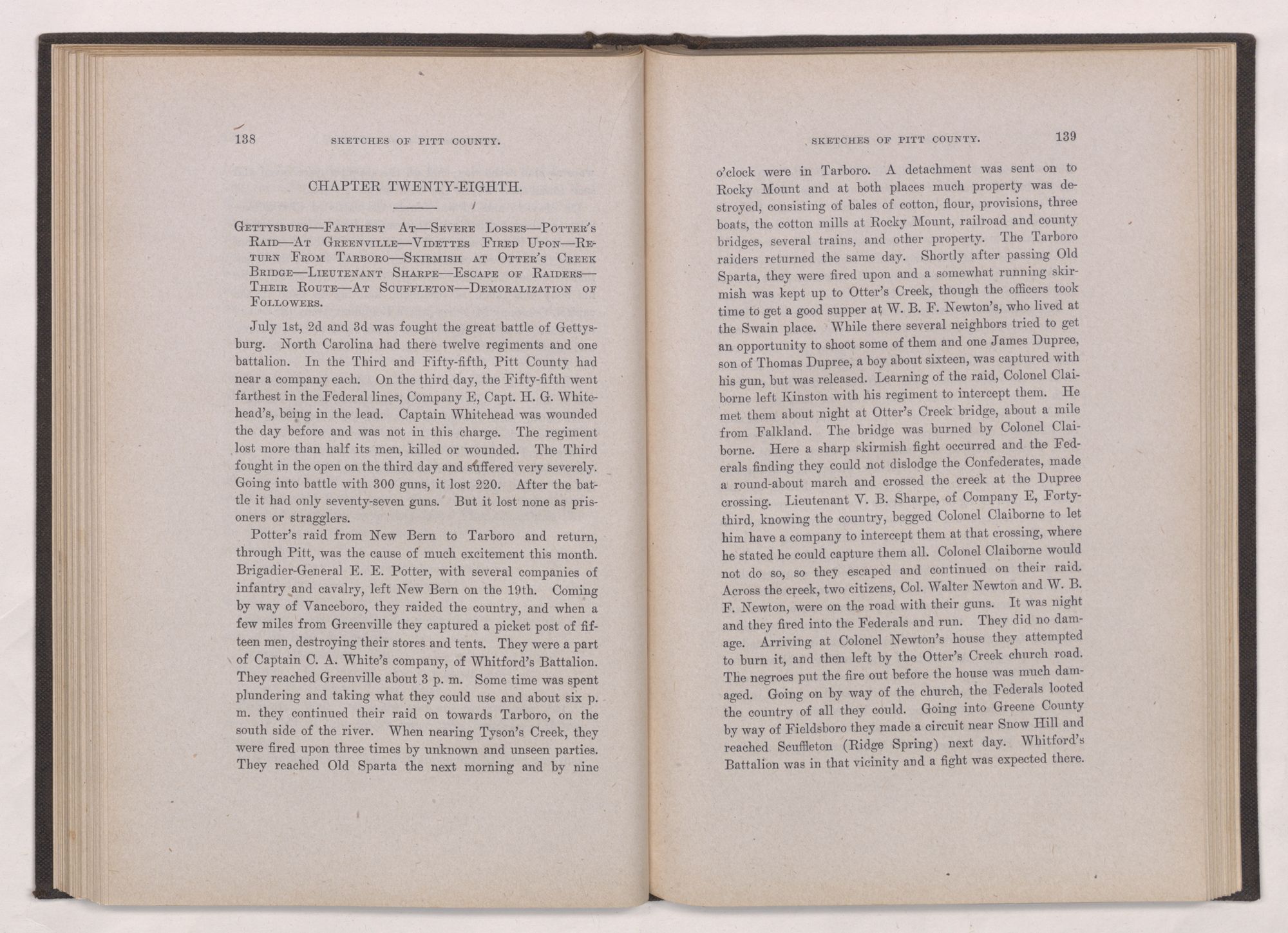 | CHAPTER TWENTY-EIGHT. Gettysburg—Farthest At—Severe Losses—Potter's Raid—At Greenville—Videttes Fired Upon—Return from Tarboro—Skirmish at Otter's Creek Bridge—Lieutenant Sharpe—Escape of Raiders—Their Route—At Scuffleton—Demoralization of Followers | 138 |
