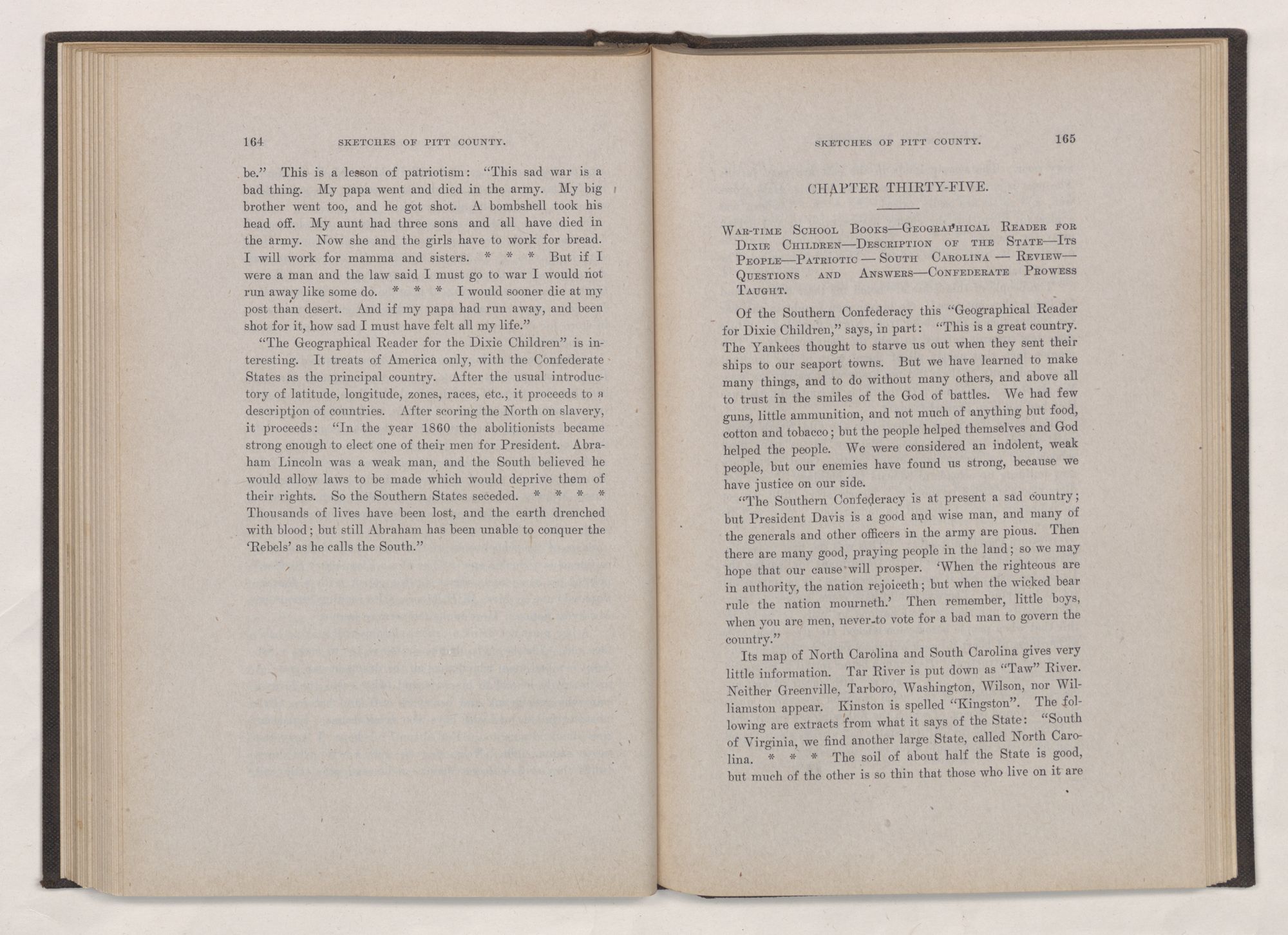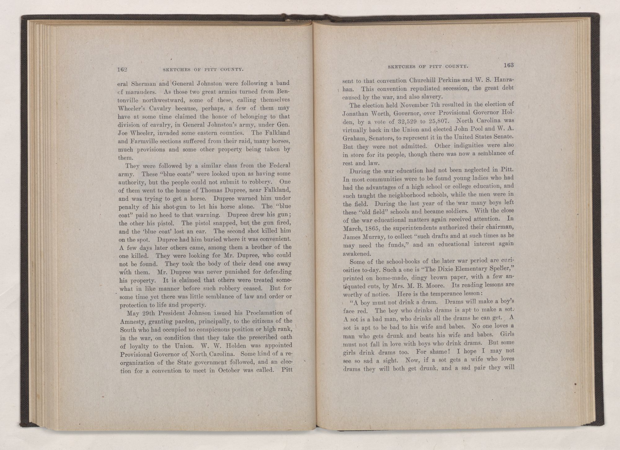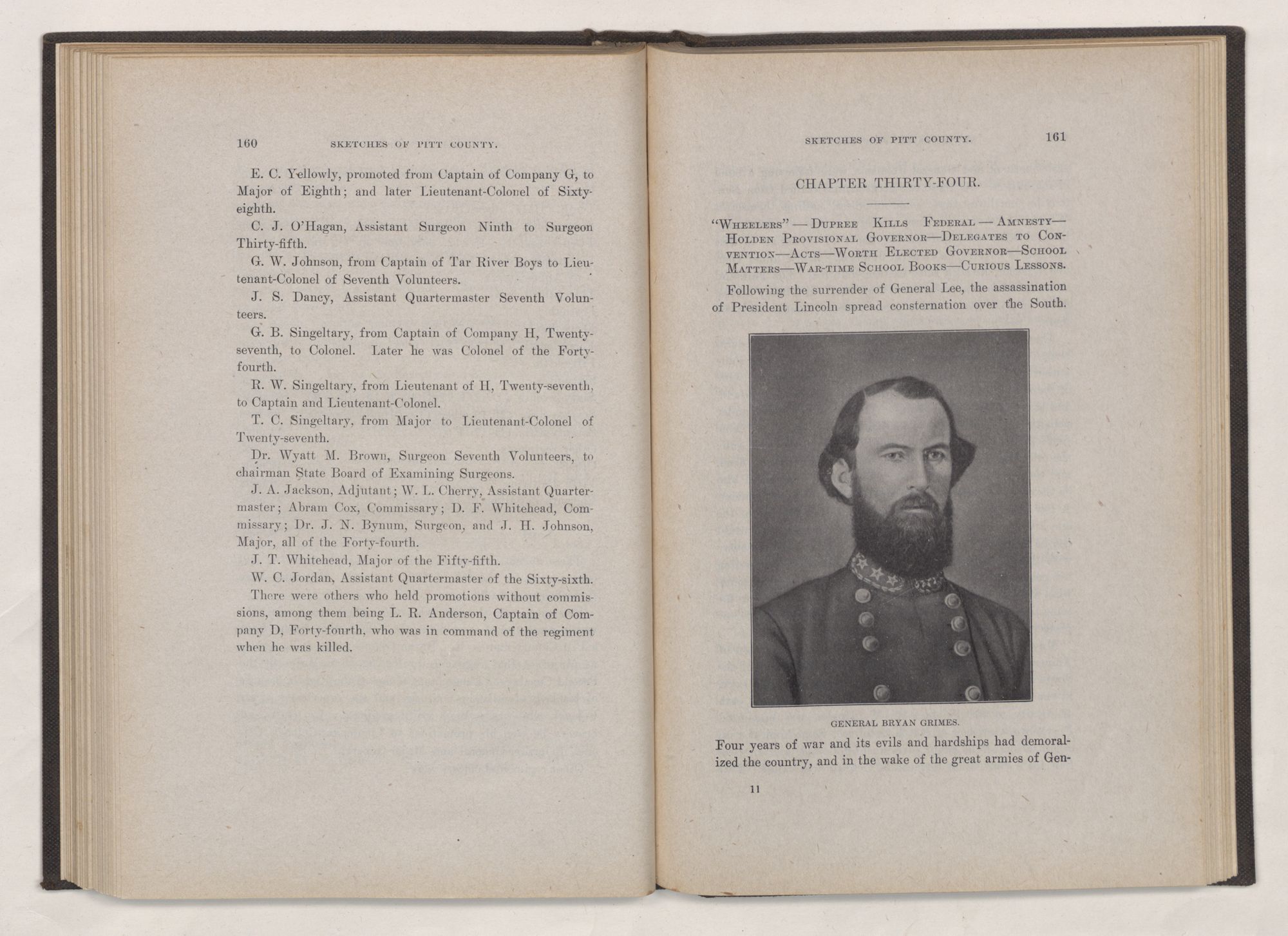 | CHAPTER THIRTY-FOUR. “Wheelers”—Dupree Kills Federal—Amnesty—Holden Provisional Governor—Delegates to Convention—Acts—Worth Elected Governor—School Matters—War-time School Books—Curious Lessons | 161 |