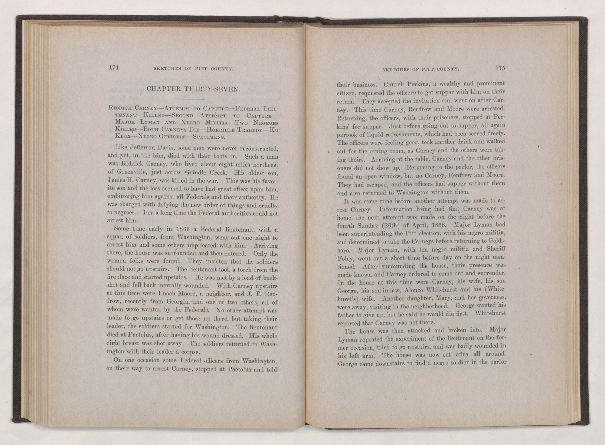 | CHAPTER THIRTY-SEVEN. Riddick Carney—Attempt to Capture—Federal Lieutenant Killed—Second Attempt to Capture—Major Lyman and Negro Militia—Two Negroes Killed—Both Carneys Die—Horrible Tragedy—Ku Klux—Negro Officers—Specimens | 174 |
