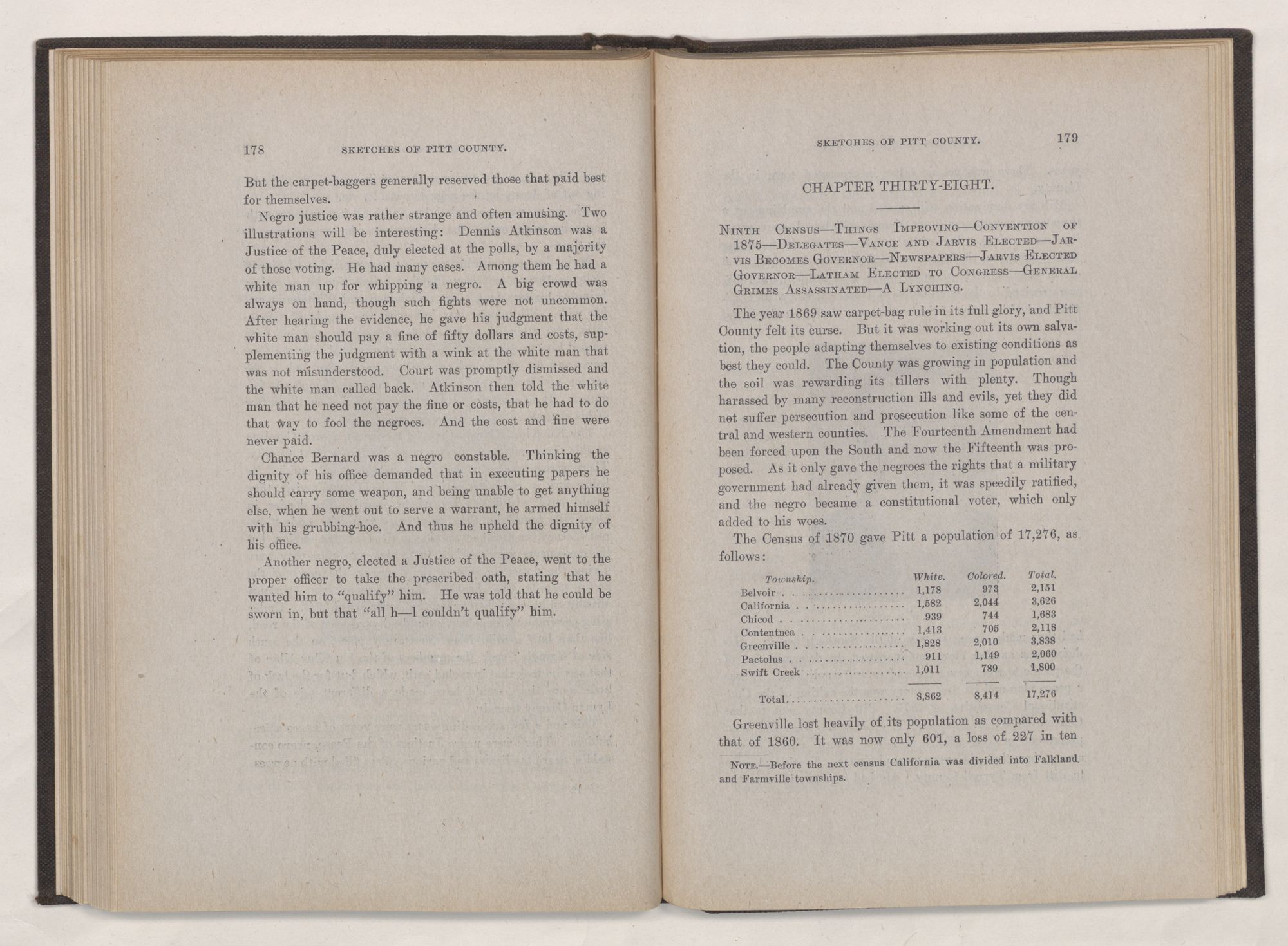 | CHAPTER THIRTY-EIGHT. Ninth Census—Things Improving—Convention of 1875—Delegates—Vance and Jarvis Elected—Jarvis Becomes Governor—Newspapers—Jarvis Elected Governor—Latham Elected to Congress—General Grimes Assassinated—A Lynching | 179 |