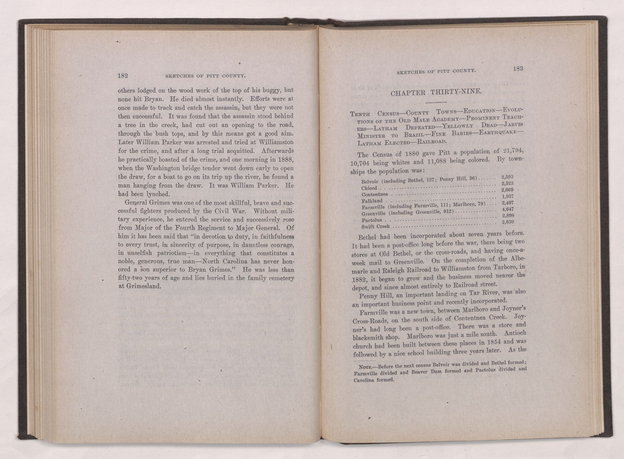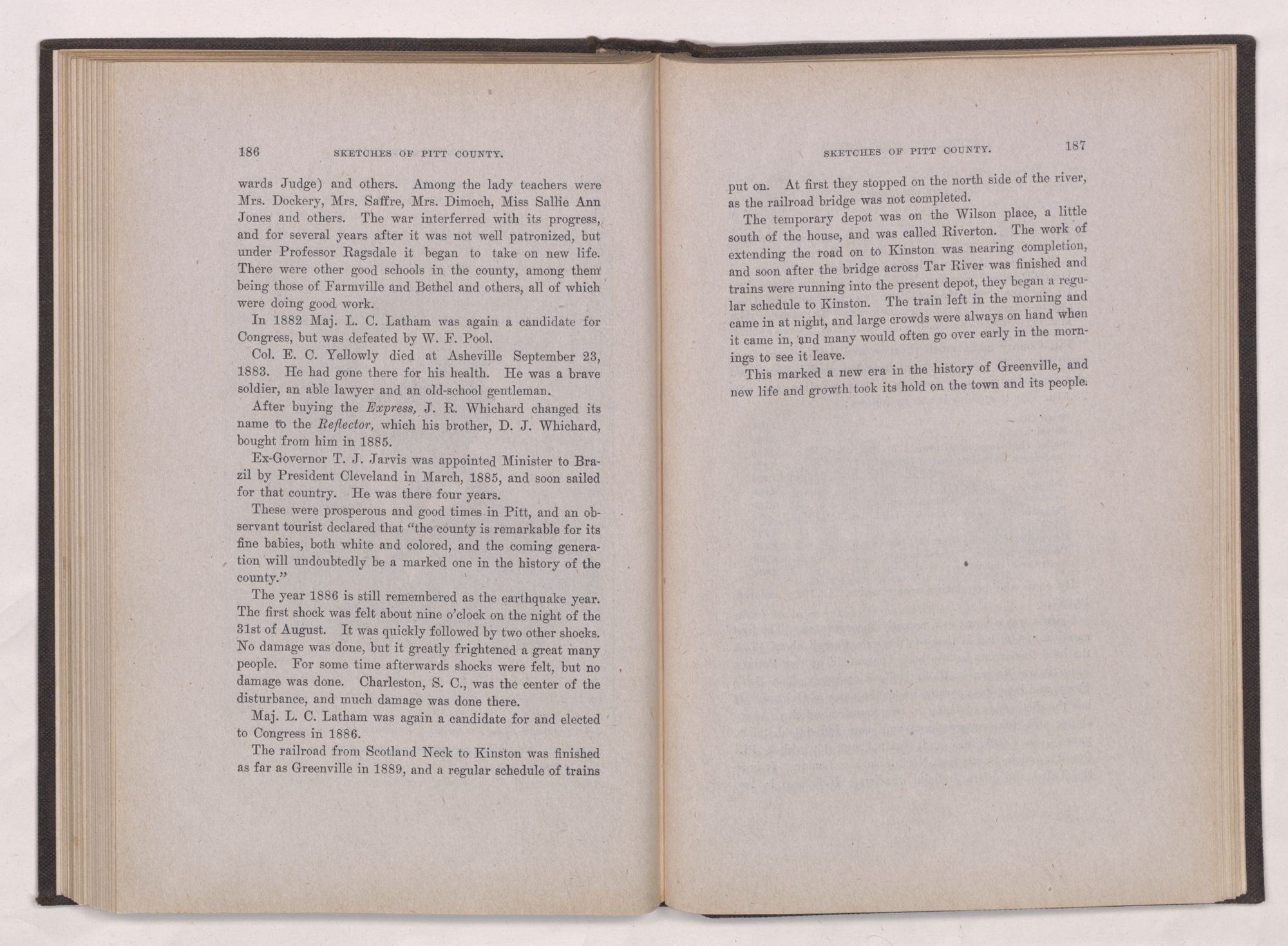 | CHAPTER THIRTY-NINE. Tenth Census—County Towns—Education—Evolutions of the Old Male Academy—Prominent Teachers—Latham Defeated—Yellowly Dead—Jarvis Minister to Brazil—Fine Babies—Earthquake—Latham Elected—Railroad | 183 |