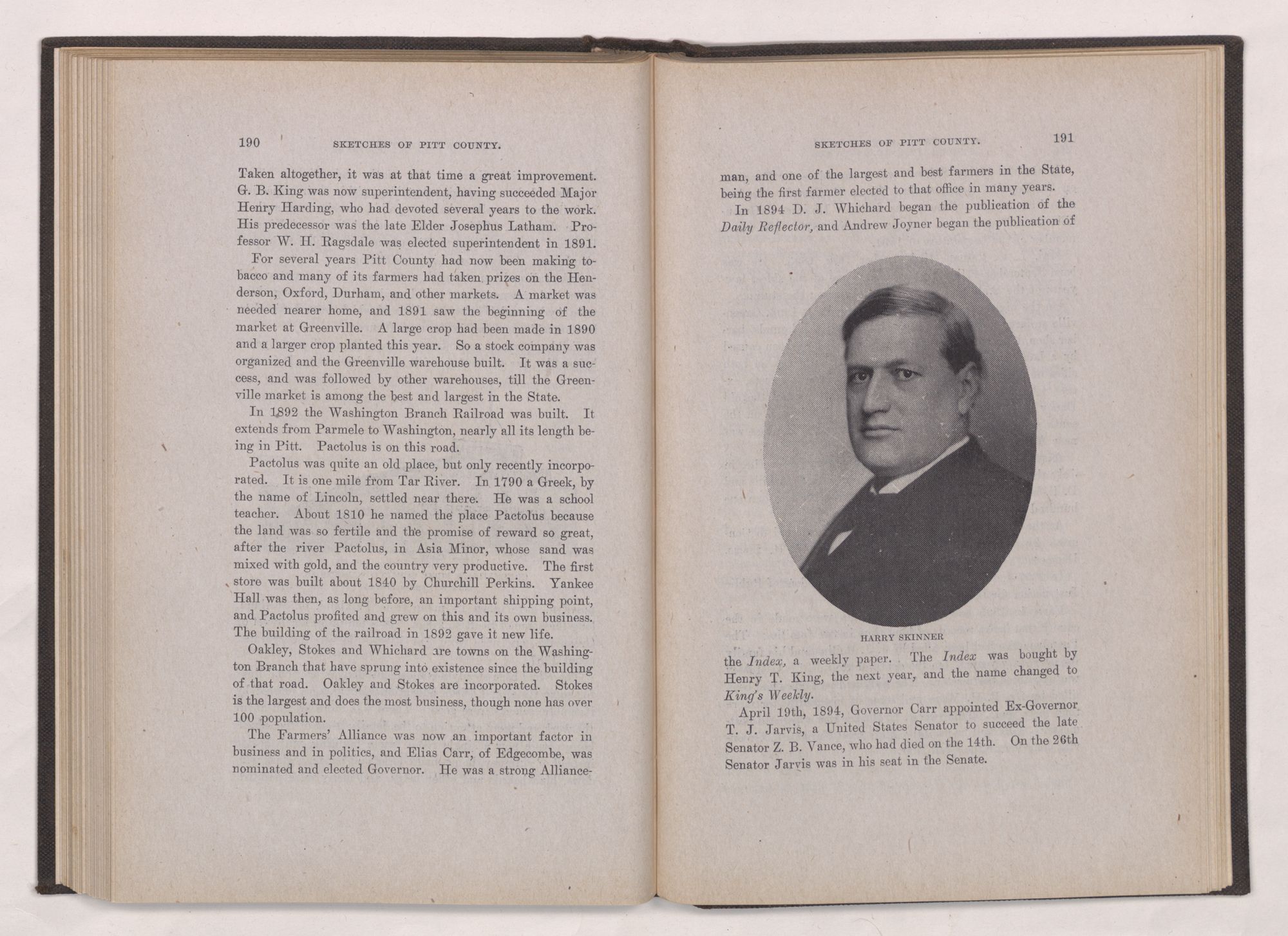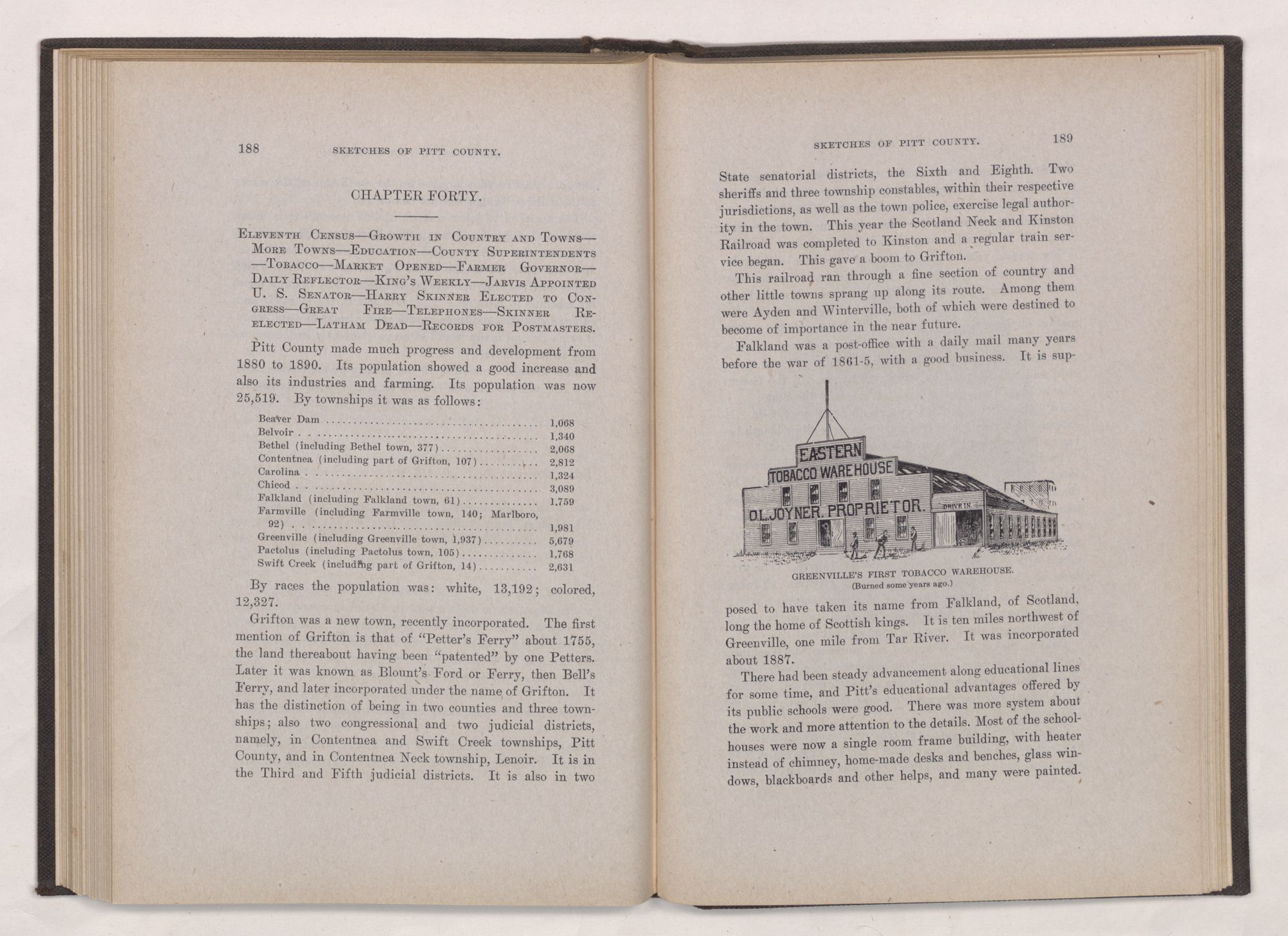 | CHAPTER FORTY. Eleventh Census—Growth in Country and Towns—More Towns—Education—County Superintendents—Tobacco—Market Opened—Farmer Governor—Daily Reflector—King's Weekly—Jarvis Appointed U. S. Senator—Harry Skinner Elected to Congress—Great Fire—Telephones—Skinner Re-elected—Latham Dead—Records for Postmasters | 188 |