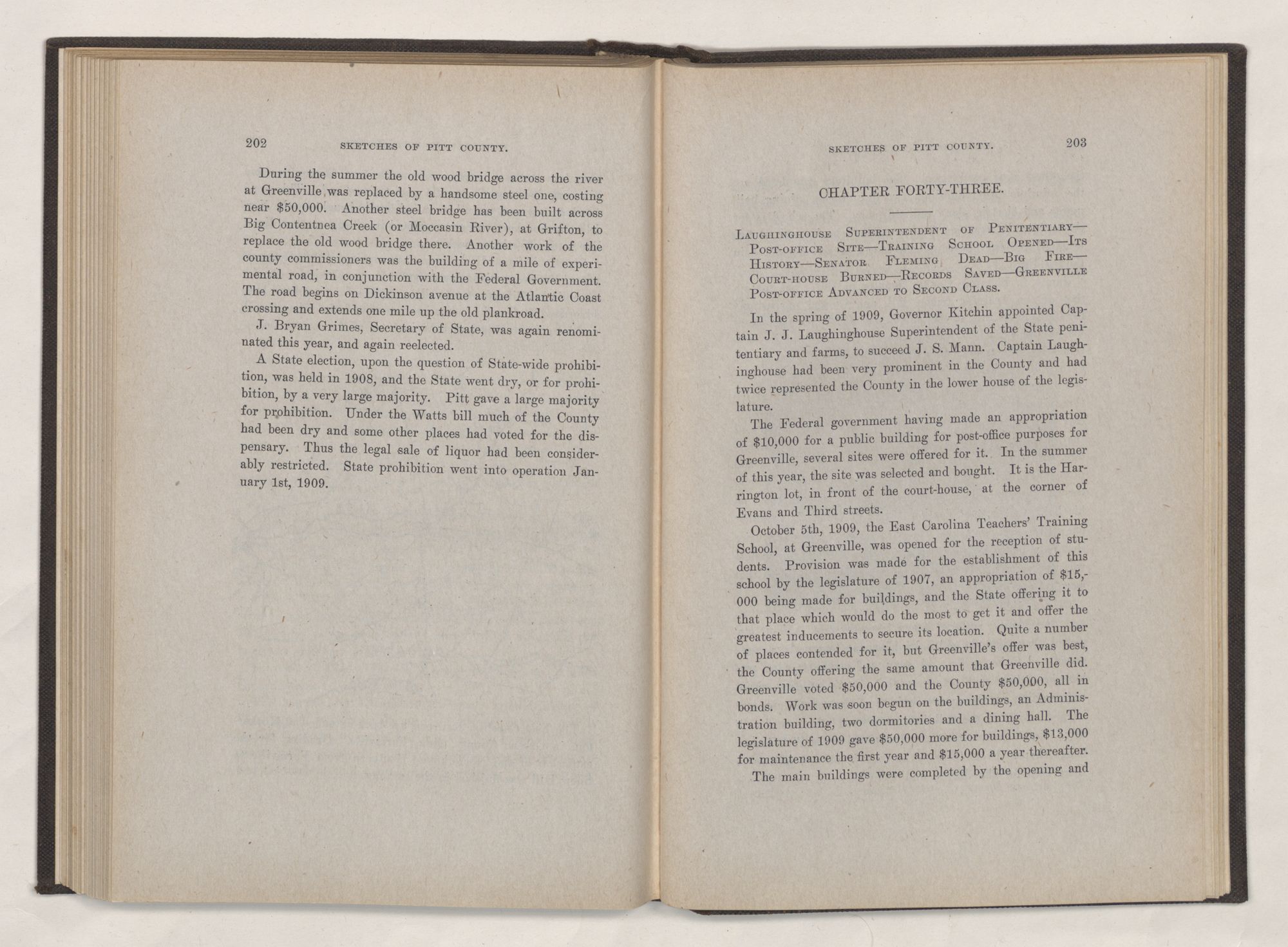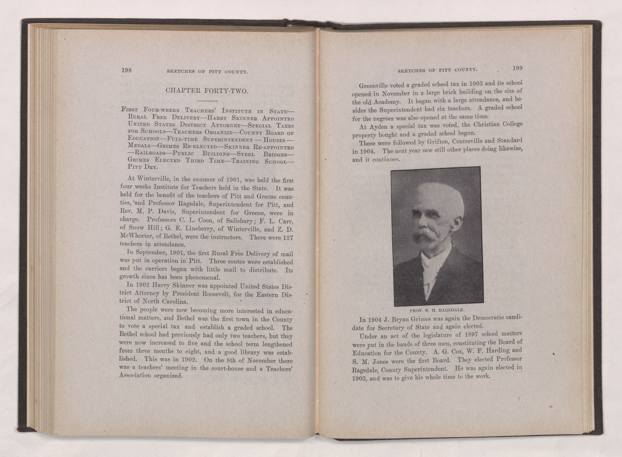 | CHAPTER FORTY-TWO. First Four-weeks Teachers' Institute in State—Rural Free Delivery—Harry Skinner Appointed United States District Attorney—Special Taxes for Schools—Teachers Organize—County Board of Education—Full-time Superintendent — Houses — Medals — Grimes Re-elected—Skinner Re-appointed—Railroads—Public Building—Steel Bridges—Grimes Elected Third Time—Training School—Pitt Dry | 198 |