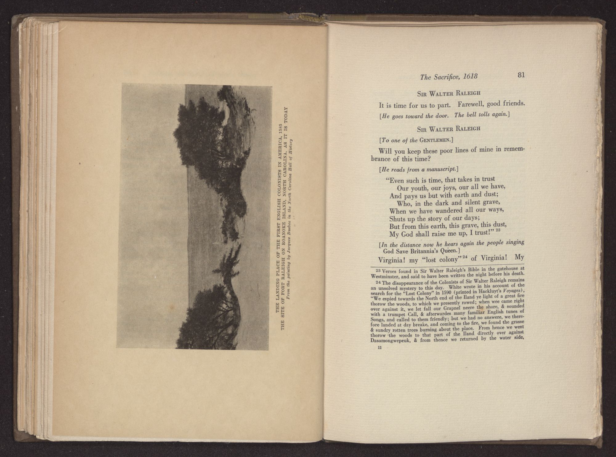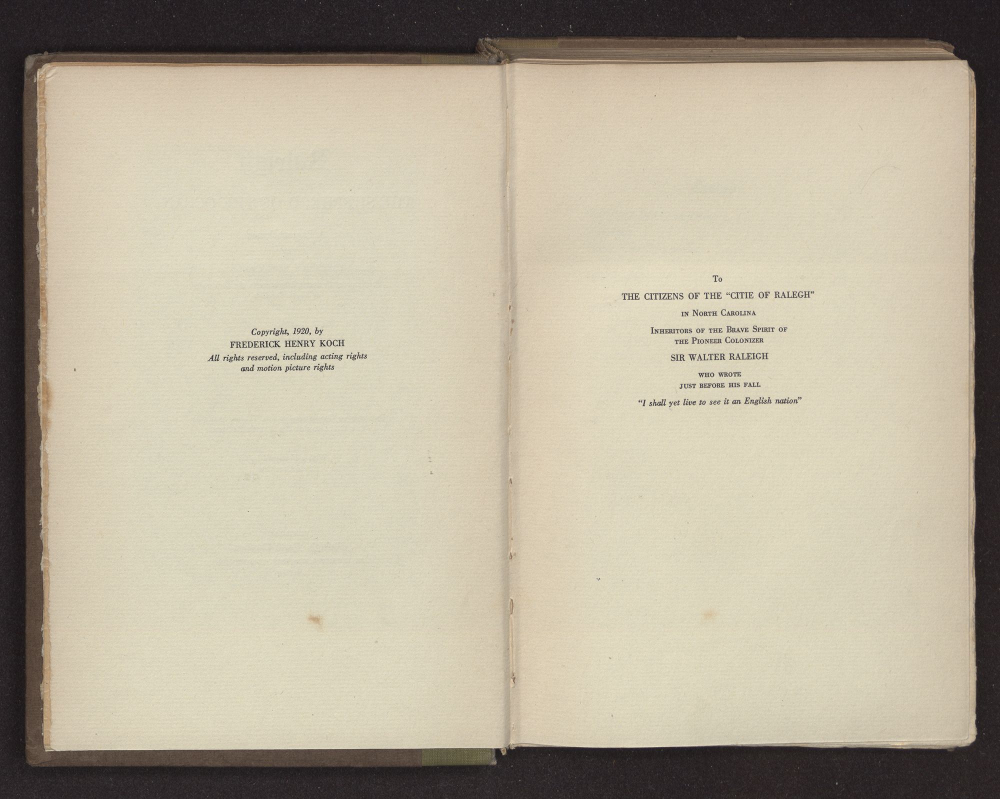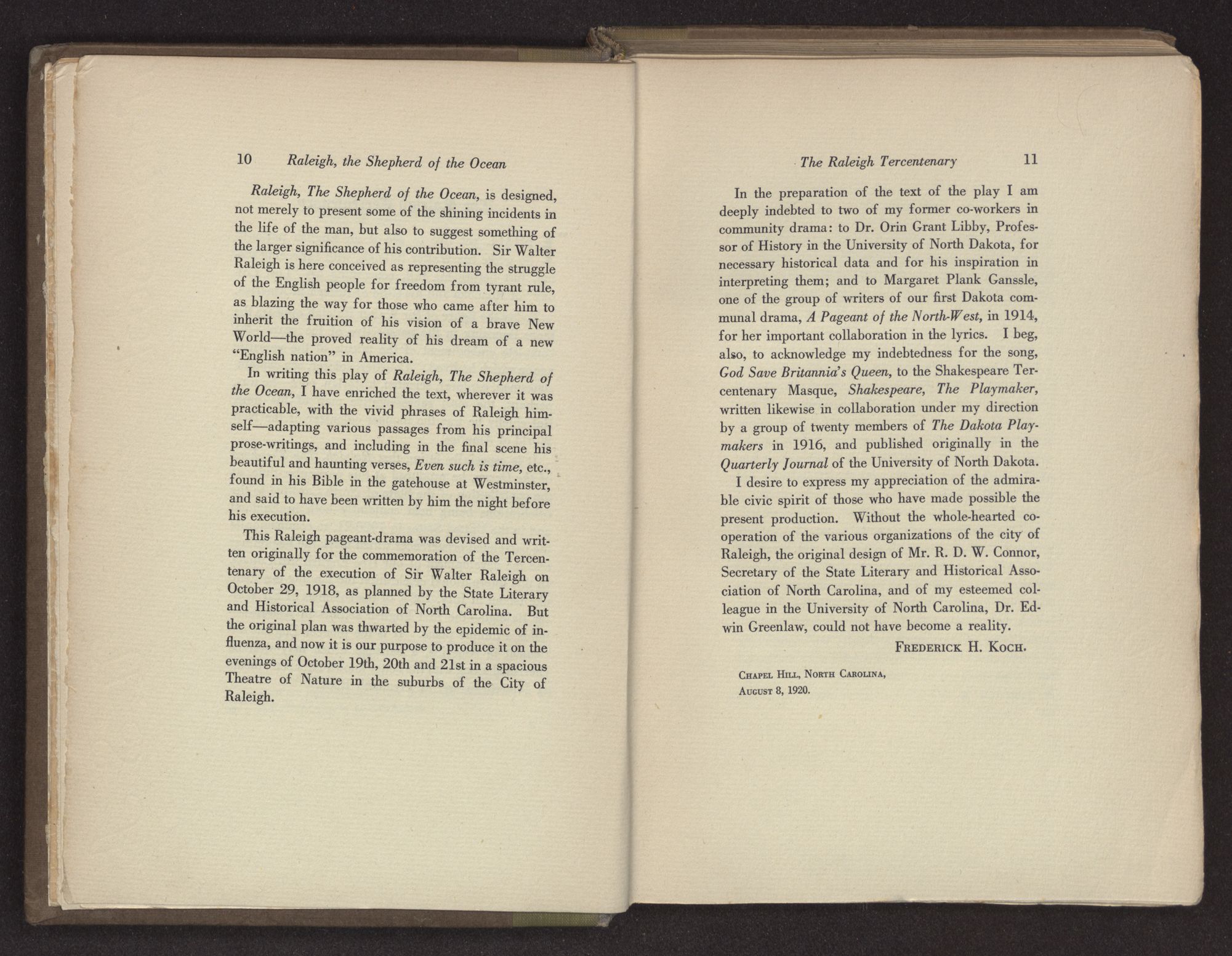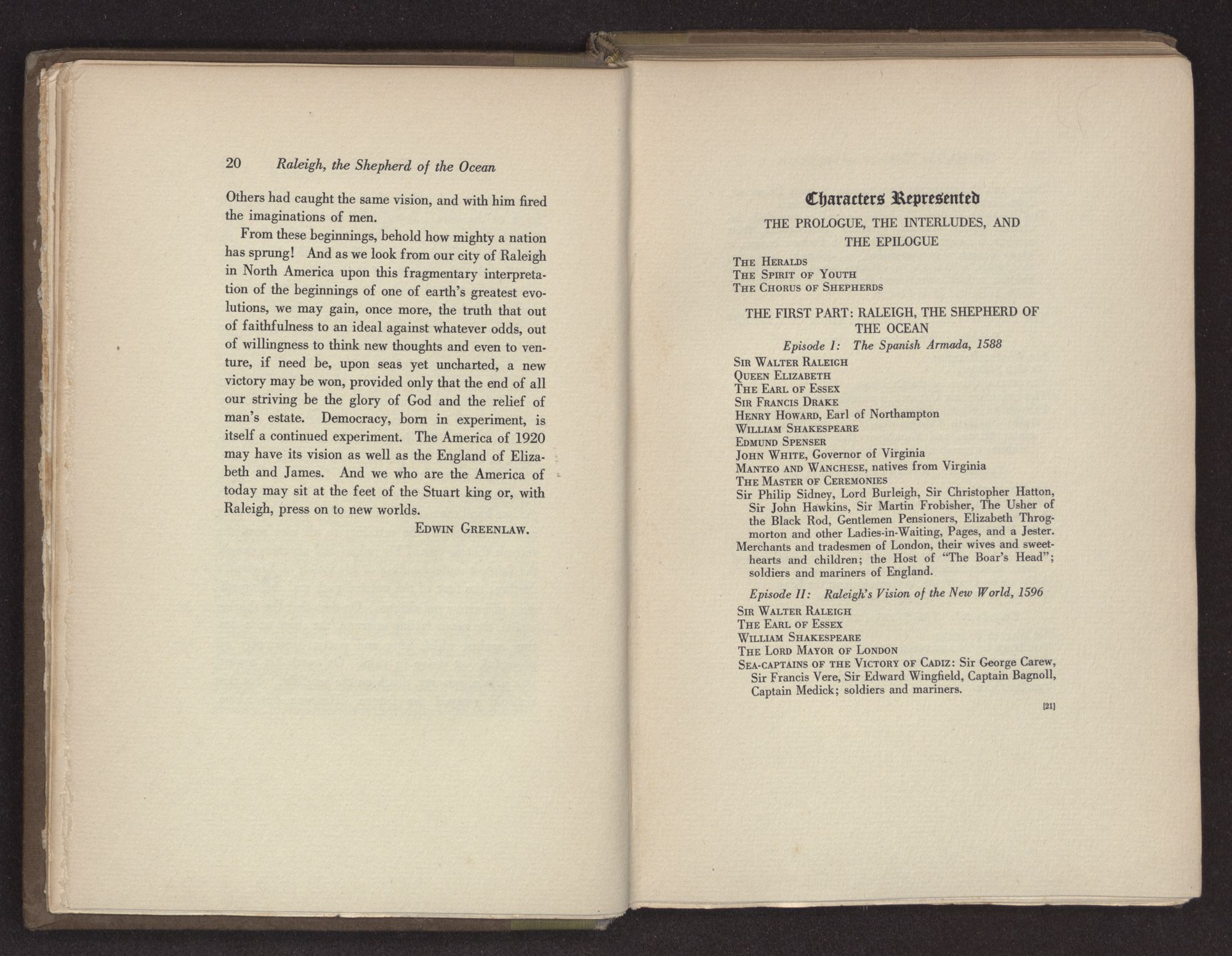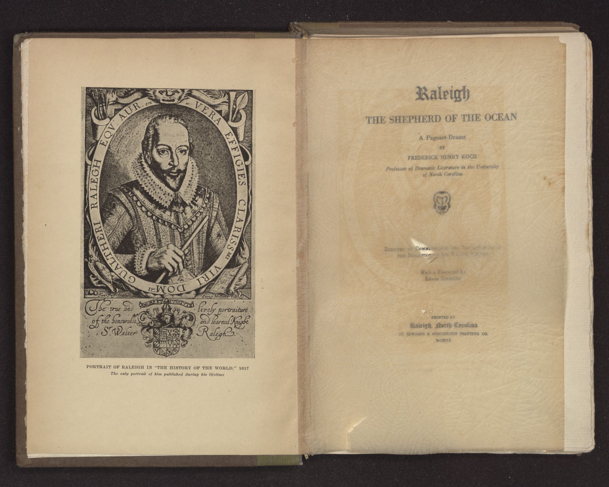 This Raleigh pageant-drama was devised and written originally for the commemoration of the Tercentenary of the execution of Sir Walter Raleigh on October 29, 1918, as planned by the State Literary and Historical Association of North Carolina. But the original plan was thwarted by the epidemic of influenza, and now it is our purpose to produce it on the evenings of October 19th, 20th and 21st in a spacious Theatre of Nature in the suburbs of the City of Raleigh.