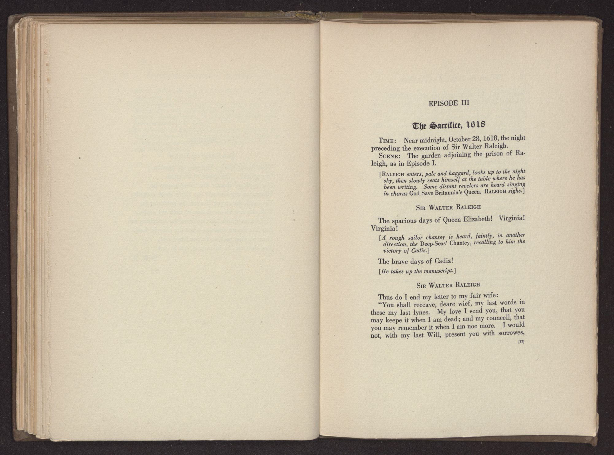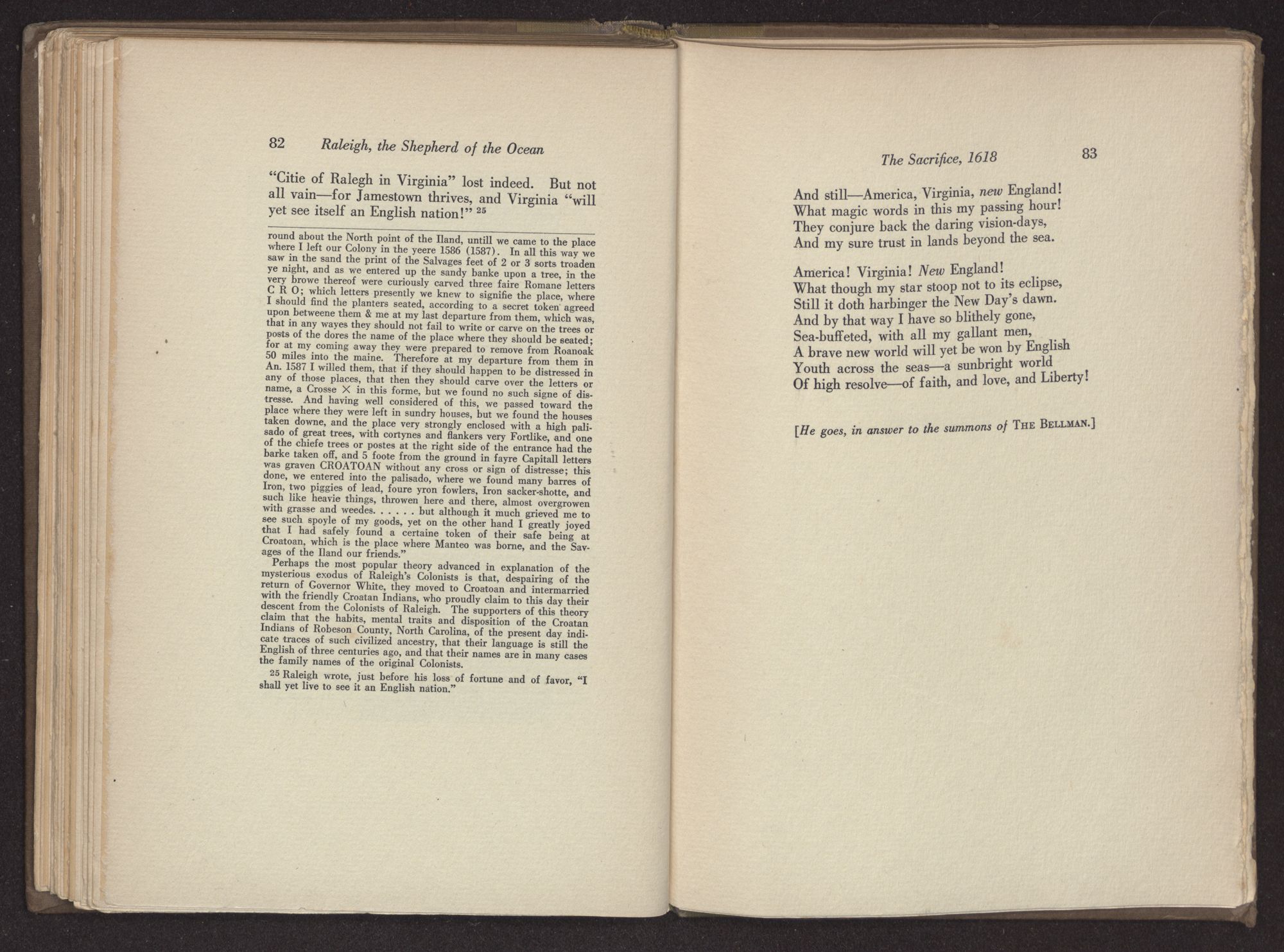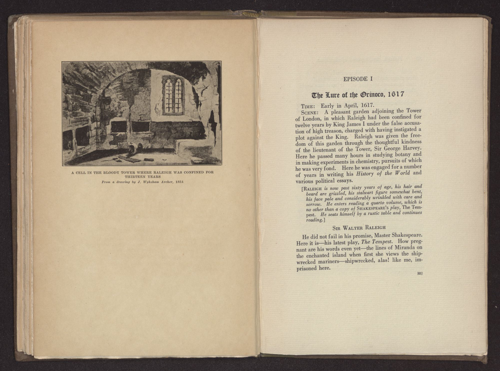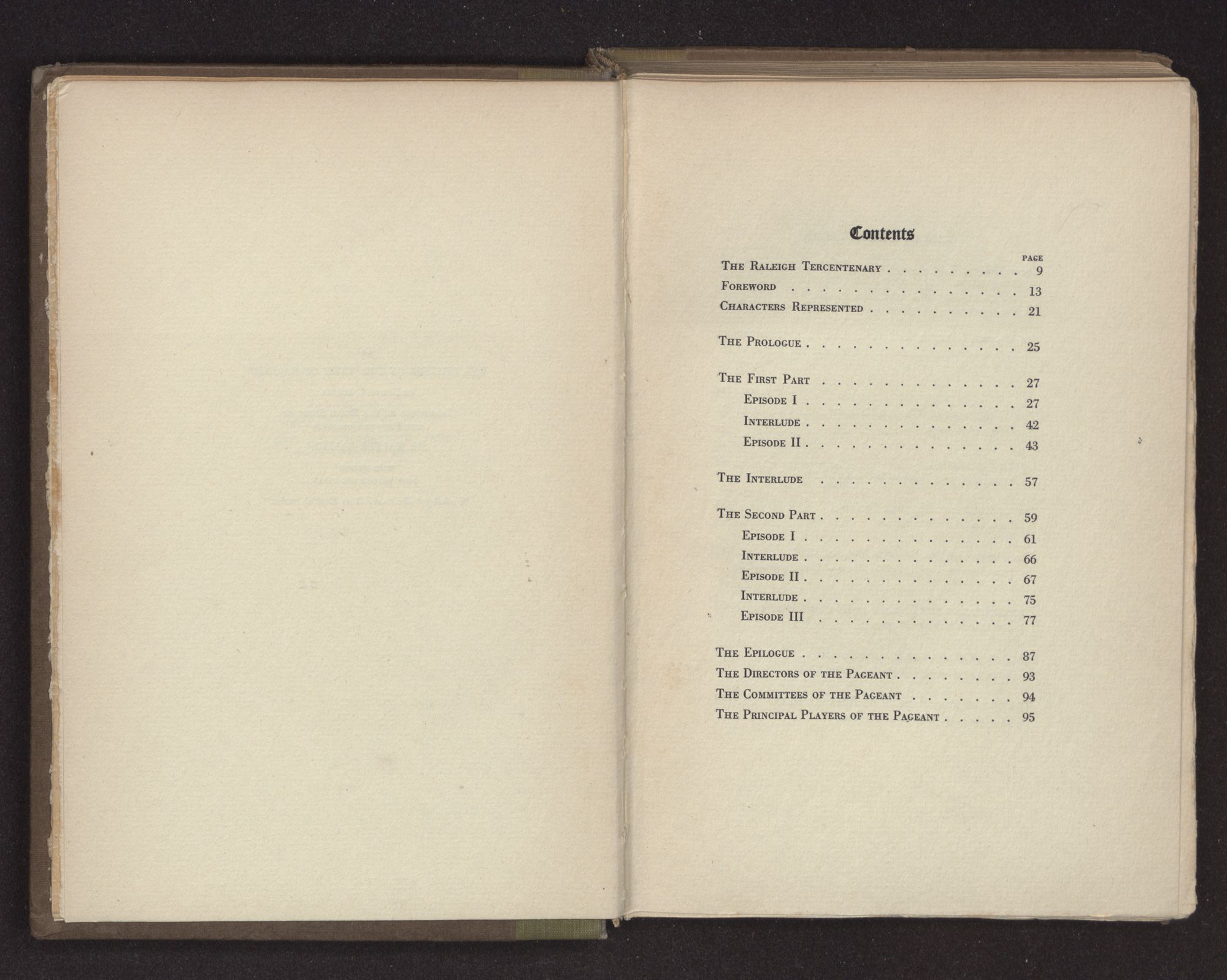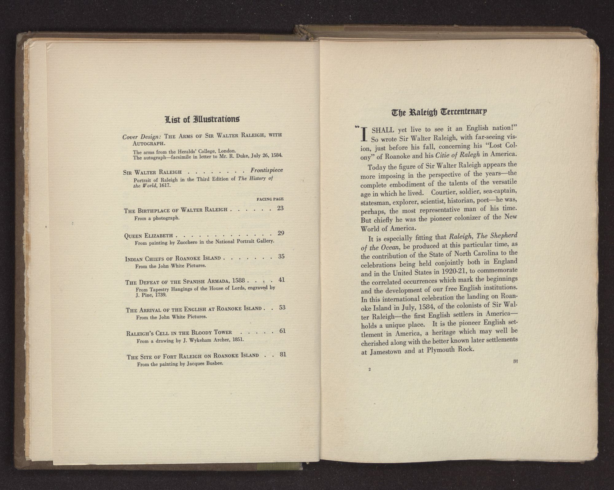 This Raleigh pageant-drama was devised and written originally for the commemoration of the Tercentenary of the execution of Sir Walter Raleigh on October 29, 1918, as planned by the State Literary and Historical Association of North Carolina. But the original plan was thwarted by the epidemic of influenza, and now it is our purpose to produce it on the evenings of October 19th, 20th and 21st in a spacious Theatre of Nature in the suburbs of the City of Raleigh.