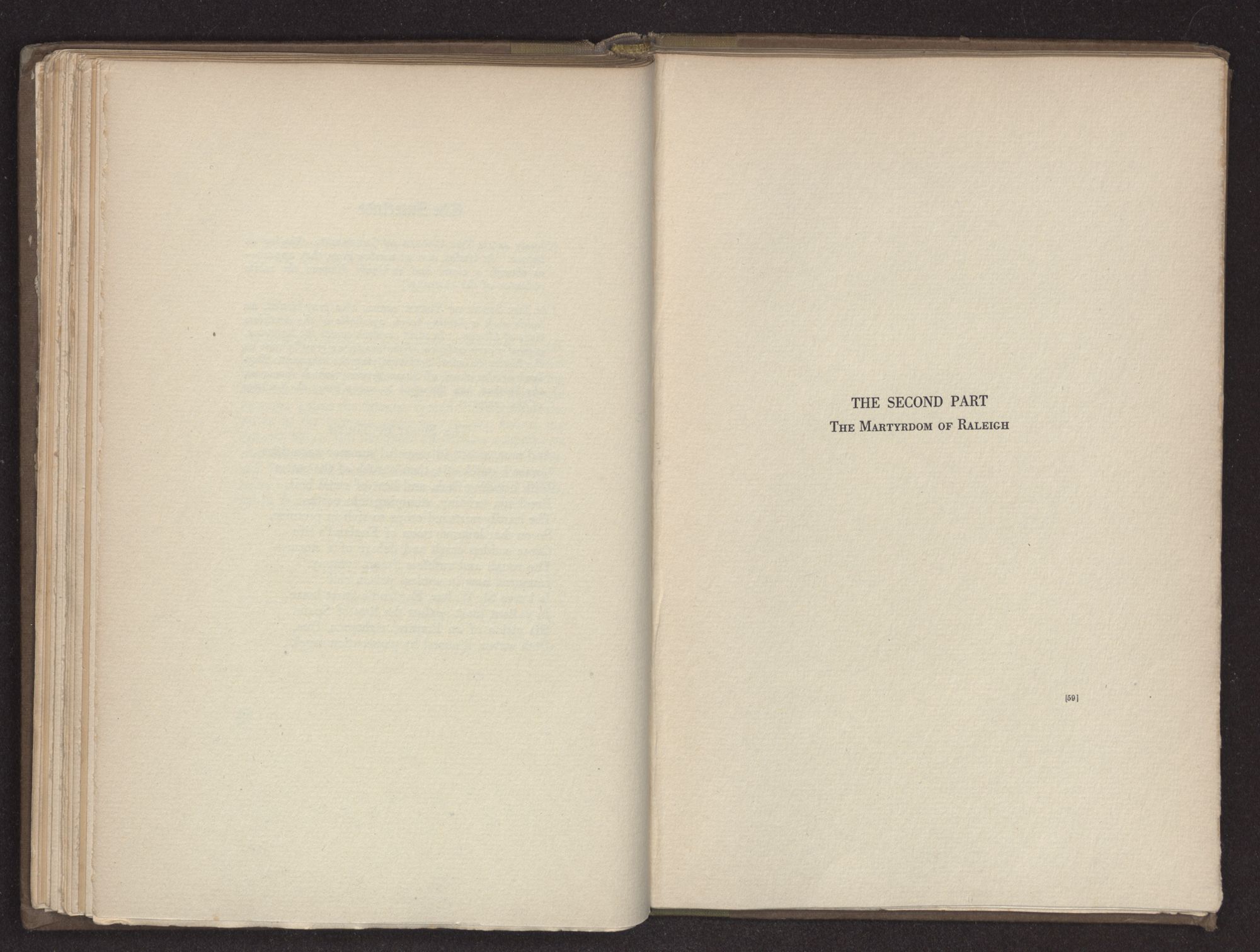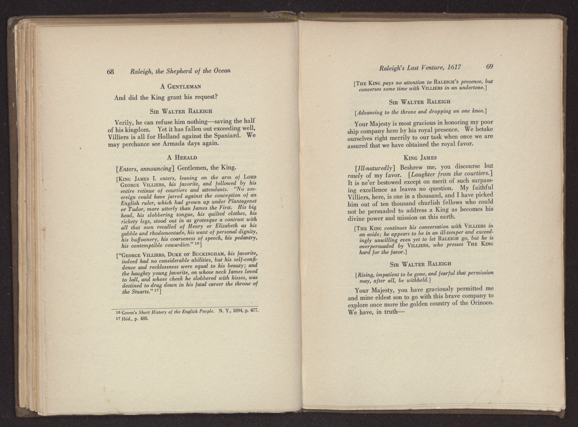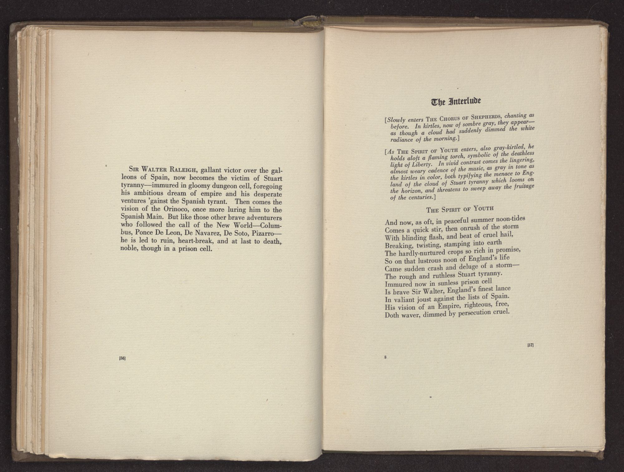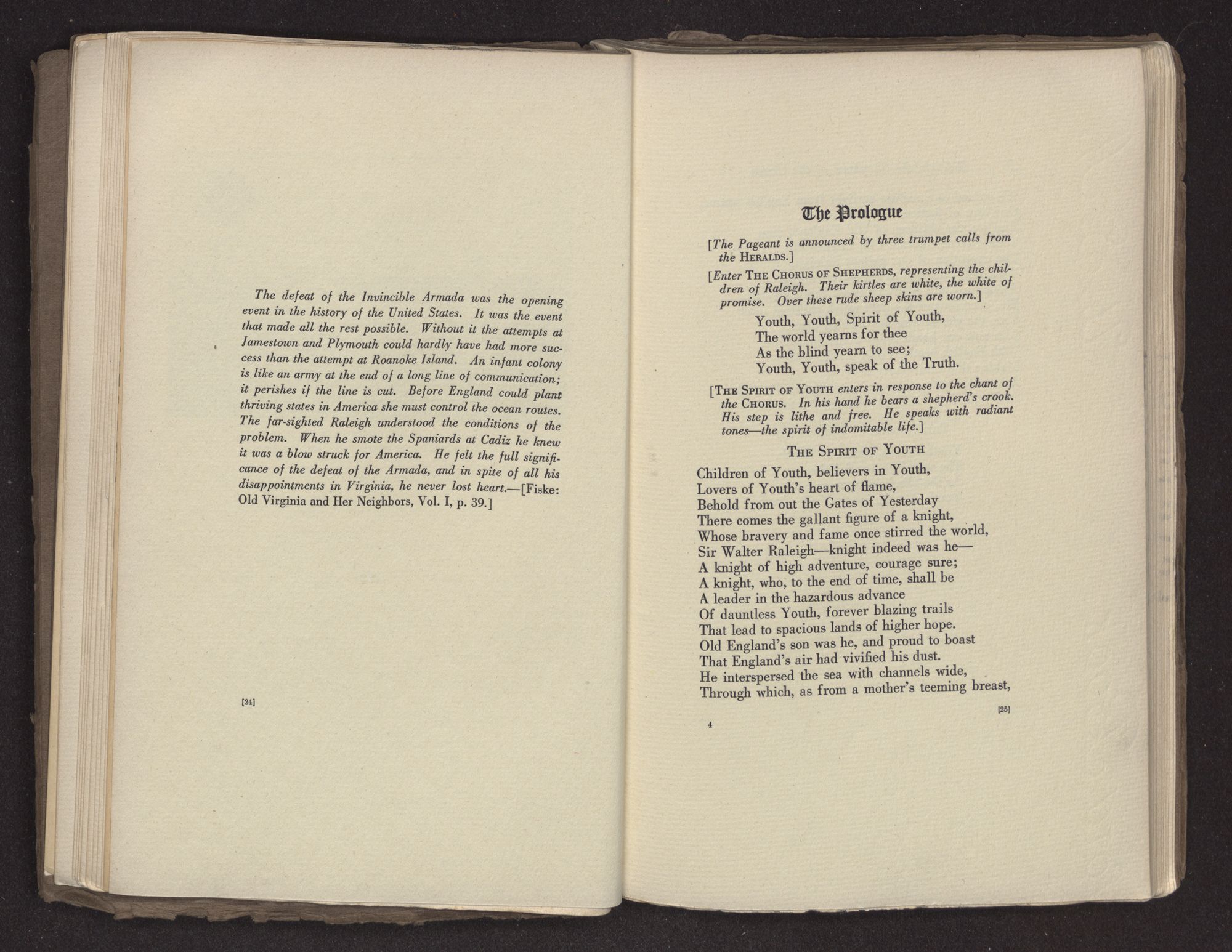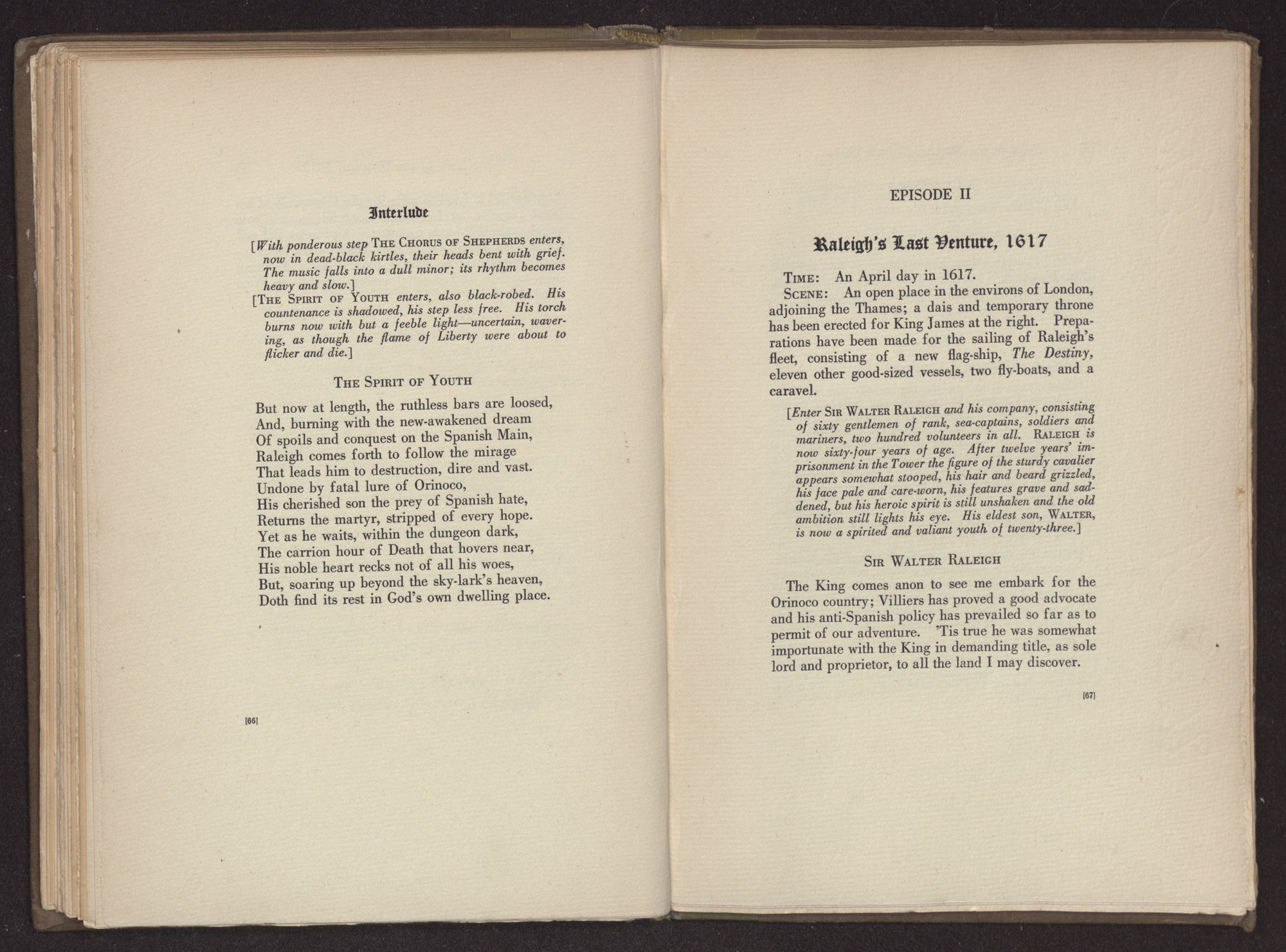 This Raleigh pageant-drama was devised and written originally for the commemoration of the Tercentenary of the execution of Sir Walter Raleigh on October 29, 1918, as planned by the State Literary and Historical Association of North Carolina. But the original plan was thwarted by the epidemic of influenza, and now it is our purpose to produce it on the evenings of October 19th, 20th and 21st in a spacious Theatre of Nature in the suburbs of the City of Raleigh.
