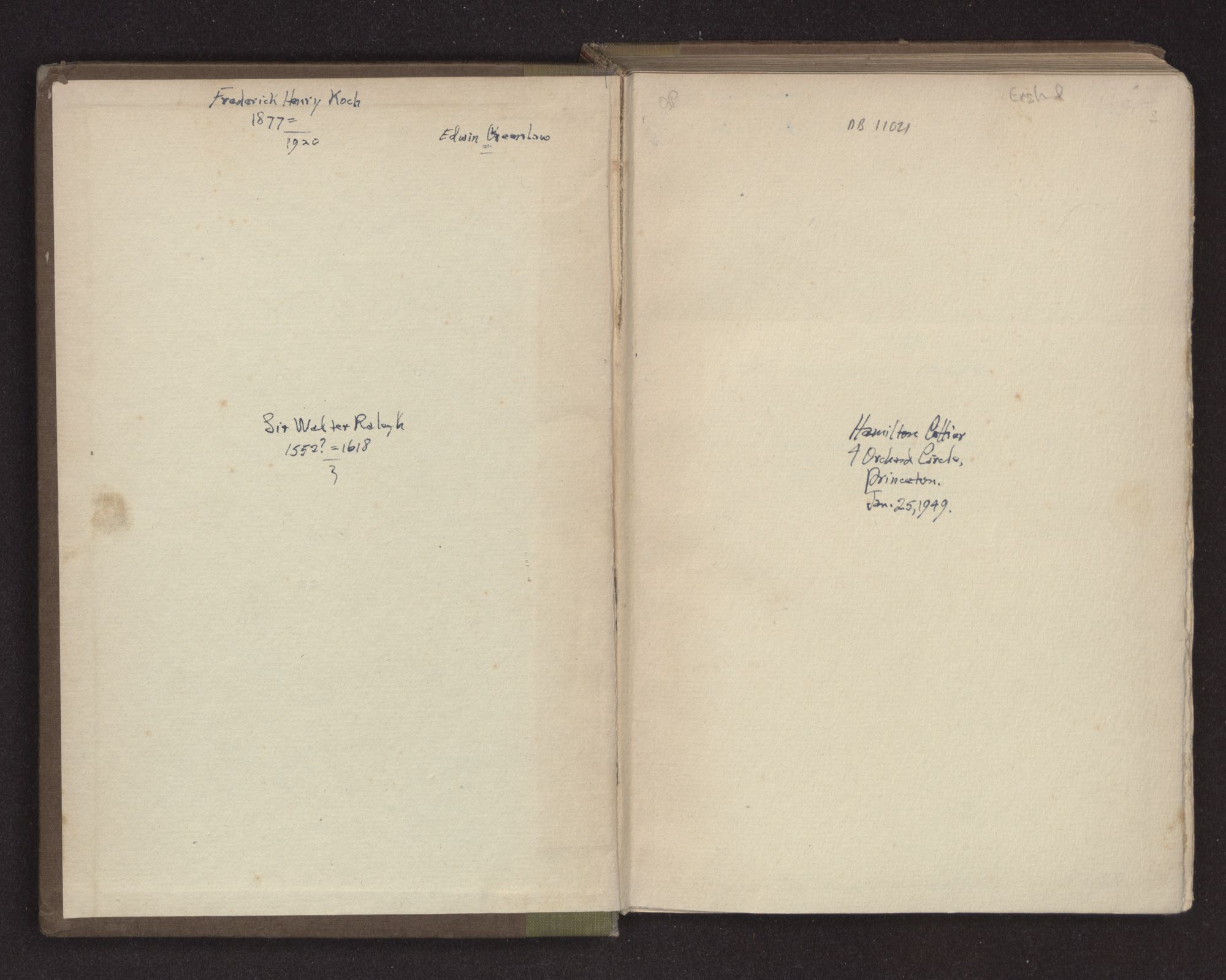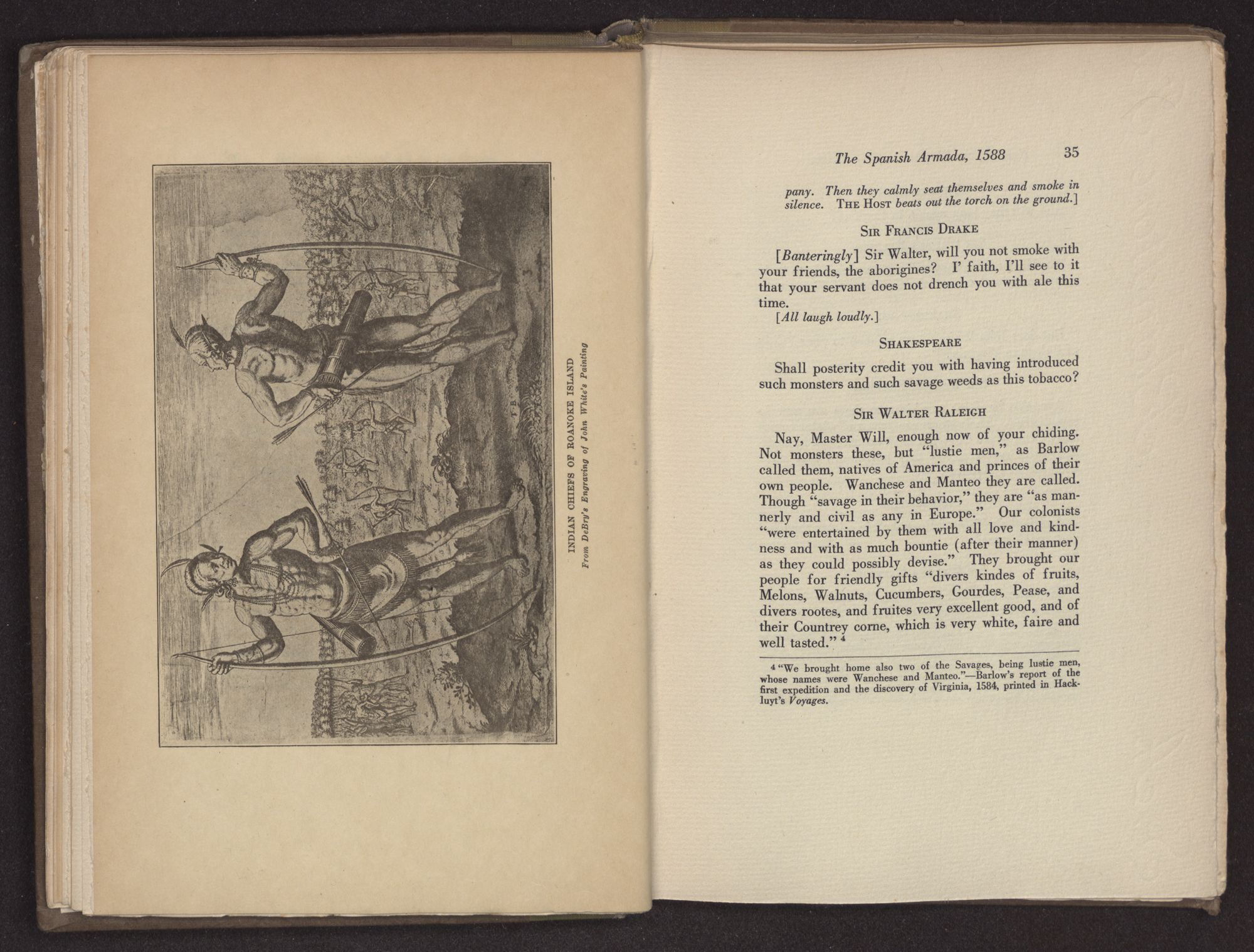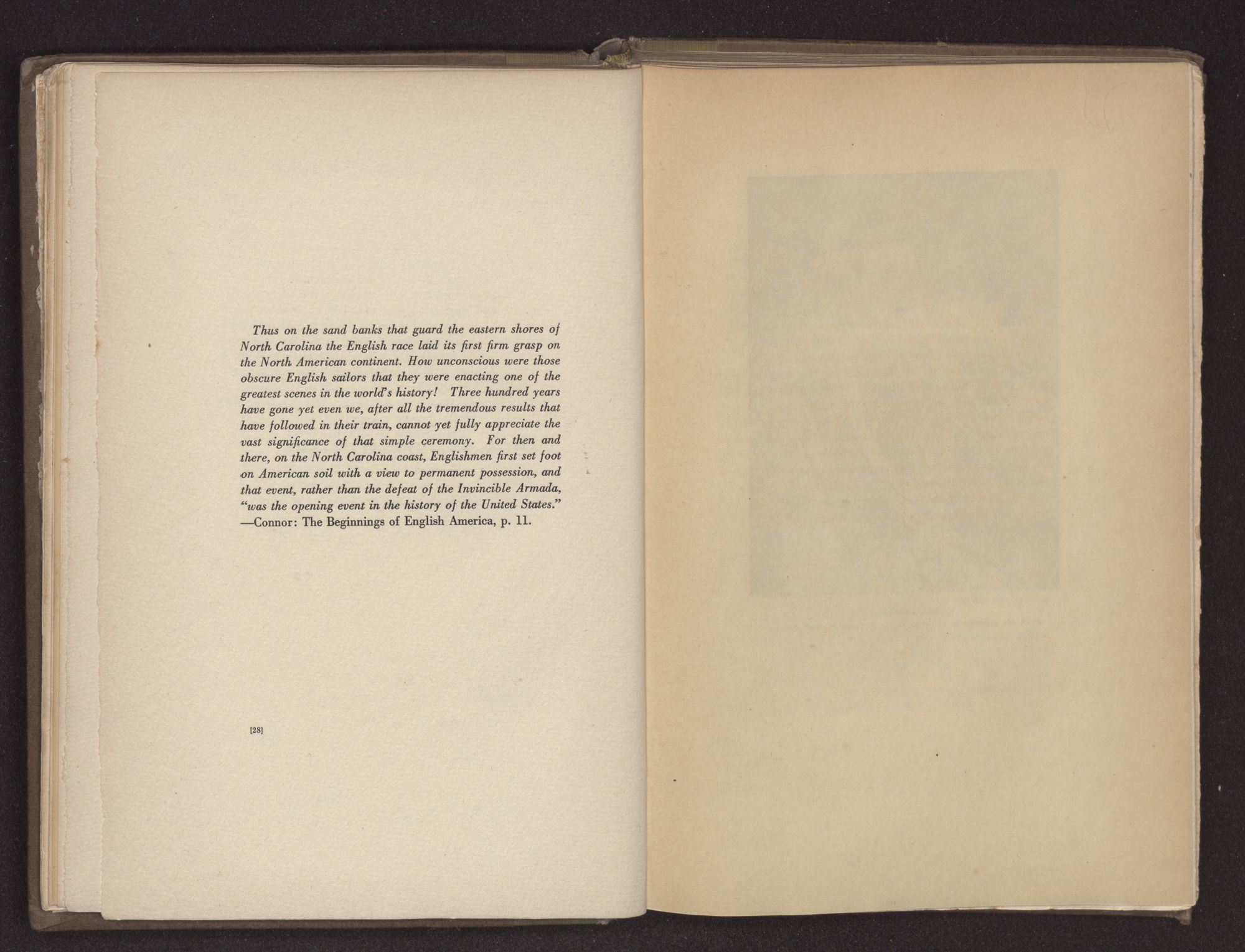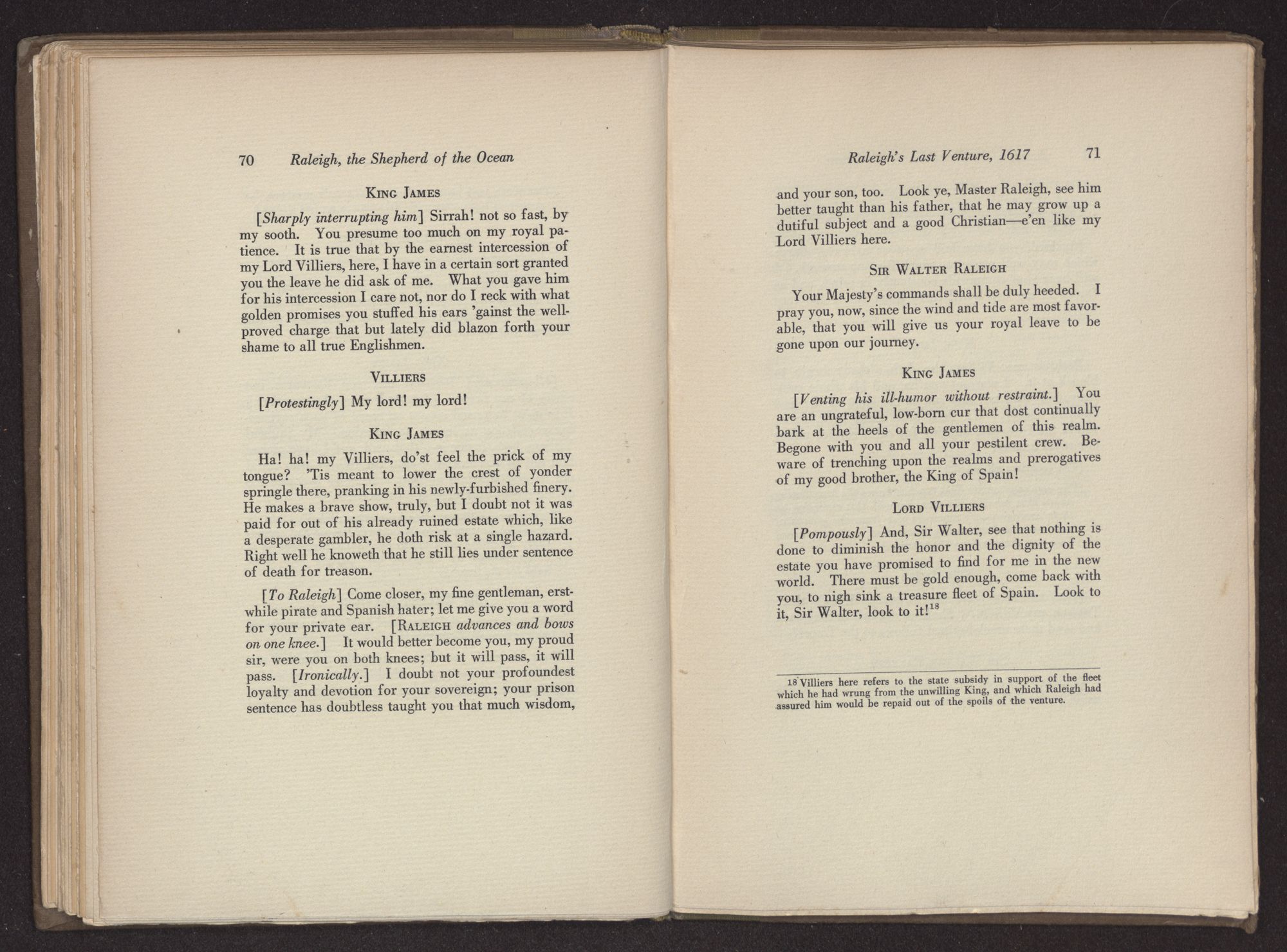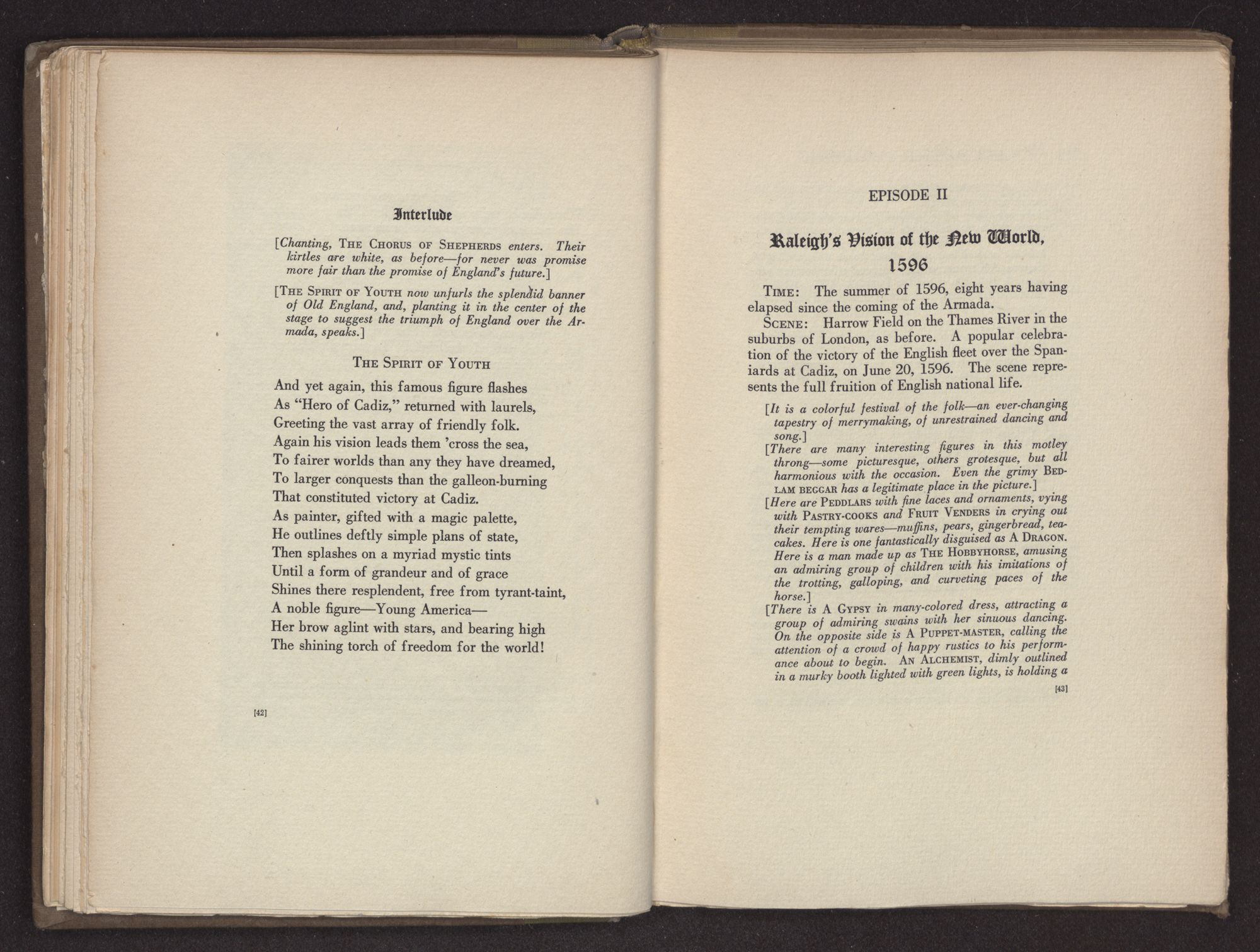 This Raleigh pageant-drama was devised and written originally for the commemoration of the Tercentenary of the execution of Sir Walter Raleigh on October 29, 1918, as planned by the State Literary and Historical Association of North Carolina. But the original plan was thwarted by the epidemic of influenza, and now it is our purpose to produce it on the evenings of October 19th, 20th and 21st in a spacious Theatre of Nature in the suburbs of the City of Raleigh.