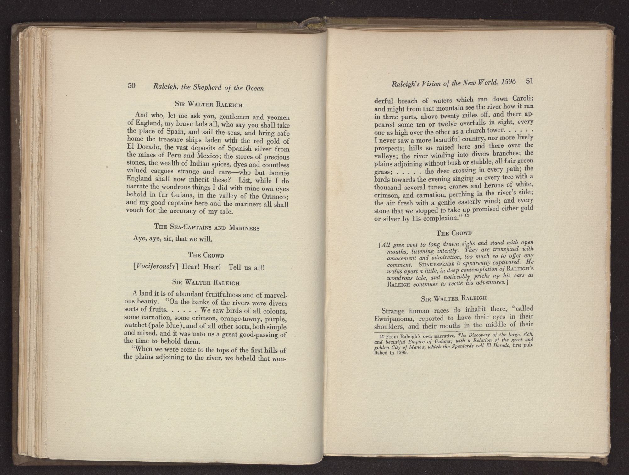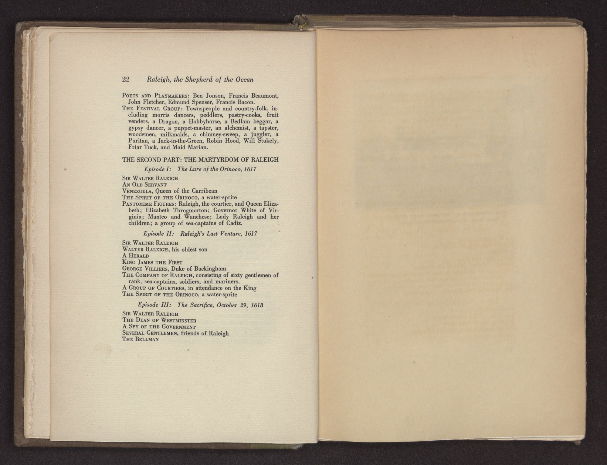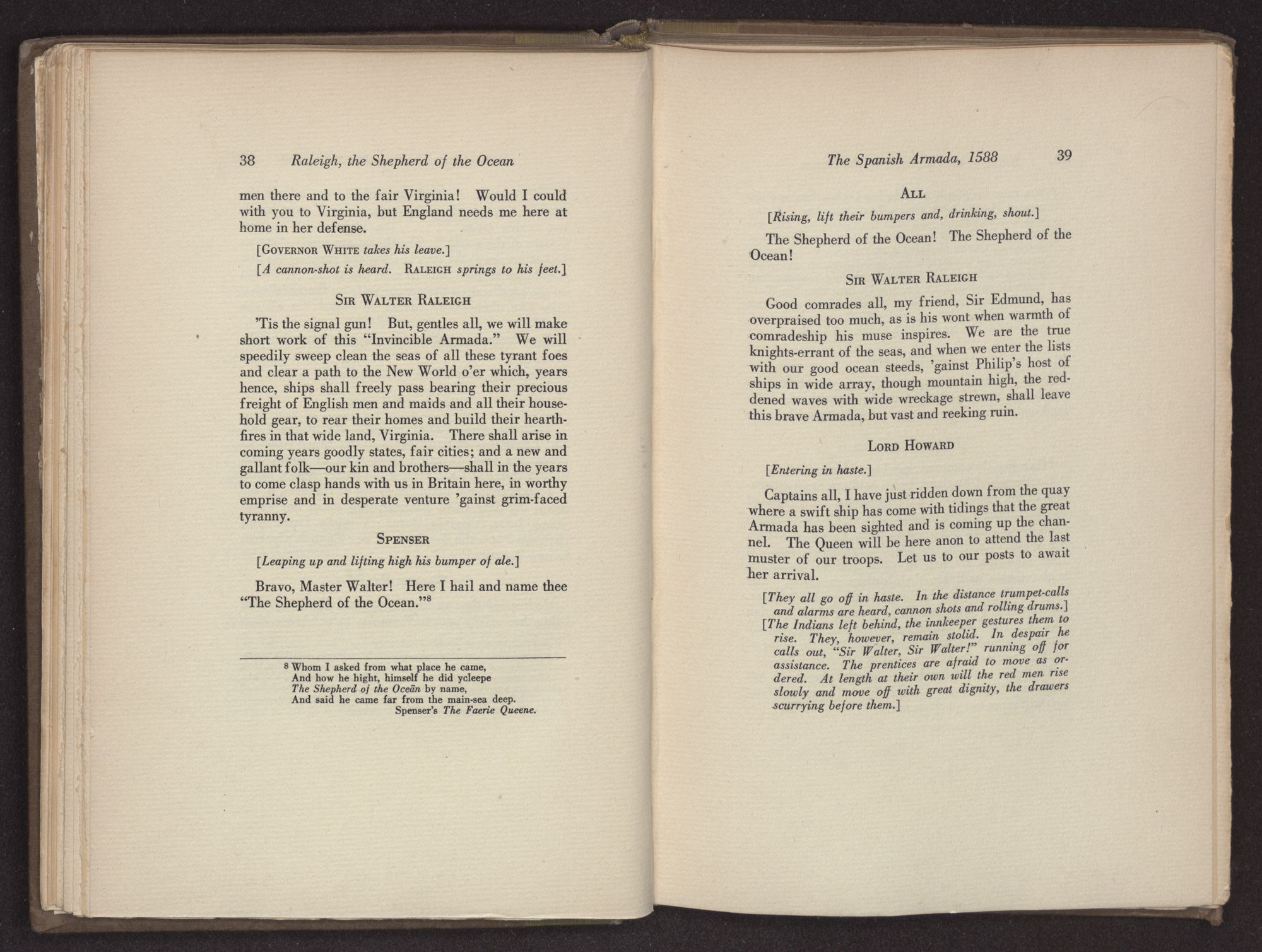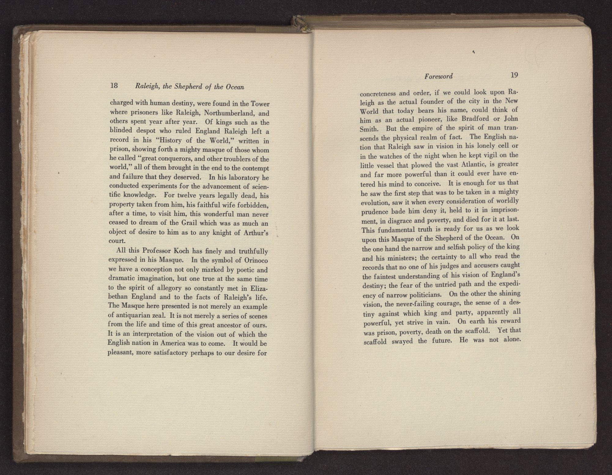Raleigh, The Shepherd of the Ocean, is designed, not merely to present some of the shining incidents in the life of the man, but also to suggest something of the larger significance of his contribution. Sir Walter Raleigh is here conceived as representing the struggle of the English people for freedom from tyrant rule, as blazing the way for those who came after him to inherit the fruition of his vision of a brave New World—the proved reality of his dream of a new “English nation” in America.