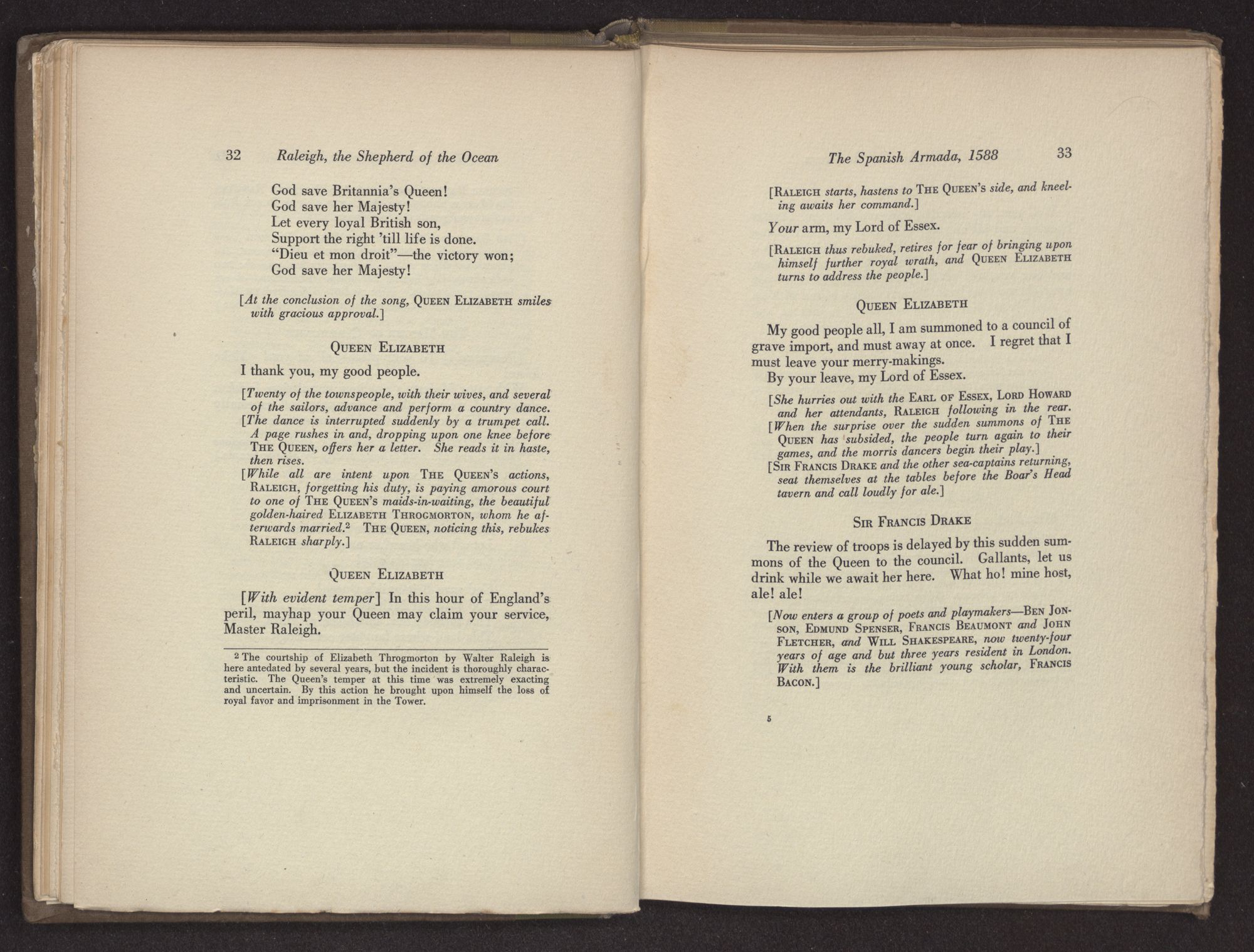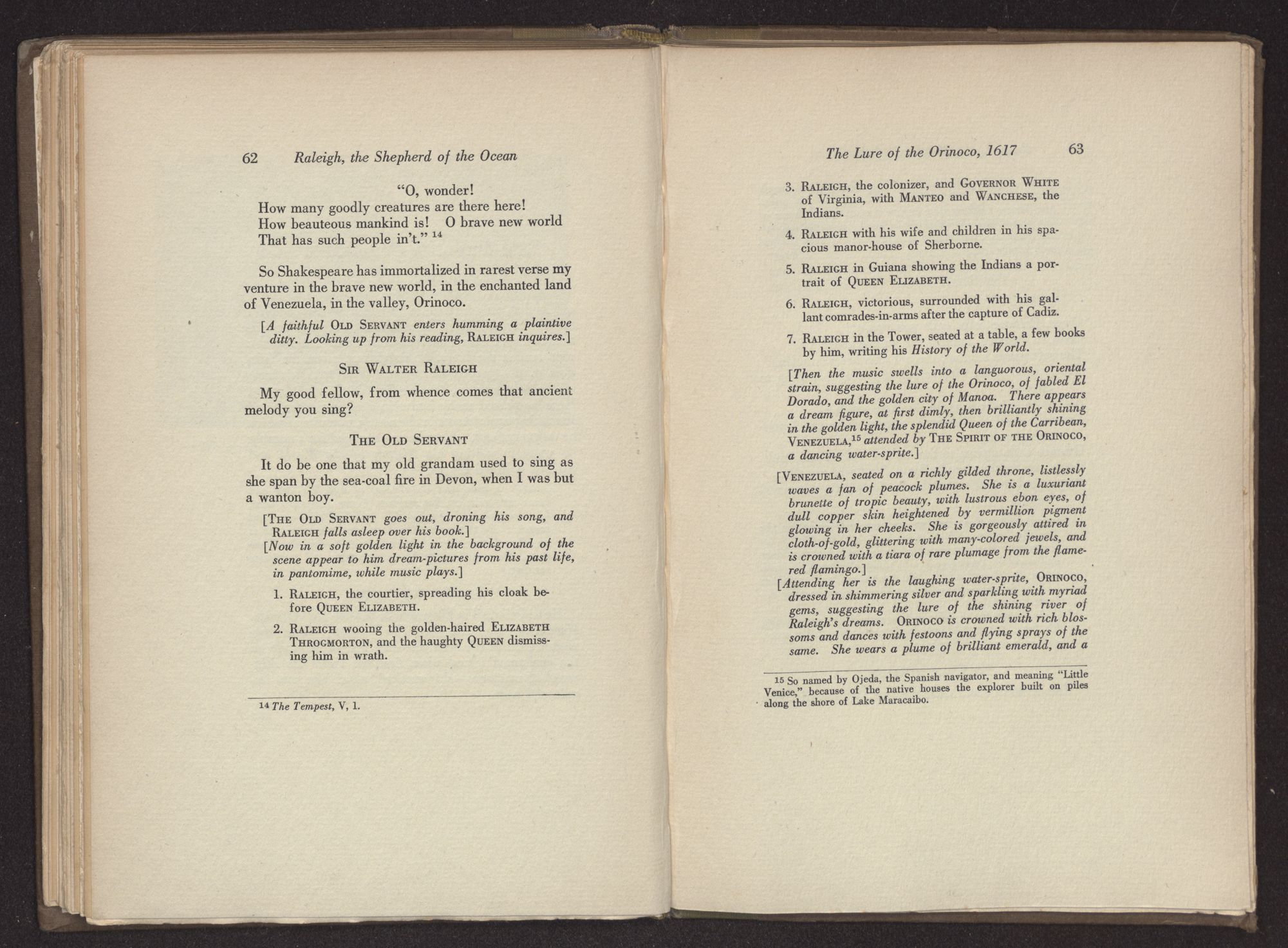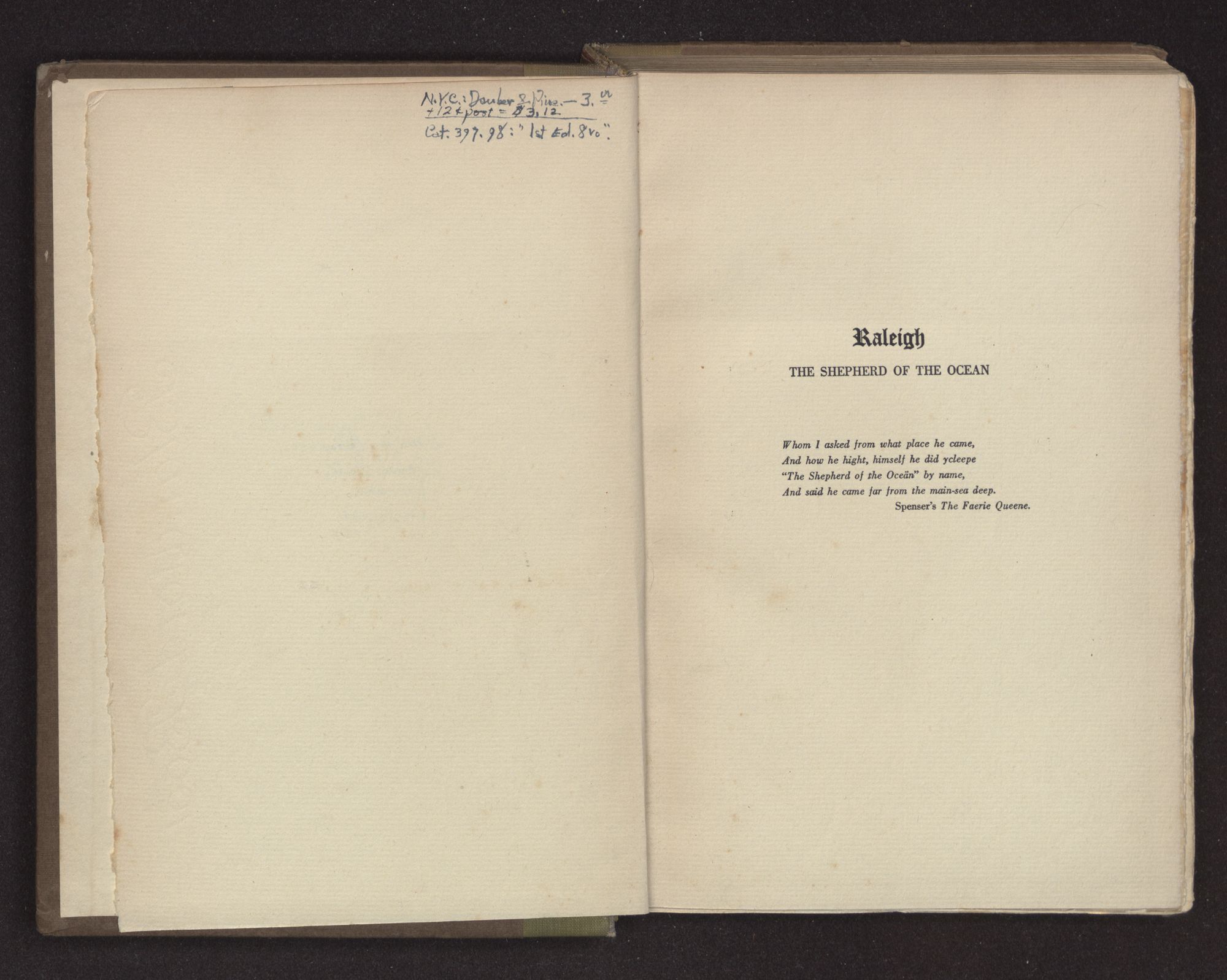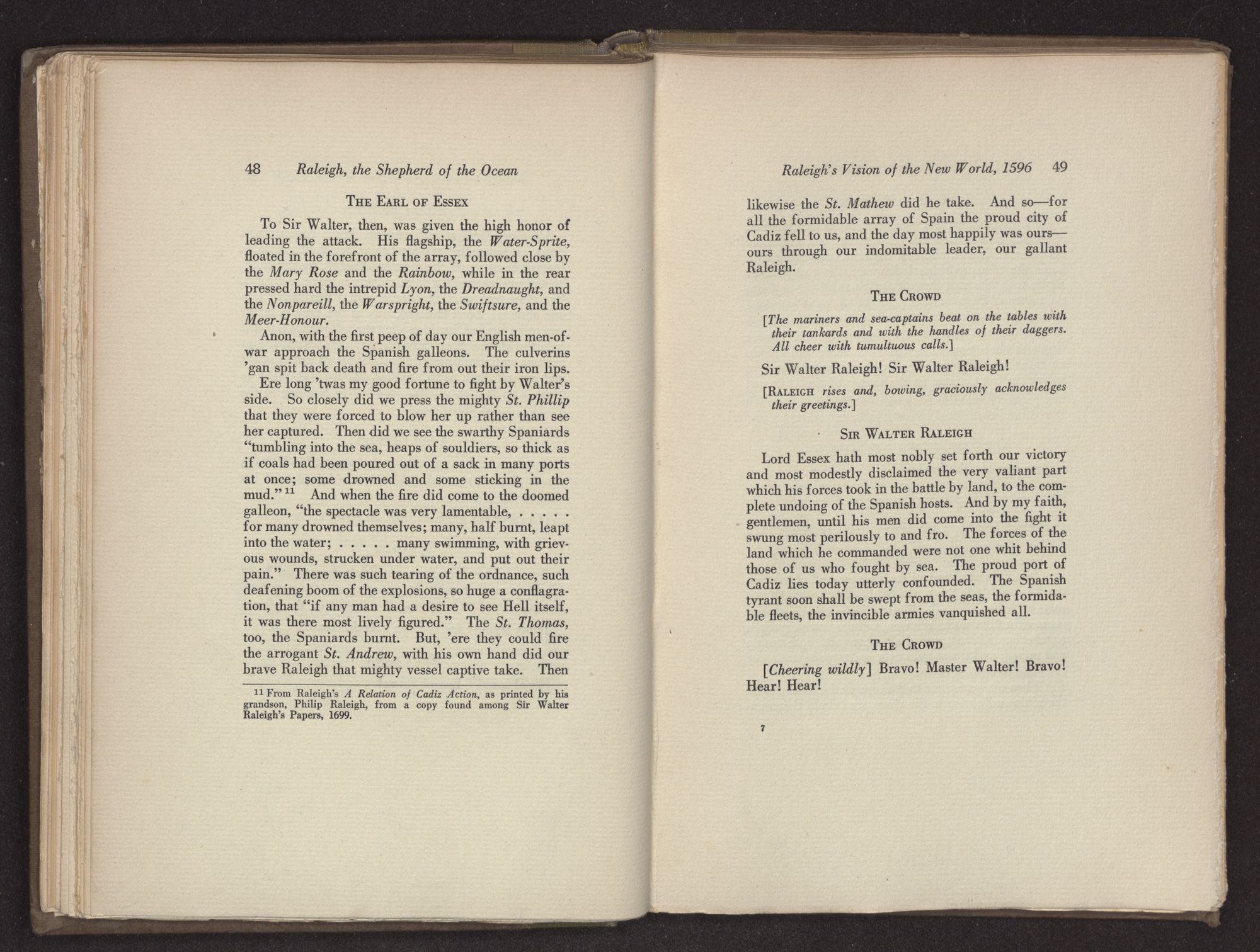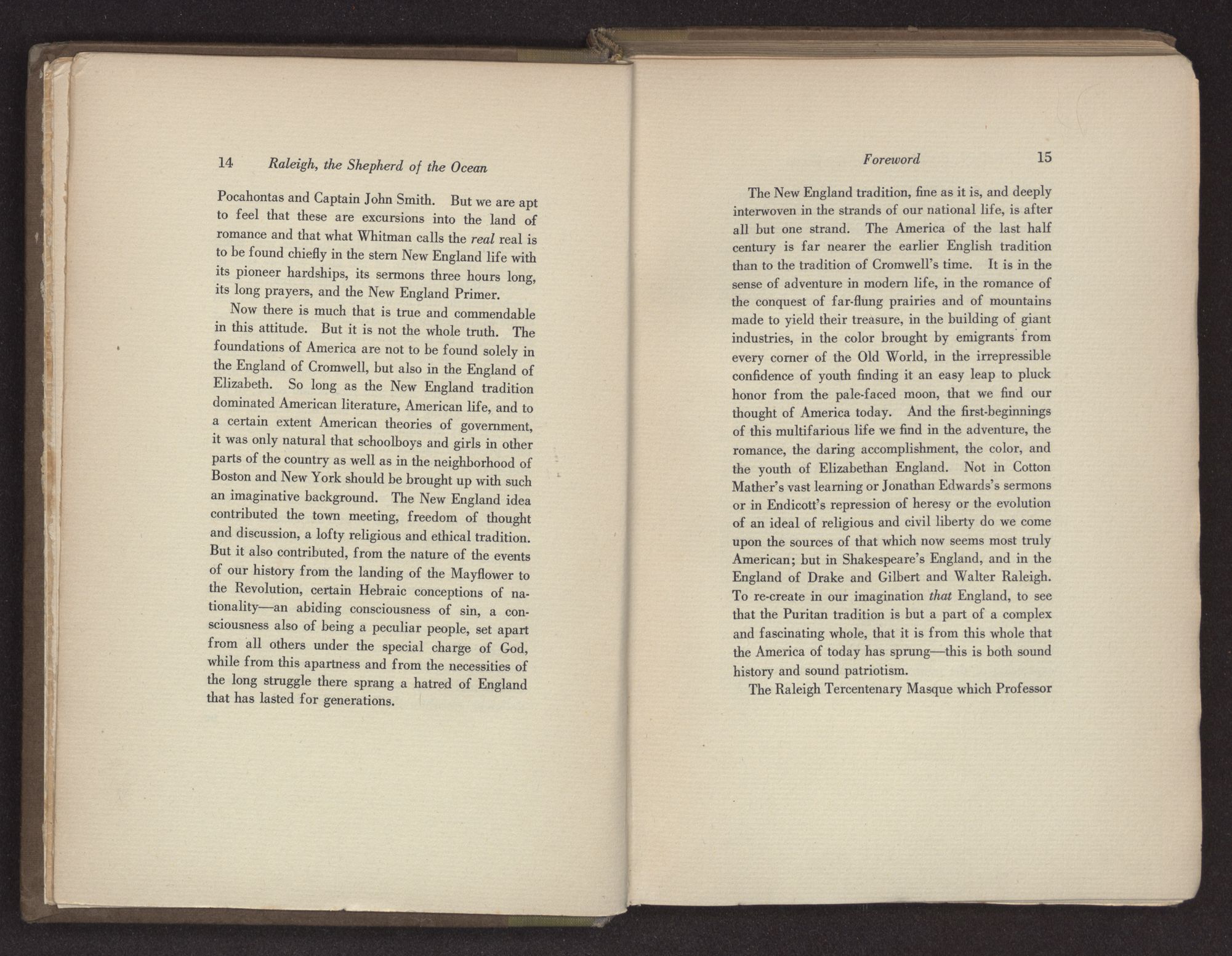 Raleigh, The Shepherd of the Ocean, is designed, not merely to present some of the shining incidents in the life of the man, but also to suggest something of the larger significance of his contribution. Sir Walter Raleigh is here conceived as representing the struggle of the English people for freedom from tyrant rule, as blazing the way for those who came after him to inherit the fruition of his vision of a brave New World—the proved reality of his dream of a new “English nation” in America.