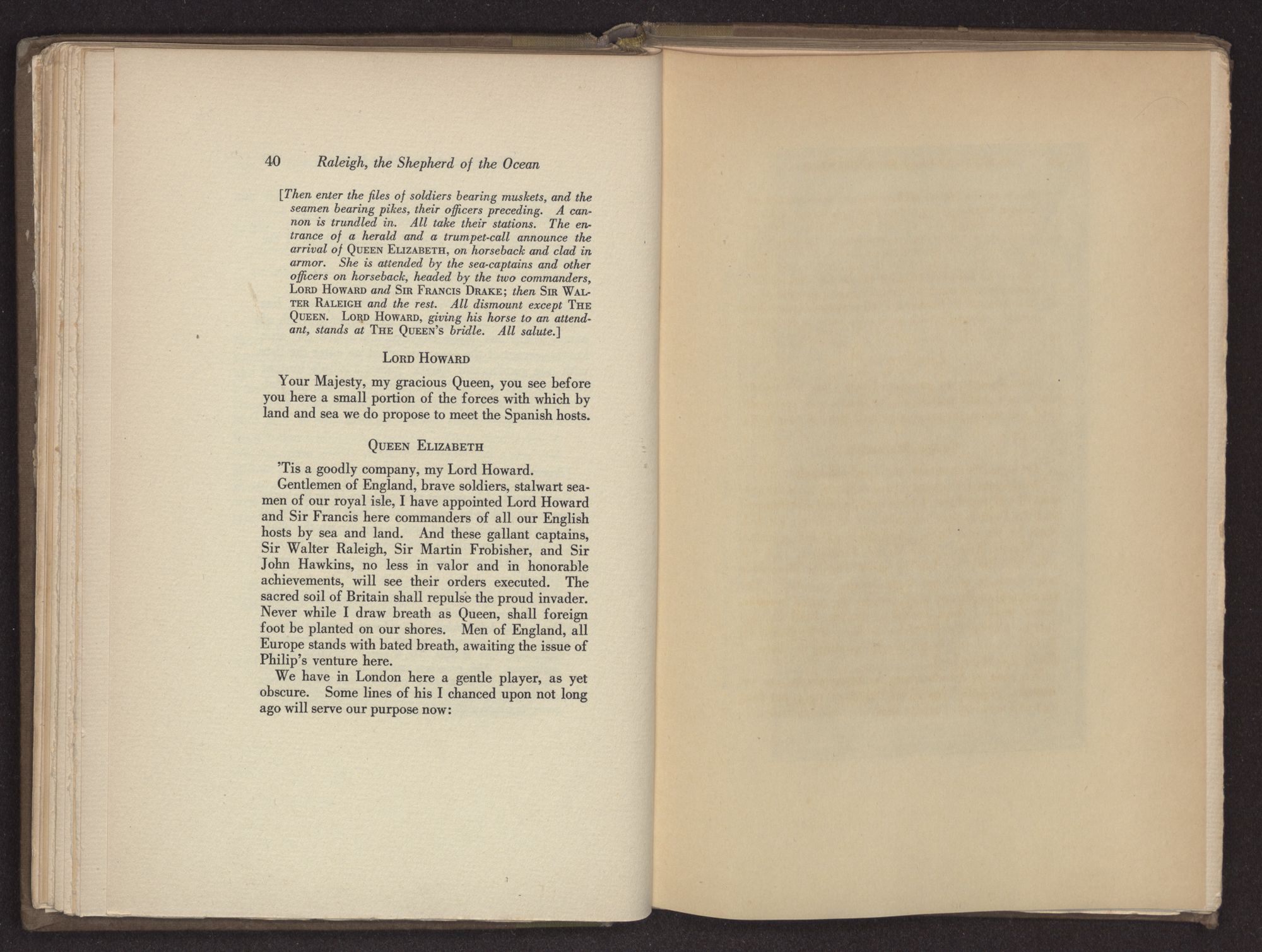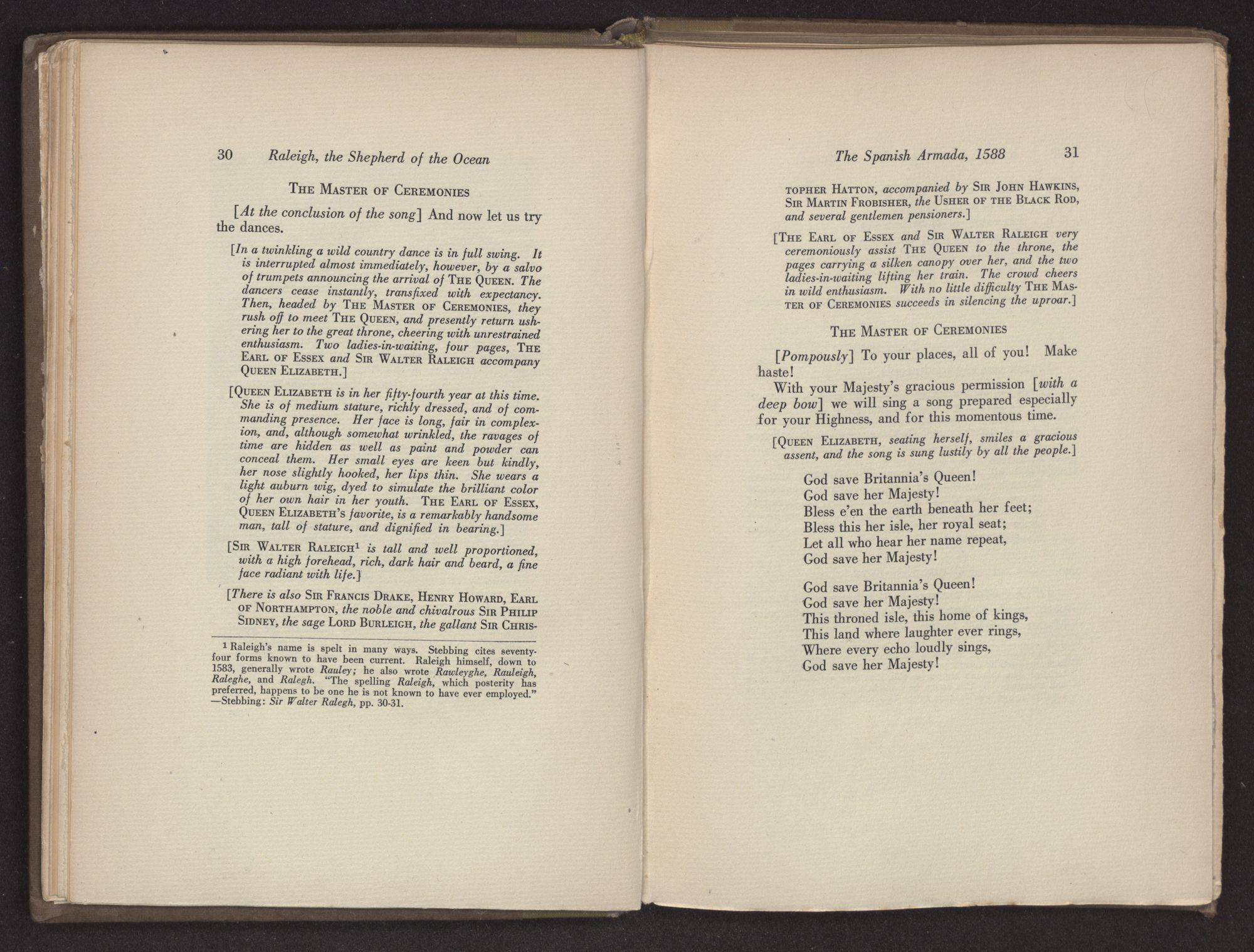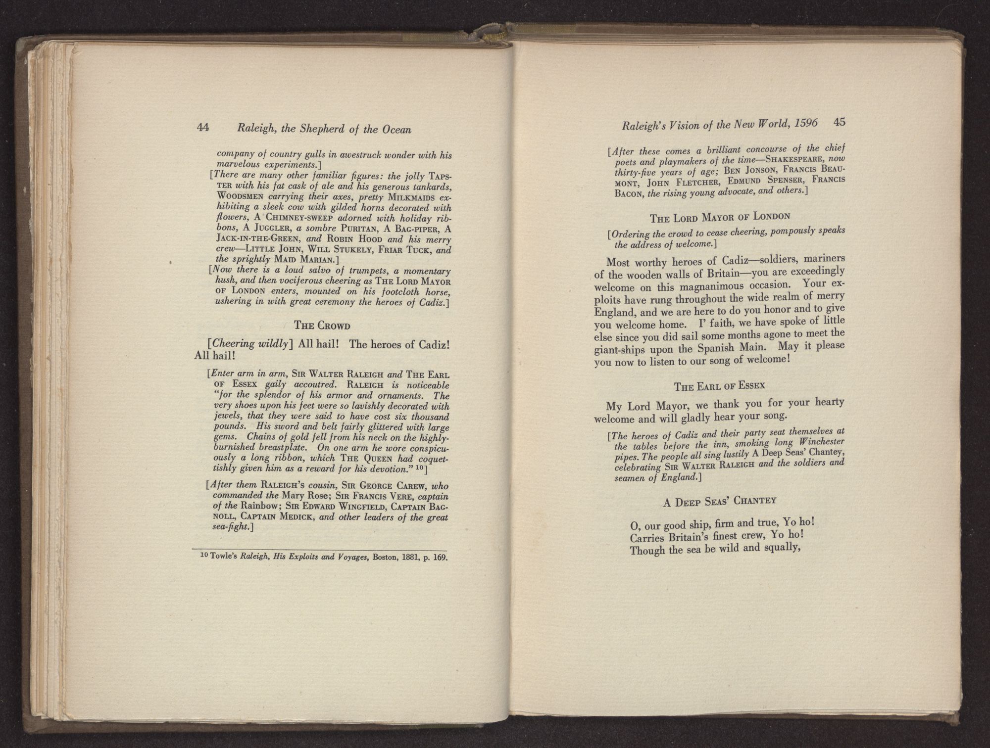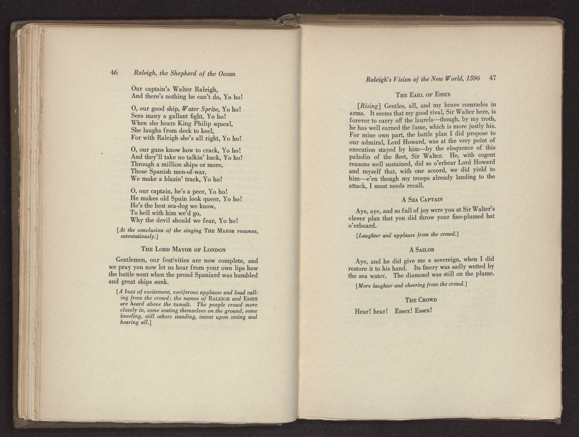 Raleigh, The Shepherd of the Ocean, is designed, not merely to present some of the shining incidents in the life of the man, but also to suggest something of the larger significance of his contribution. Sir Walter Raleigh is here conceived as representing the struggle of the English people for freedom from tyrant rule, as blazing the way for those who came after him to inherit the fruition of his vision of a brave New World—the proved reality of his dream of a new “English nation” in America.