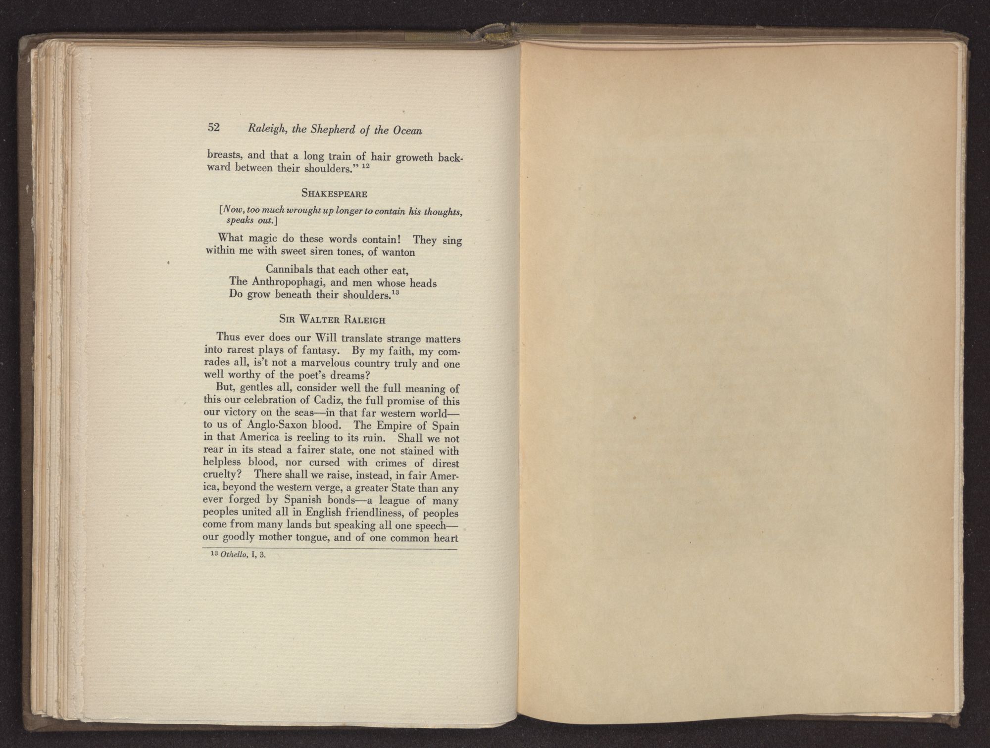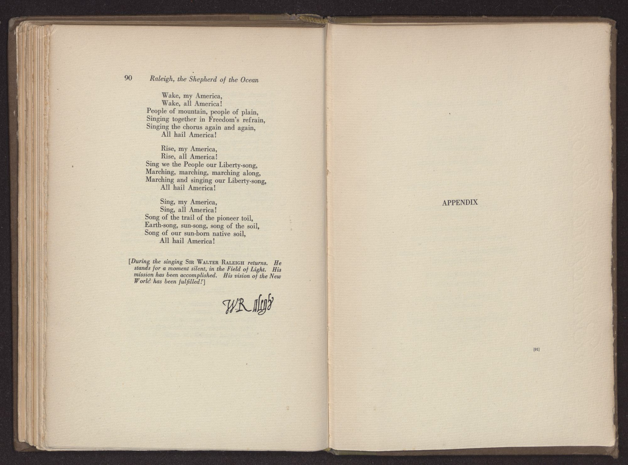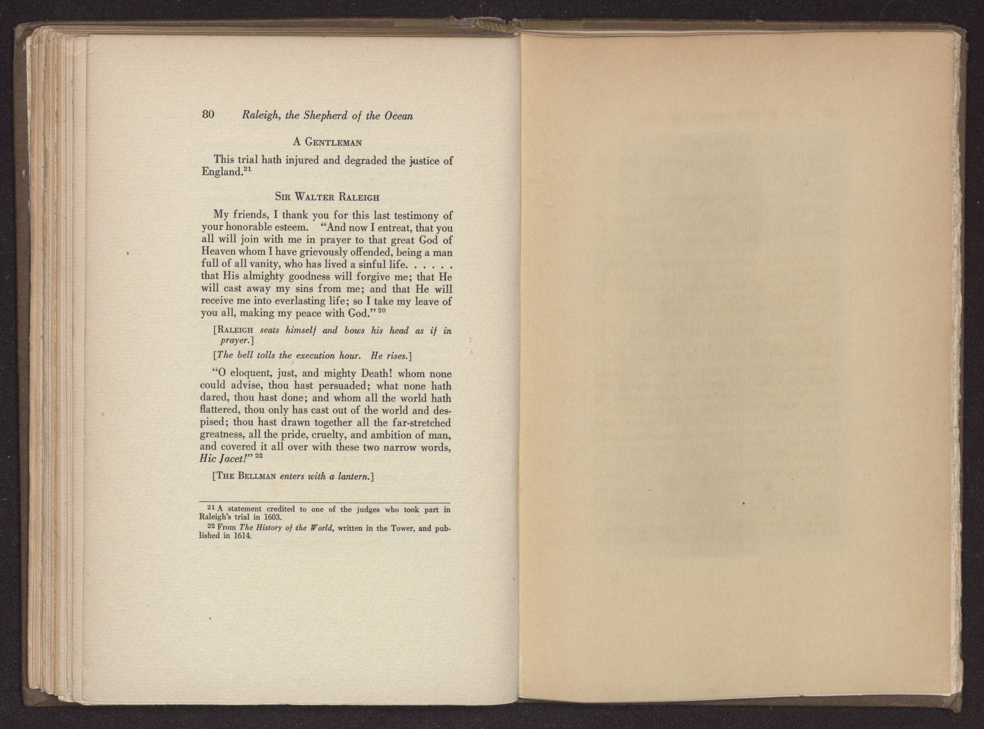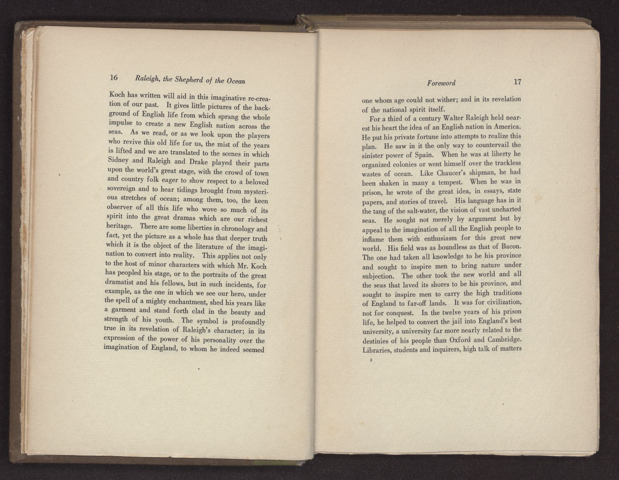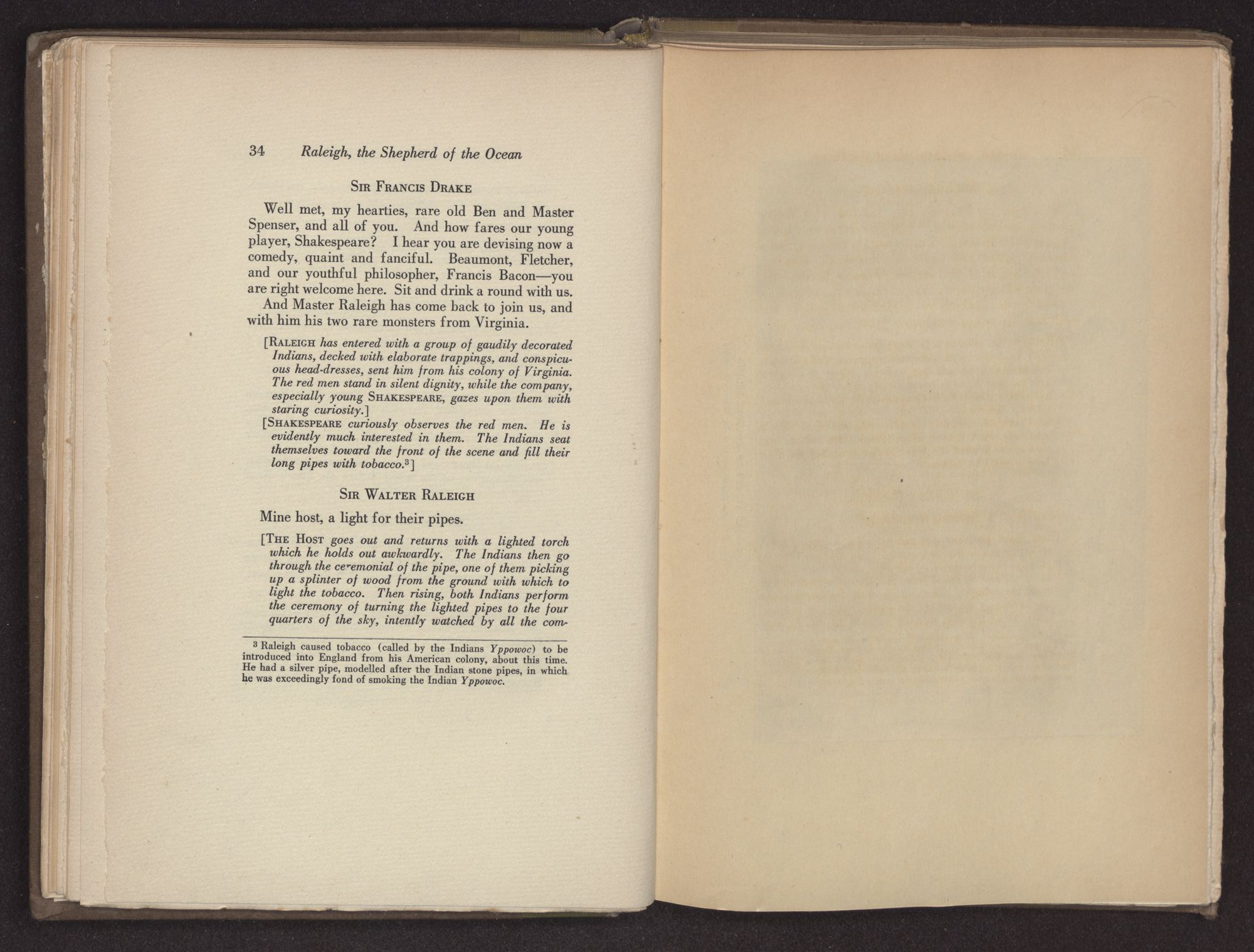 Raleigh, The Shepherd of the Ocean, is designed, not merely to present some of the shining incidents in the life of the man, but also to suggest something of the larger significance of his contribution. Sir Walter Raleigh is here conceived as representing the struggle of the English people for freedom from tyrant rule, as blazing the way for those who came after him to inherit the fruition of his vision of a brave New World—the proved reality of his dream of a new “English nation” in America.