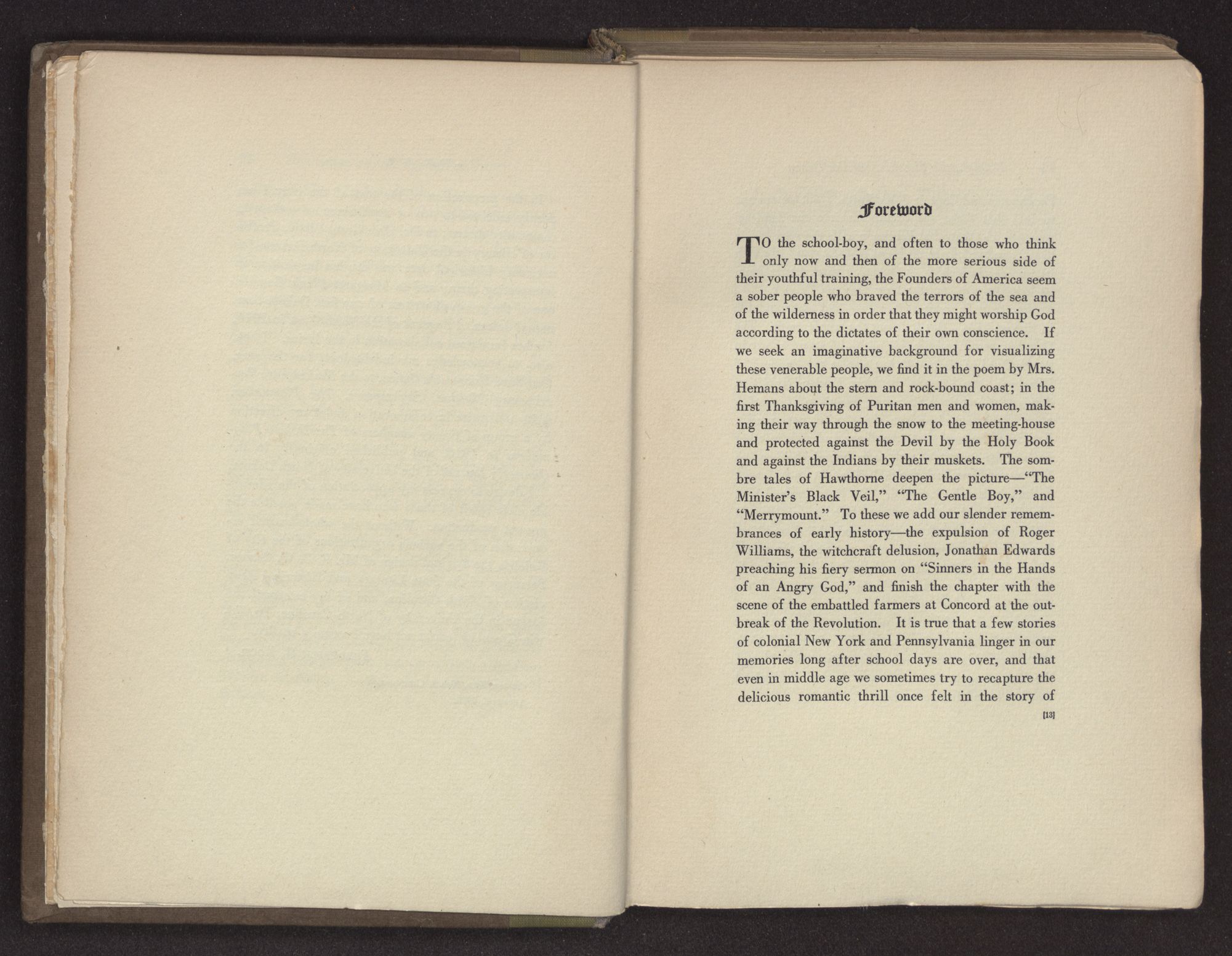 TO the school-boy, and often to those who think only now and then of the more serious side of their youthful training, the Founders of America seem a sober people who braved the terrors of the sea and of the wilderness in order that they might worship God according to the dictates of their own conscience. If we seek an imaginative background for visualizing these venerable people, we find it in the poem by Mrs. Hemans about the stern and rock-bound coast; in the first Thanksgiving of Puritan men and women, making their way through the snow to the meeting-house and protected against the Devil by the Holy Book and against the Indians by their muskets. The sombre tales of Hawthorne deepen the picture—“The Minister's Black Veil,” “The Gentle Boy,” and “Merrymount.” To these we add our slender remembrances of early history—the expulsion of Roger Williams, the witchcraft delusion, Jonathan Edwards preaching his fiery sermon on “Sinners in the Hands of an Angry God,” and finish the chapter with the scene of the embattled farmers at Concord at the outbreak of the Revolution. It is true that a few stories of colonial New York and Pennsylvania linger in our memories long after school days are over, and that even in middle age we sometimes try to recapture the delicious romantic thrill once felt in the story of