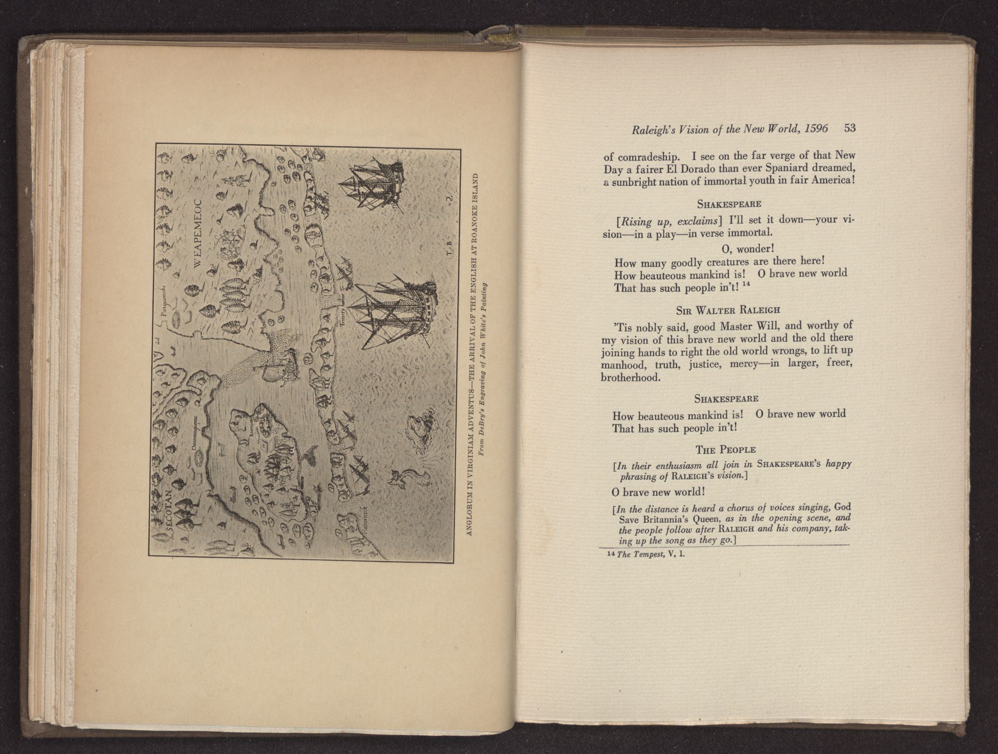 25 Raleigh wrote, just before his loss of fortune and of favor, “I shall yet live to see it an English nation.”And still—America, Virginia, new England!What magic words in this my passing hour!They conjure back the daring vision-days,And my sure trust in lands beyond the sea.America! Virginia! New England!What though my star stoop not to its eclipse,Still it doth harbinger the New Day's dawn.And by that way I have so blithely gone,Sea-buffeted, with all my gallant men,A brave new world will yet be won by EnglishYouth across the seas—a sunbright worldOf high resolve—of faith, and love, and Liberty![He goes, in answer to the summons ofThe Bellman.]