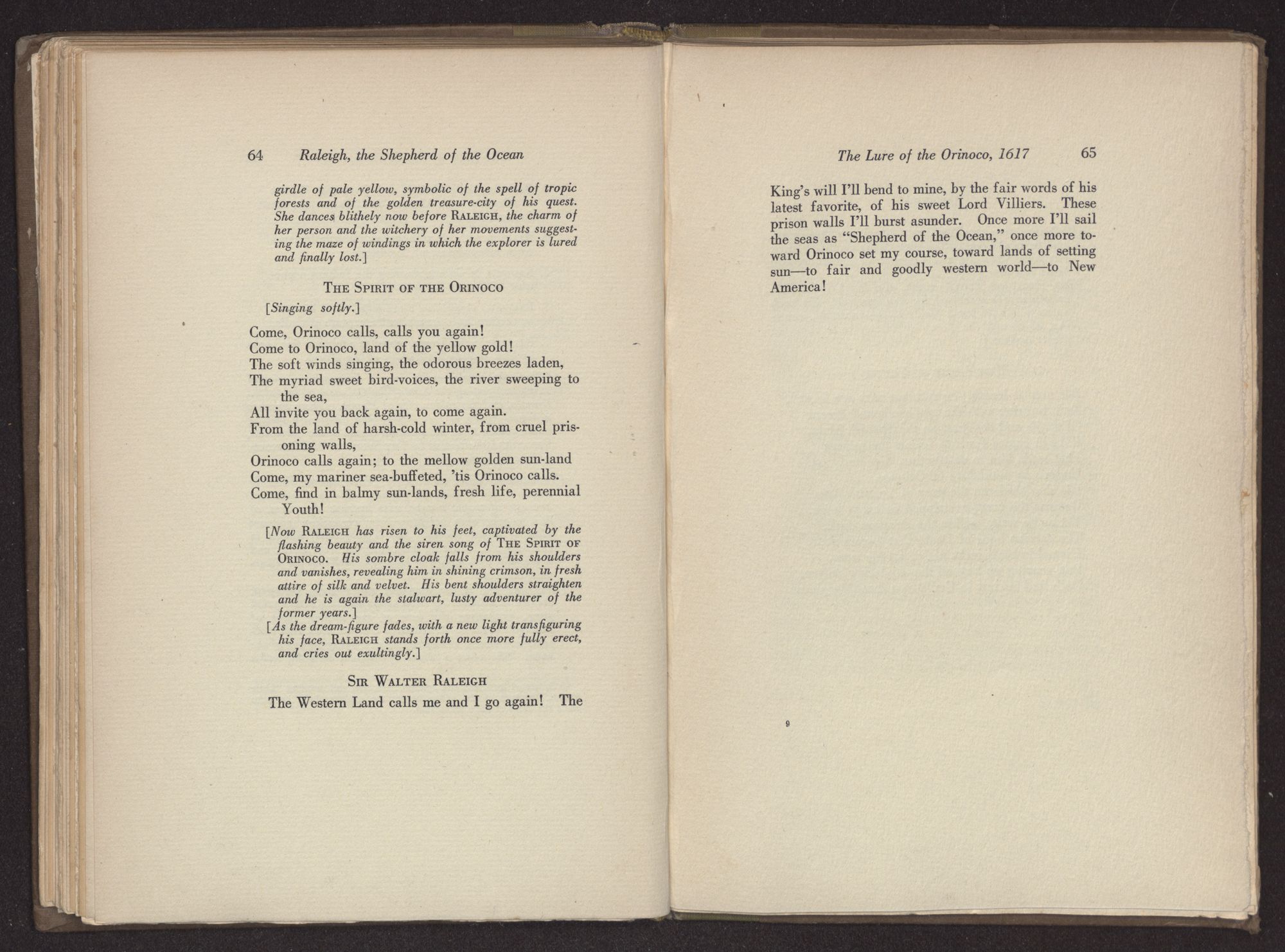 All this Professor Koch has finely and truthfully expressed in his Masque. In the symbol of Orinoco we have a conception not only marked by poetic and dramatic imagination, but one true at the same time to the spirit of allegory so constantly met in Elizabethan England and to the facts of Raleigh's life. The Masque here presented is not merely an example of antiquarian zeal. It is not merely a series of scenes from the life and time of this great ancestor of ours. It is an interpretation of the vision out of which the English nation in America was to come. It would be pleasant, more satisfactory perhaps to our desire for