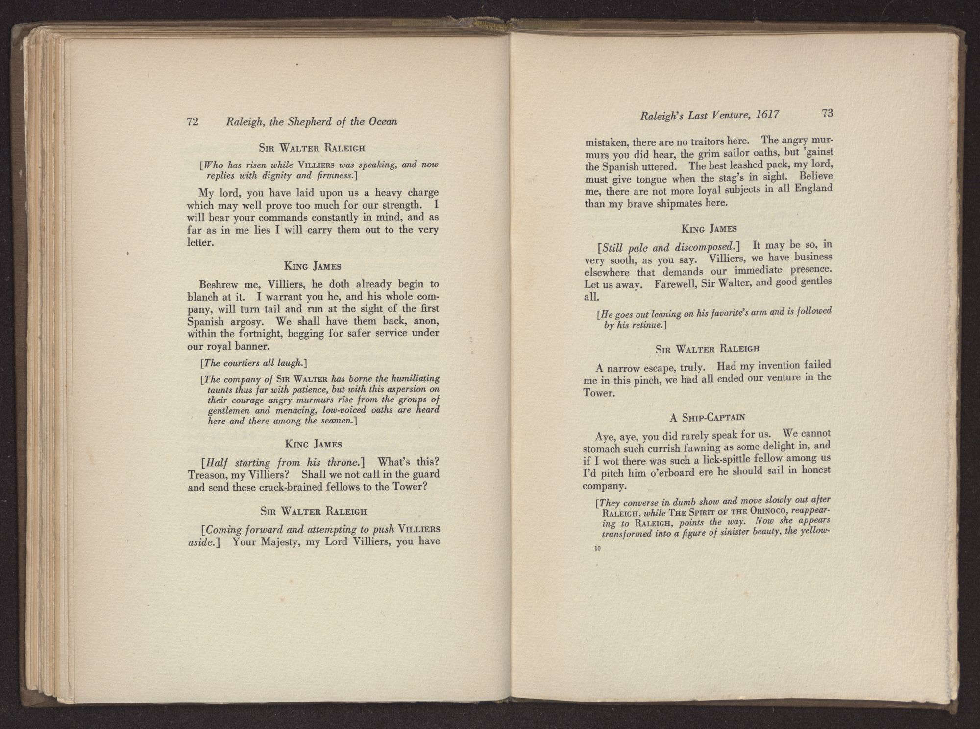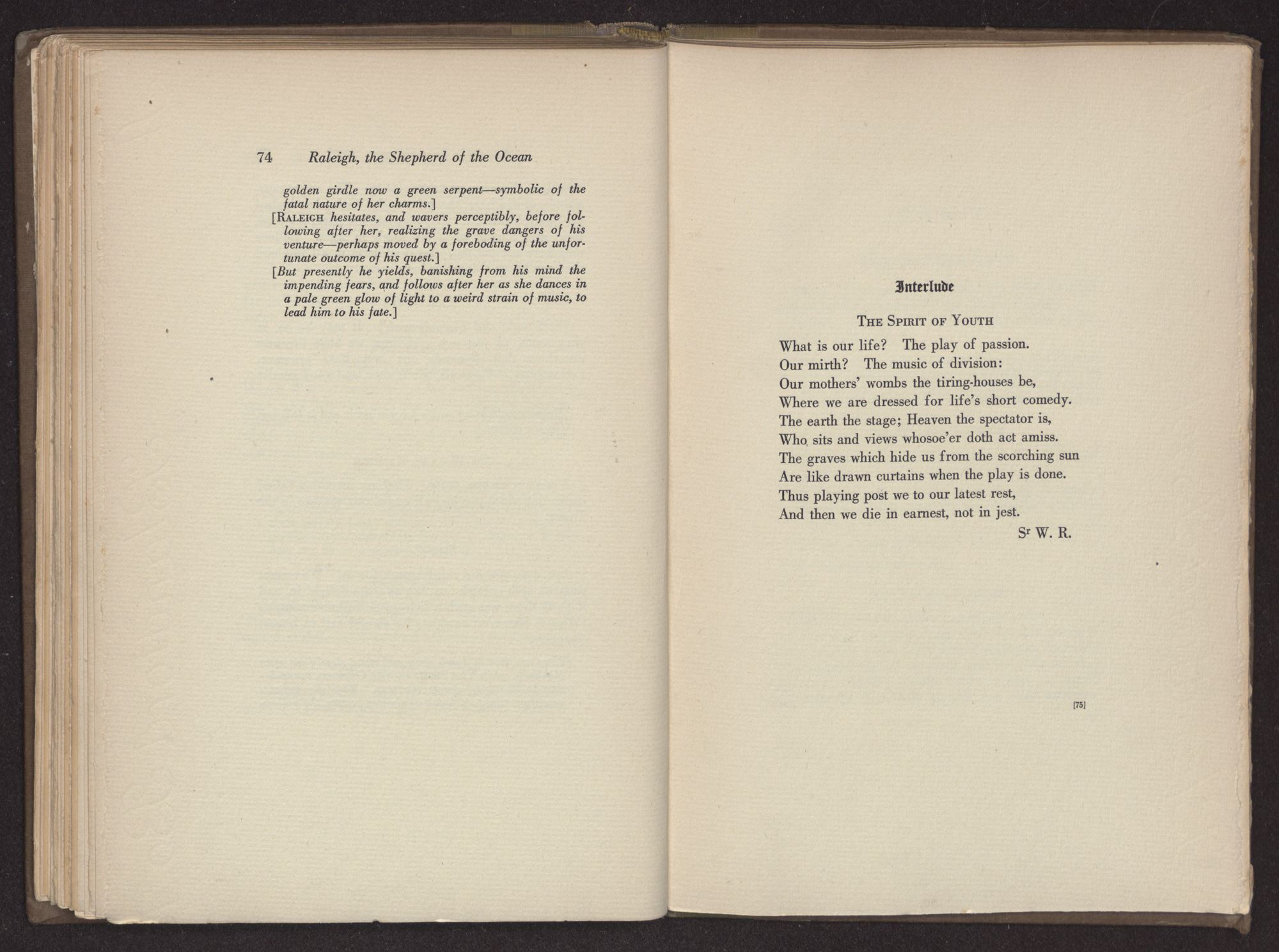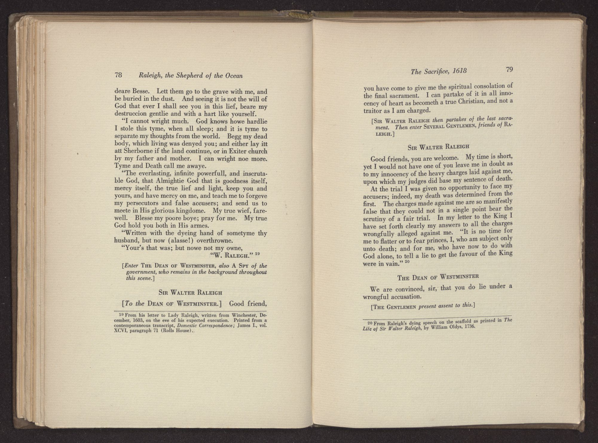 In writing this play of Raleigh, The Shepherd of the Ocean, I have enriched the text, wherever it was practicable, with the vivid phrases of Raleigh himself—adapting various passages from his principal prose-writings, and including in the final scene his beautiful and haunting verses, Even such is time, etc., found in his Bible in the gatehouse at Westminster, and said to have been written by him the night before his execution.