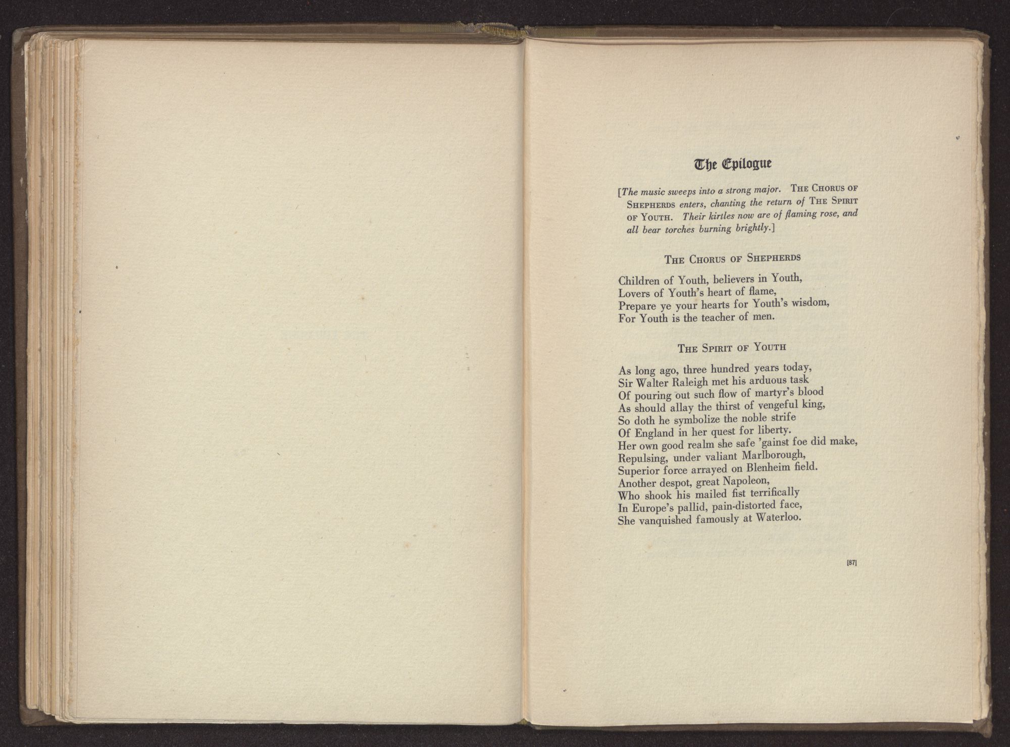 And now again, in this age of Today,When all the world lay basking quietlyBeneath the bright, warm sun of peace and faith,When cruel hordes did sweep relentlessly,Despoiling Belgium, threatening fair France,Again did England bare her dauntless breast,And strike, as oft of old, for Liberty.Then did America, with zealous pride,Make good her kinship with these loyal brave,Who bore the grim brunt of those sullen hosts.The Chorus of Shepherds
