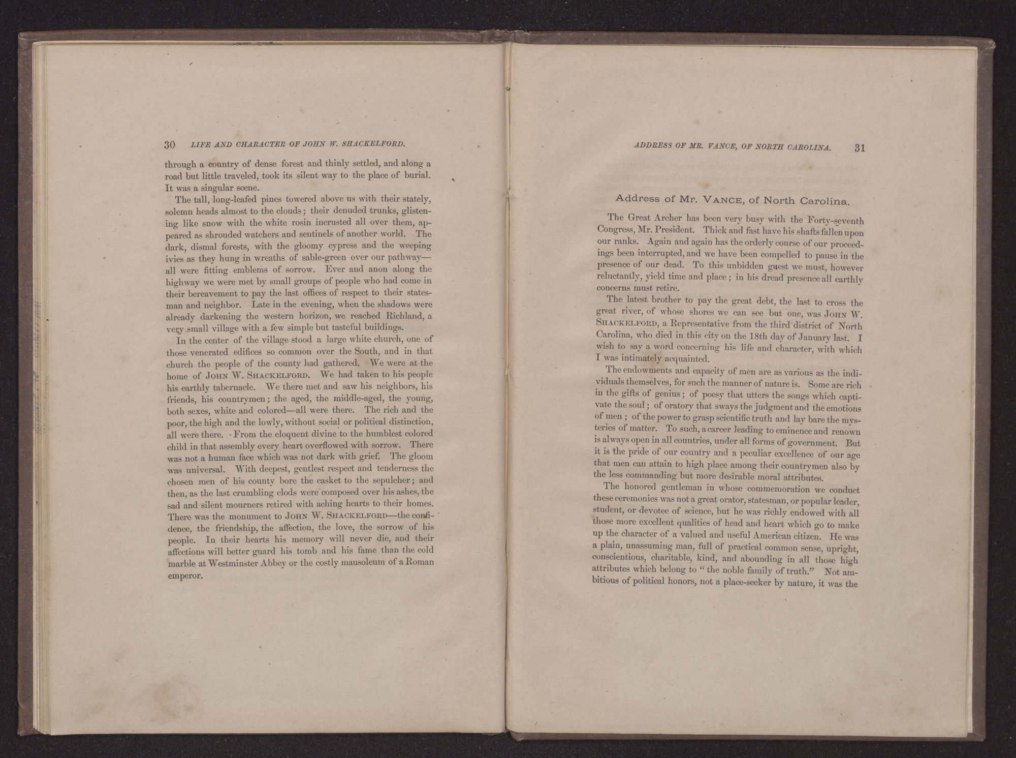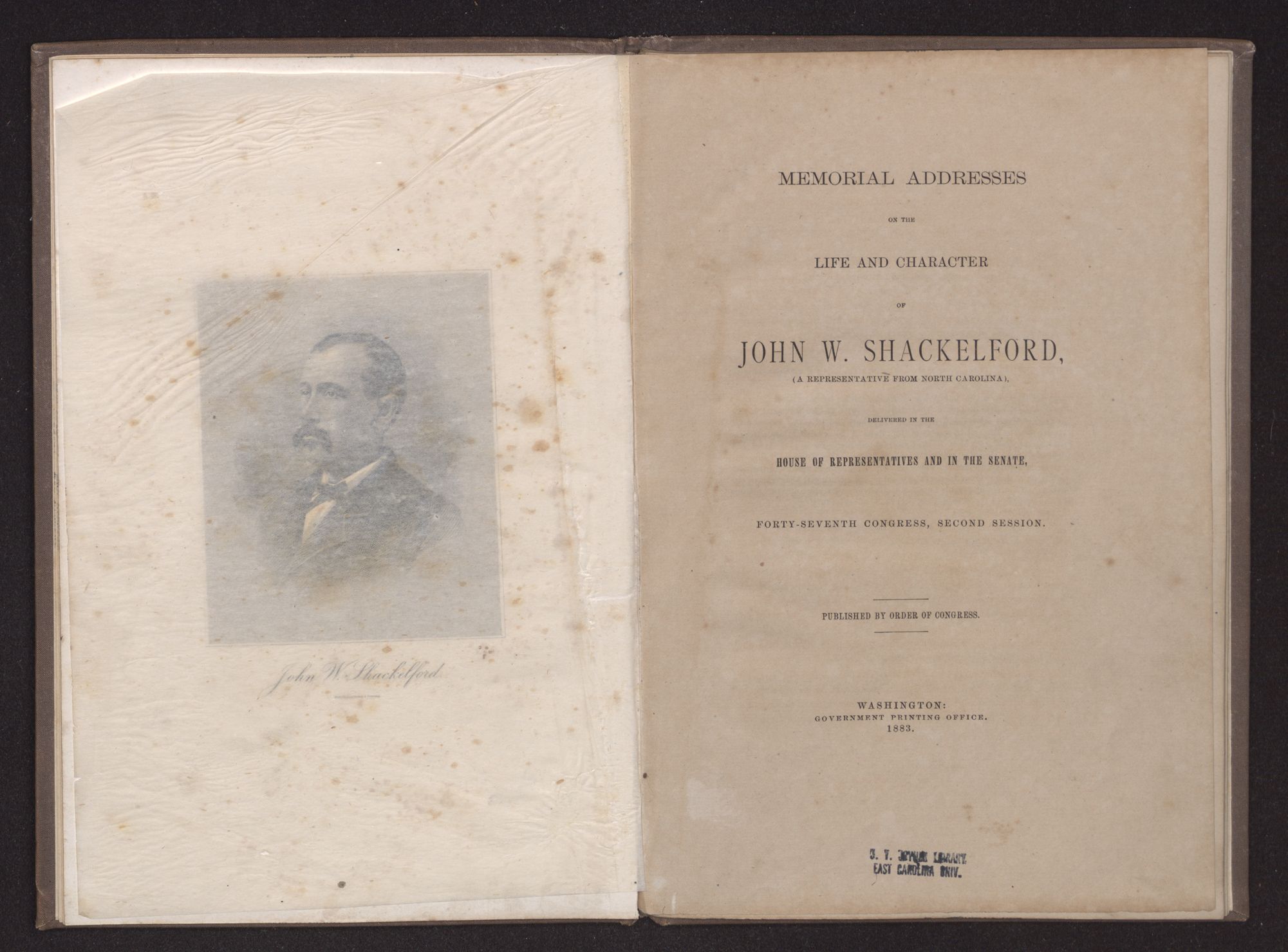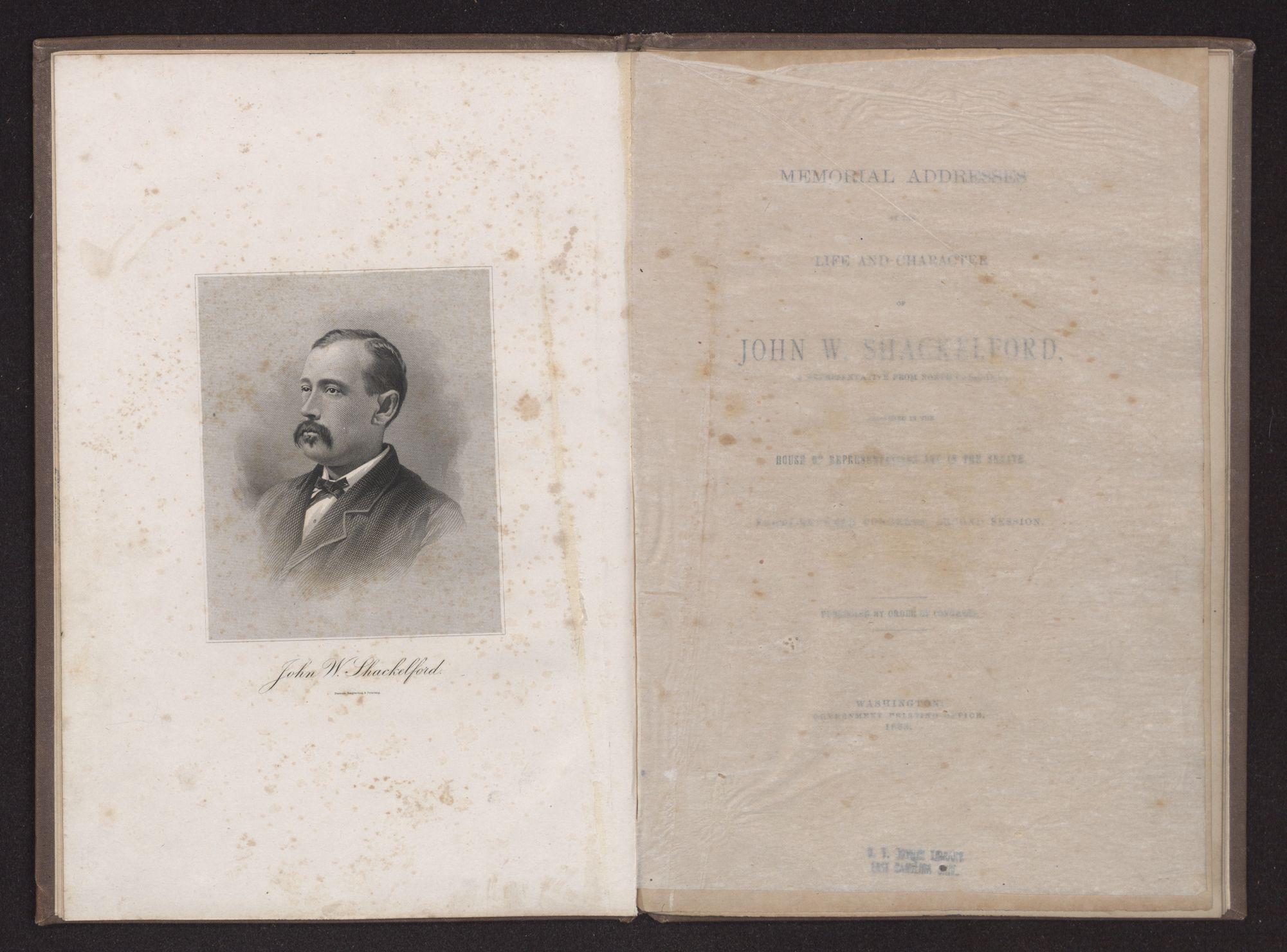 MEMORIAL ADDRESSES ON THE LIFE AND CHARACTER OF JOHN W. SHACKELFORD,(A REPRESENTATIVE FROM NORTH CAROLINA), DELIVERED IN THE HOUSE OF REPRESENTATIVES AND IN THE SENATE,FORTY-SEVENTH CONGRESS, SECOND SESSION. PUBLISHED BY ORDER OF CONGRESS.WASHINGTON:GOVERNMENT PRINTING OFFICE.1883.