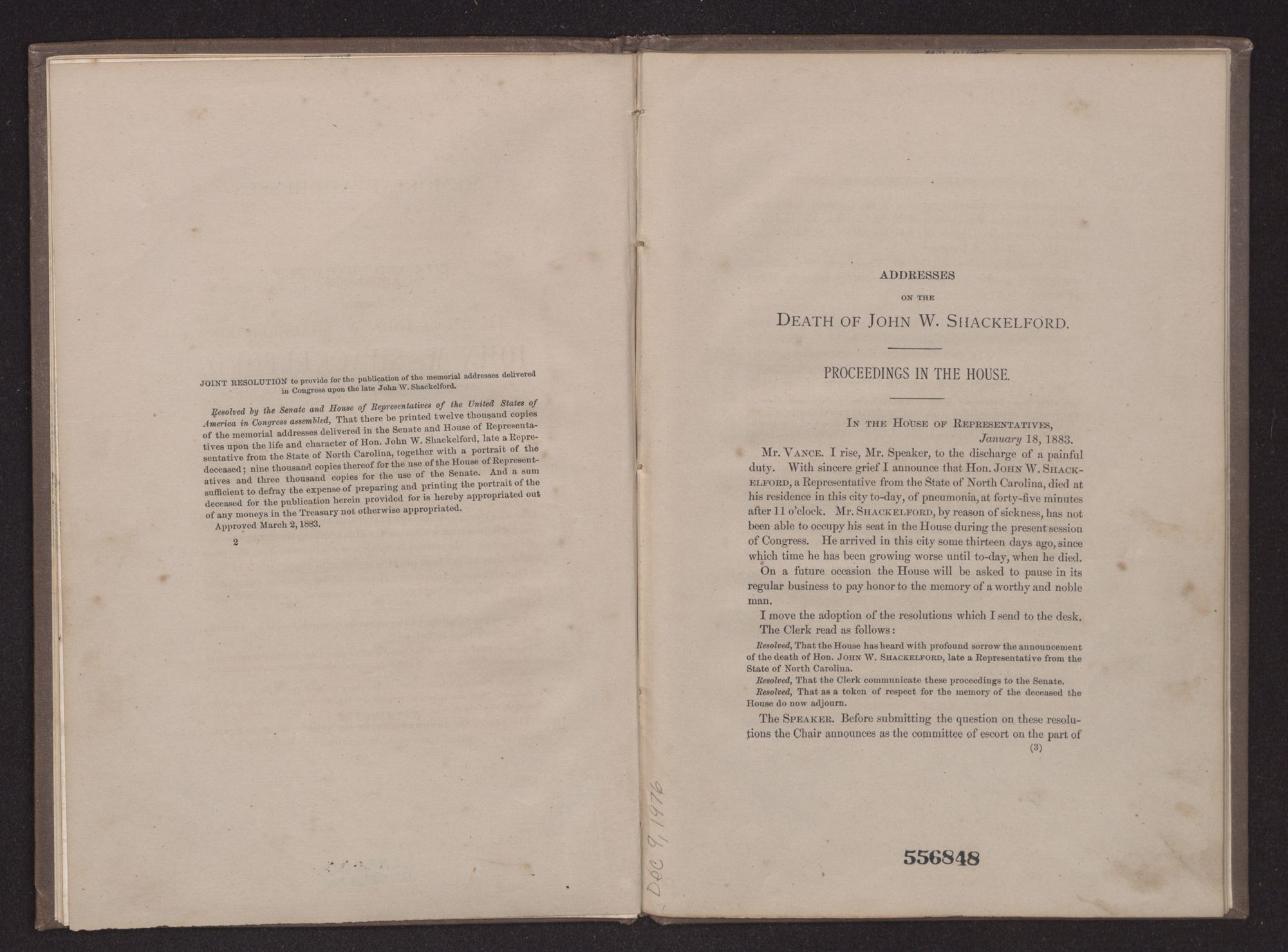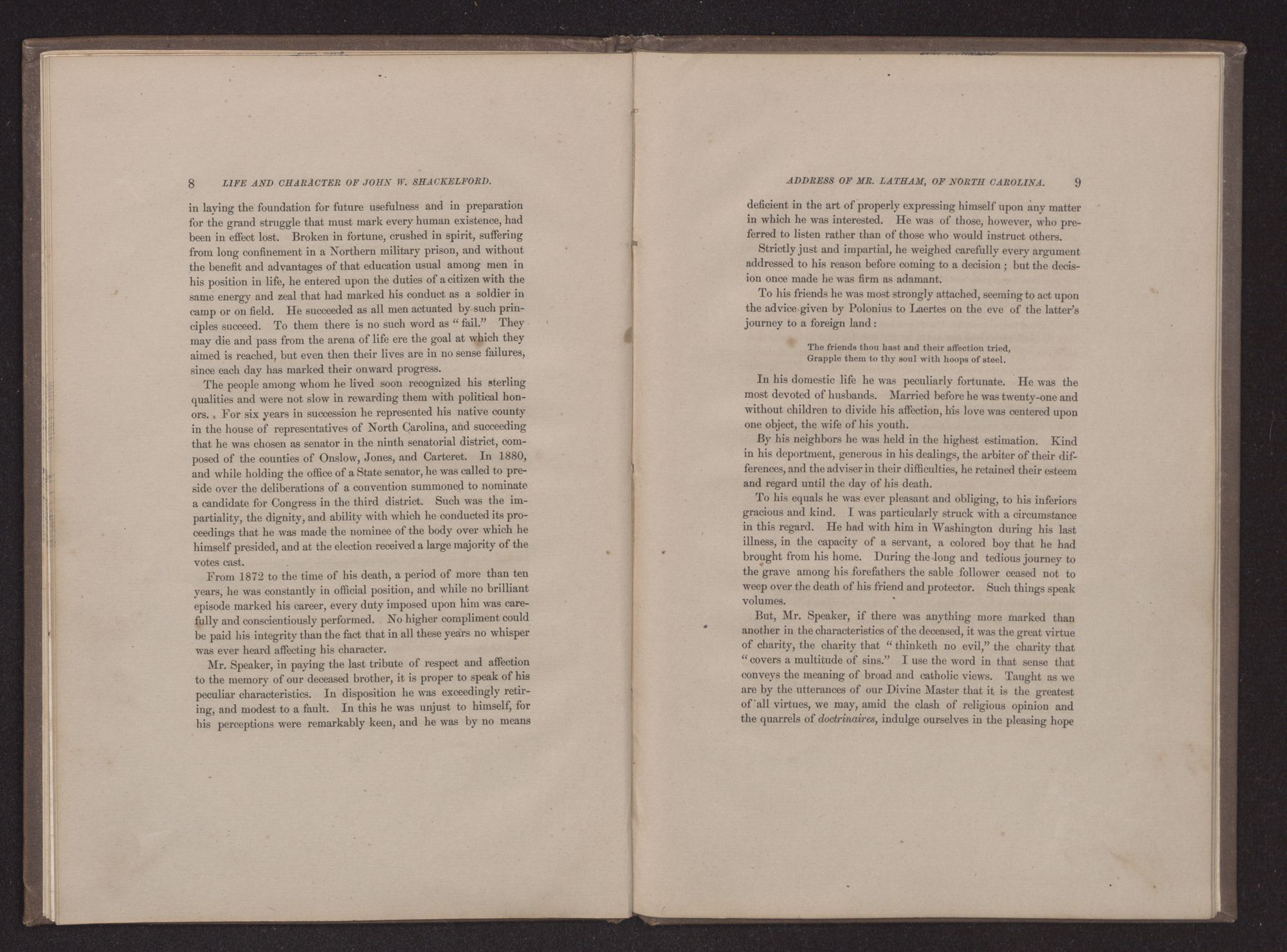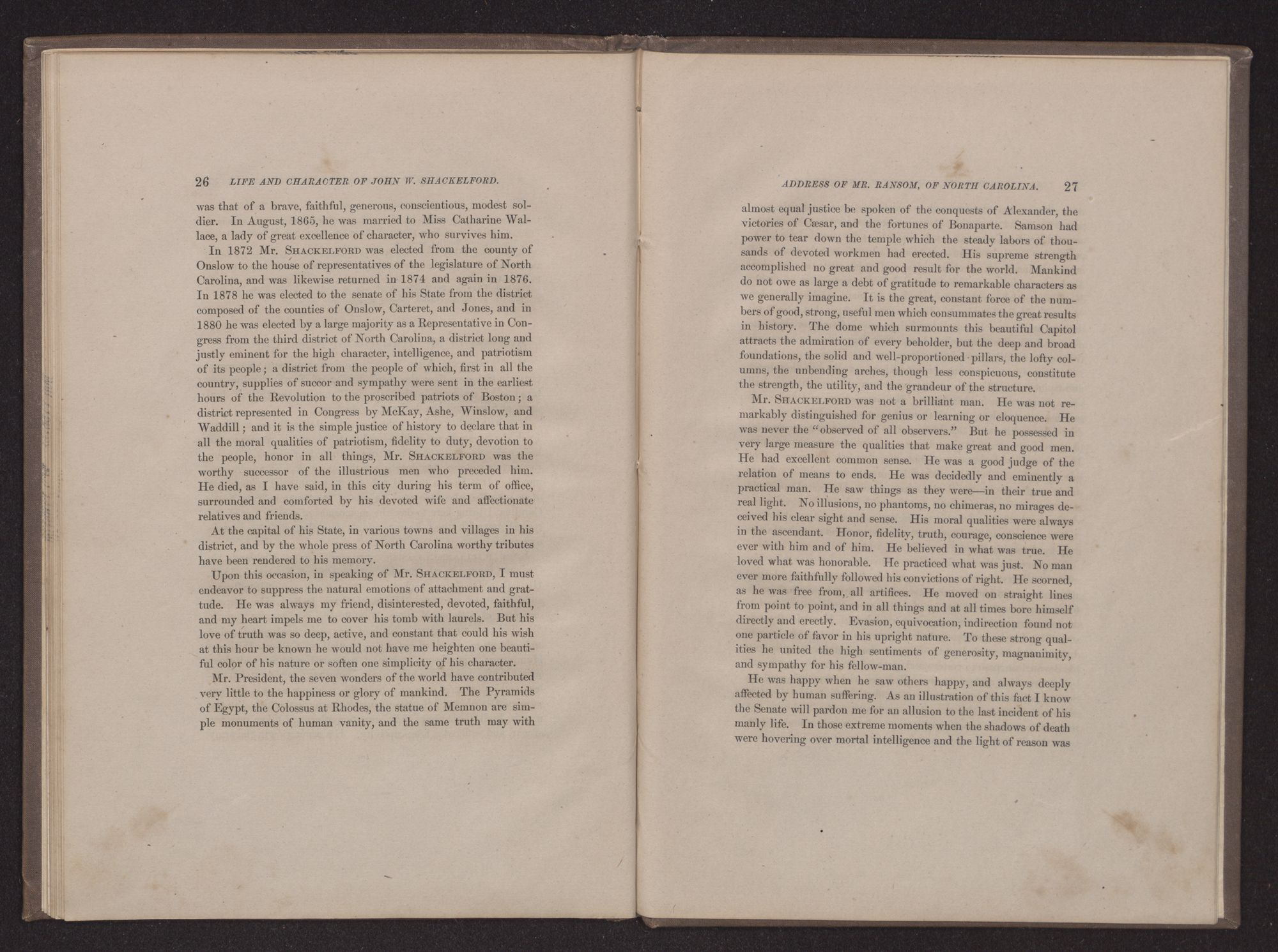MEMORIAL ADDRESSES ON THE LIFE AND CHARACTER OF JOHN W. SHACKELFORD,(A REPRESENTATIVE FROM NORTH CAROLINA), DELIVERED IN THE HOUSE OF REPRESENTATIVES AND IN THE SENATE,FORTY-SEVENTH CONGRESS, SECOND SESSION. PUBLISHED BY ORDER OF CONGRESS.WASHINGTON:GOVERNMENT PRINTING OFFICE.1883.