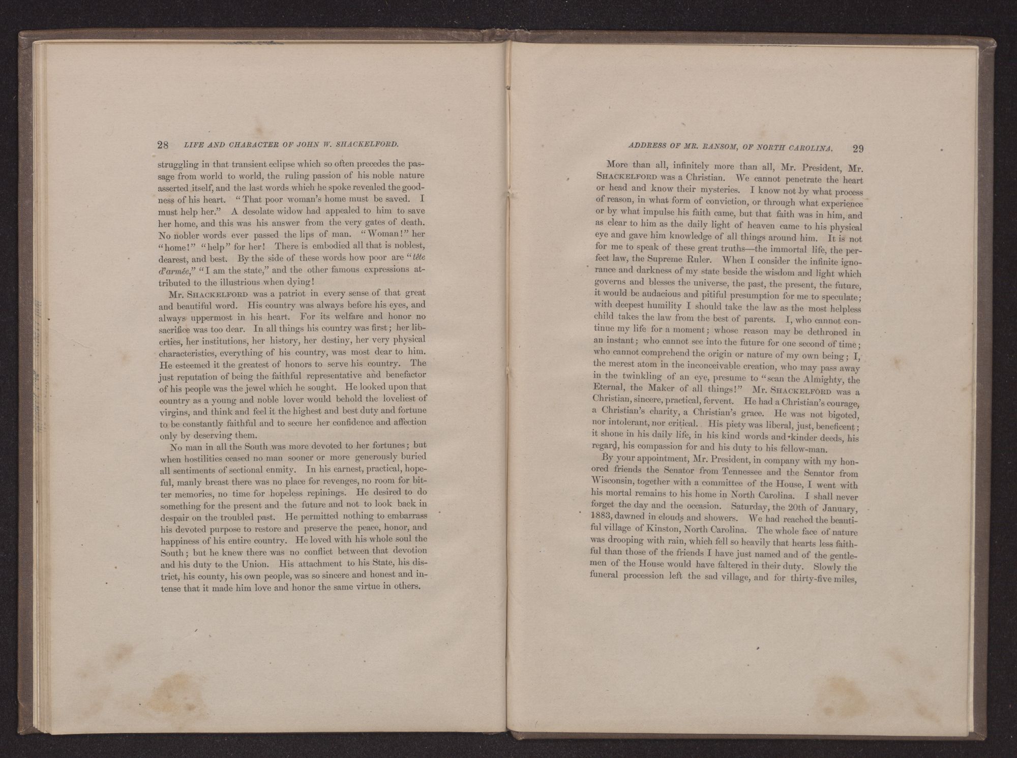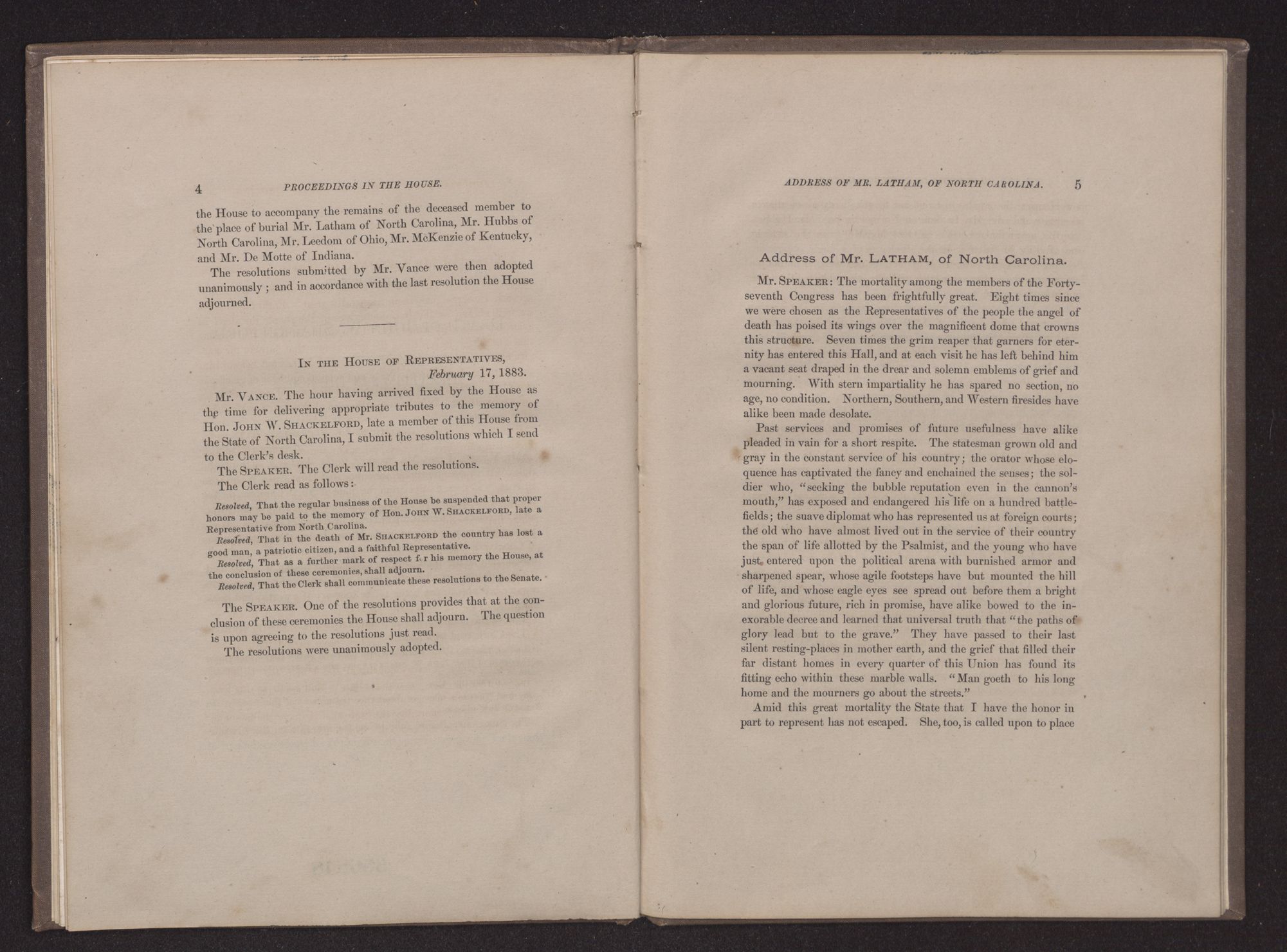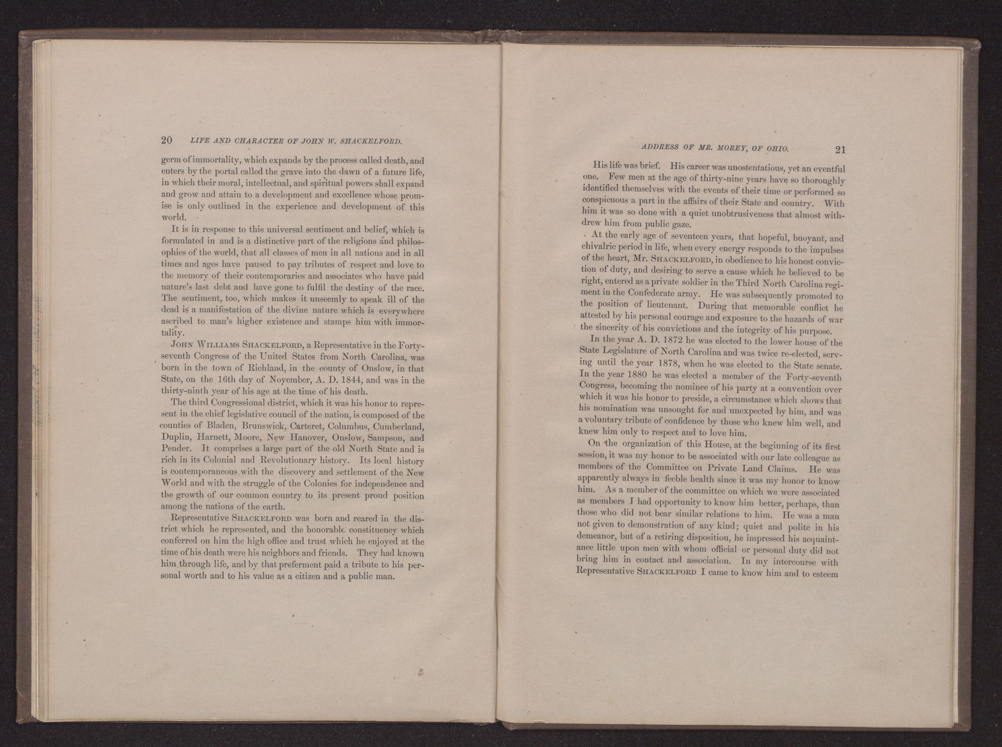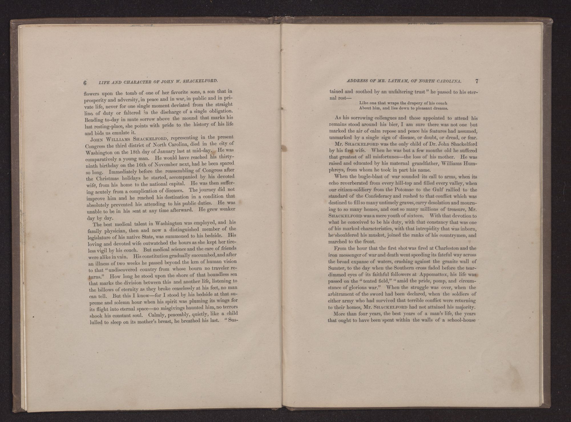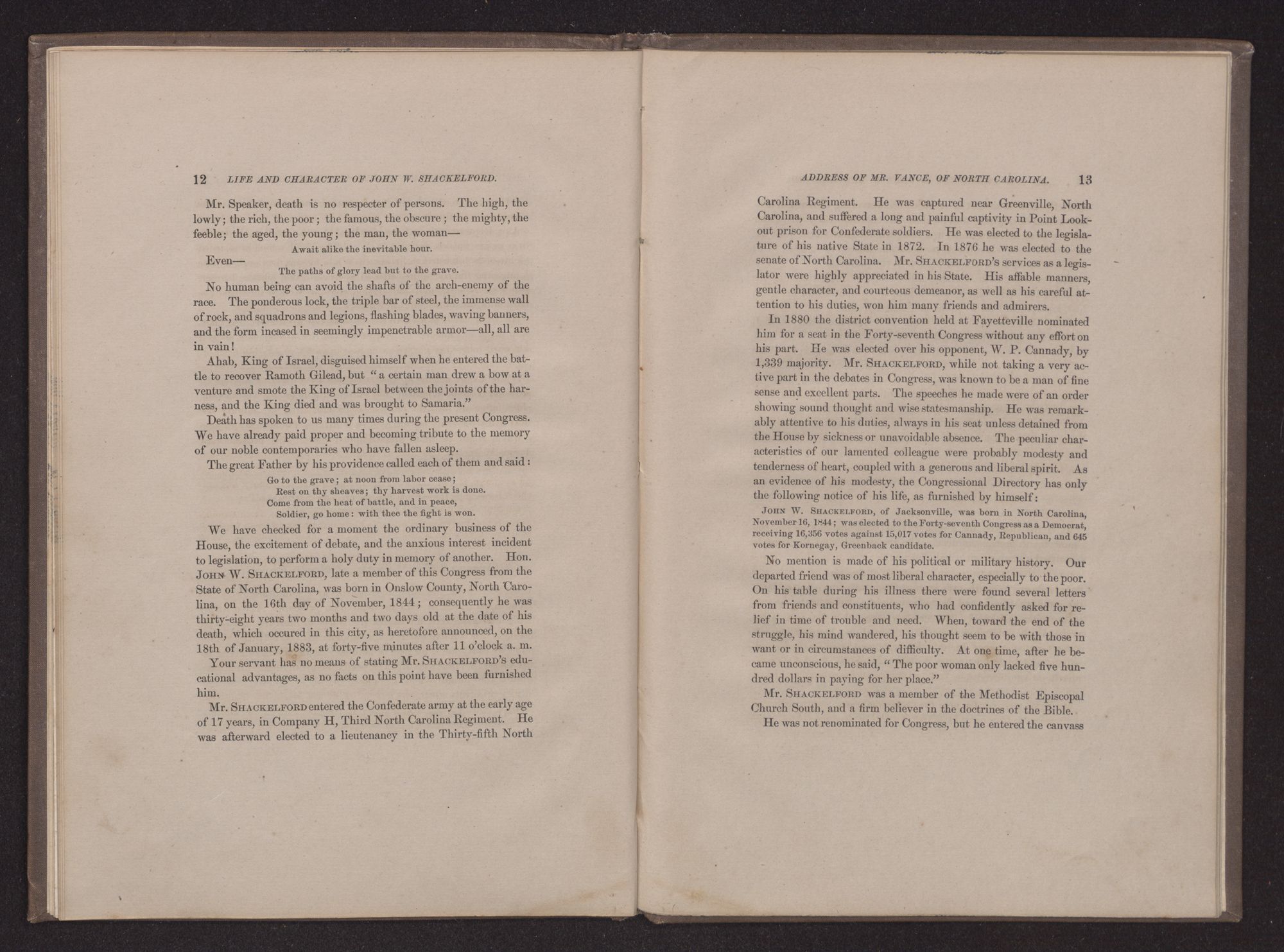 Go to the grave; at noon from labor cease;Rest on thy sheaves; thy harvest work is done.Come from the heat of battle, and in peace,Soldier, go home: with thee the fight is won.We have checked for a moment the ordinary business of the House, the excitement of debate, and the anxious interest incident to legislation, to perform a holy duty in memory of another. Hon. JOHN W. SHACKELFORD, late a member of this Congress from the State of North Carolina, was born in Onslow County, North Carolina, on the 16th day of November, 1844; consequently he was thirty-eight years two months and two days old at the date of his death, which occured in this city, as heretofore announced, on the 18th of January, 1883, at forty-five minutes after 11 o'clock a. m.