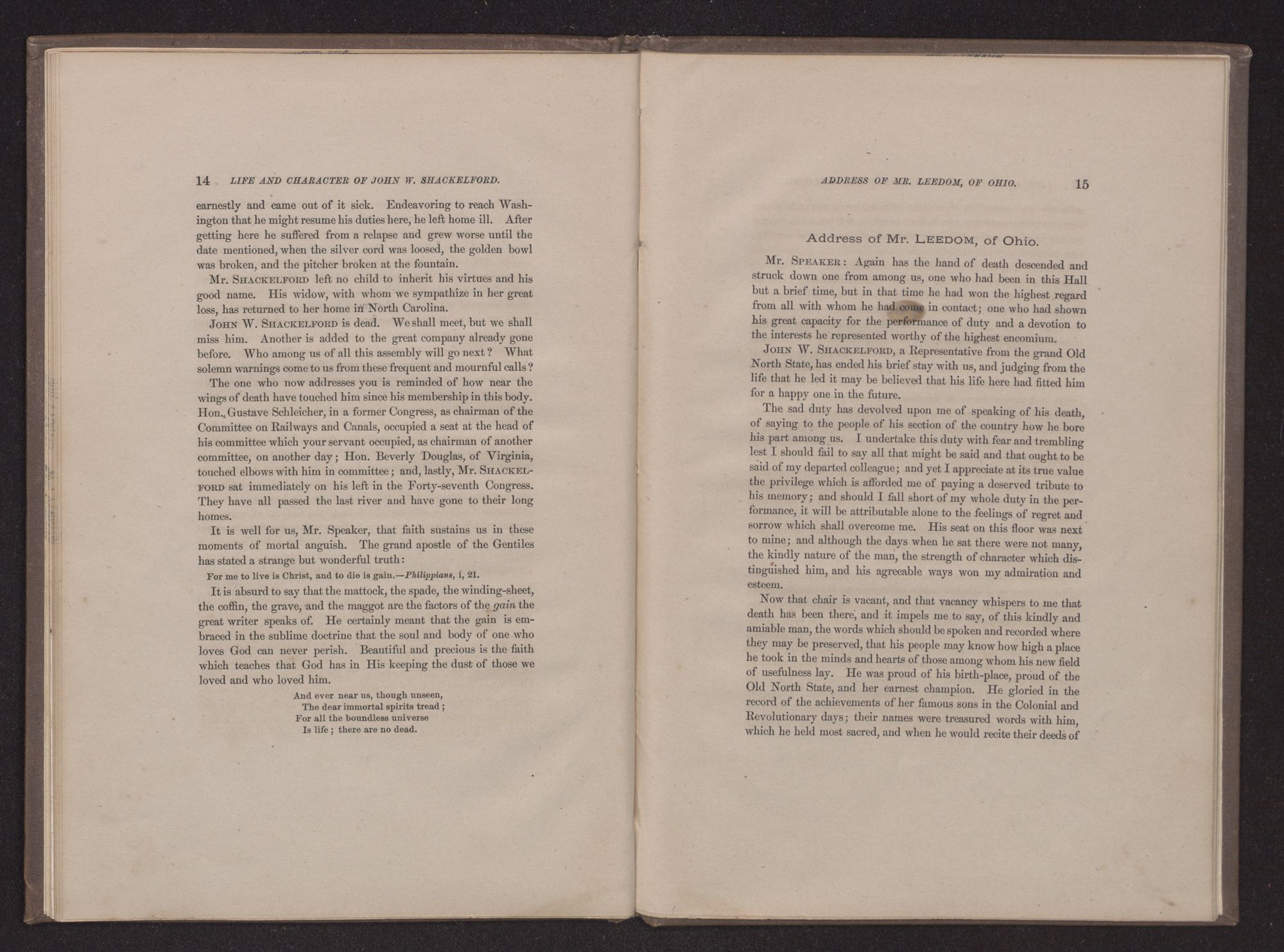And ever near us, though unseen,The dear immortal spirits tread;For all the boundless universeIs life; there are no dead.Address of Mr. LEEDOM, of Ohio.Mr. SPEAKER: Again has the hand of death descended and struck down one from among us, one who had been in this Hall but a brief time, but in that time he had won the highest regard from all with whom he had come in contact; one who had shown his great capacity for the performance of duty and a devotion to the interests he represented worthy of the highest encomium.