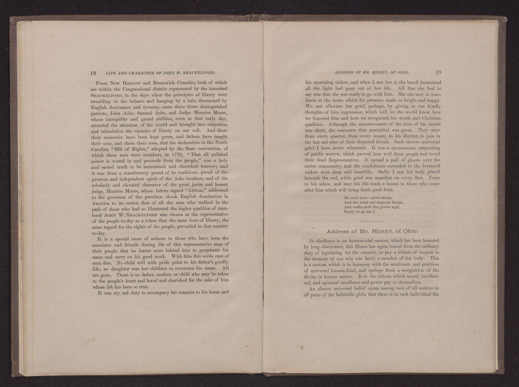 He rests now; quiet sleeps,And the wind sad requiem keeps,And wafts aloft the gentle sigh,Ready to go am I.Address of Mr. MOREY, of Ohio.In obedience to an immemorial custom, which has been honored by long observance, this House has again ceased from the ordinary duty of legislating for the country, to pay a tribute of respect to the memory of one who was lately a member of this body. This is a custom which is in harmony with the sentiment and practices of universal human-kind, and springs from a recognition of the divine in human nature. It is the tribute which moral, intellectual, and spiritual excellence and power pay to themselves.