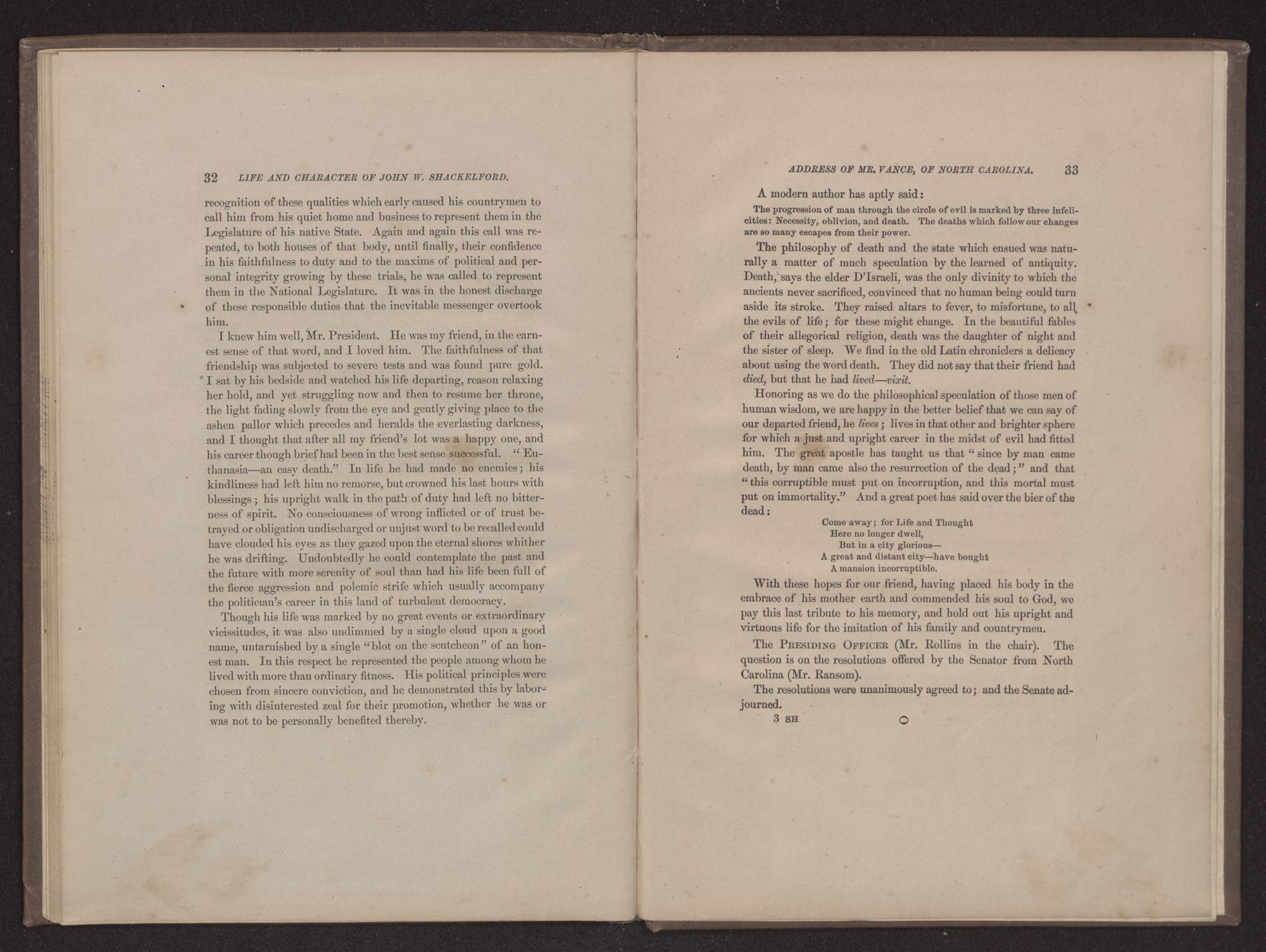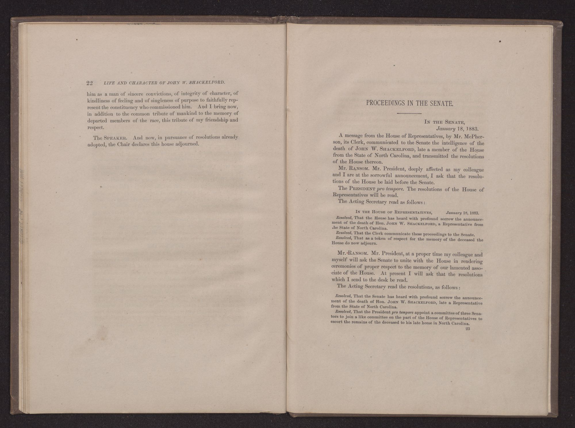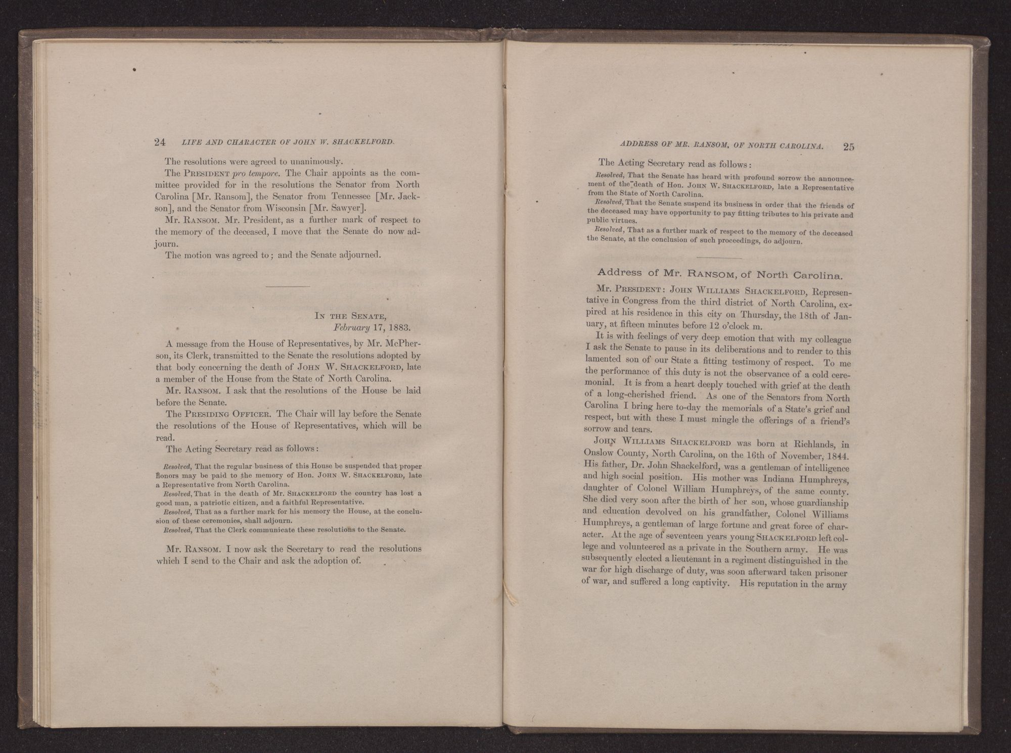 Address of Mr. RANSOM, of North Carolina.Mr. PRESIDENT: JOHN WILLIAMS SHACKELFORD, Representative in Congress from the third district of North Carolina, expired at his residence in this city on Thursday, the 18th of January, at fifteen minutes before 12 o'clock m.