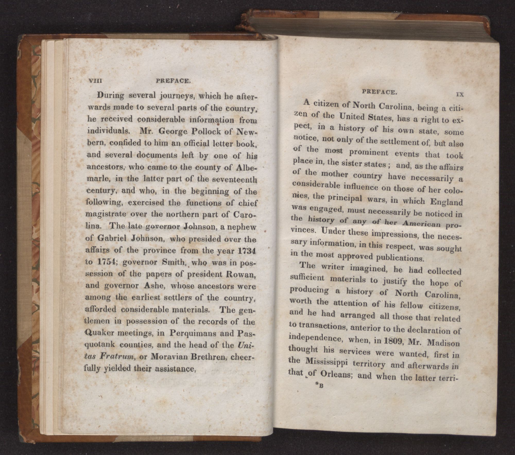 The writer imagined, he had collected sufficient materials to justify the hope of producing a history of North Carolina, worth the attention of his fellow citizens, and he had arranged all those that related to transactions, anterior to the declaration of independence, when, in 1809, Mr. Madison thought his services were wanted, first in the Mississippi territory and afterwards in that of Orleans; and when the latter territory