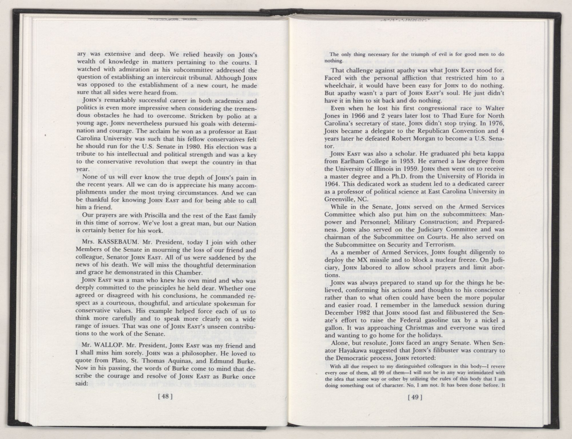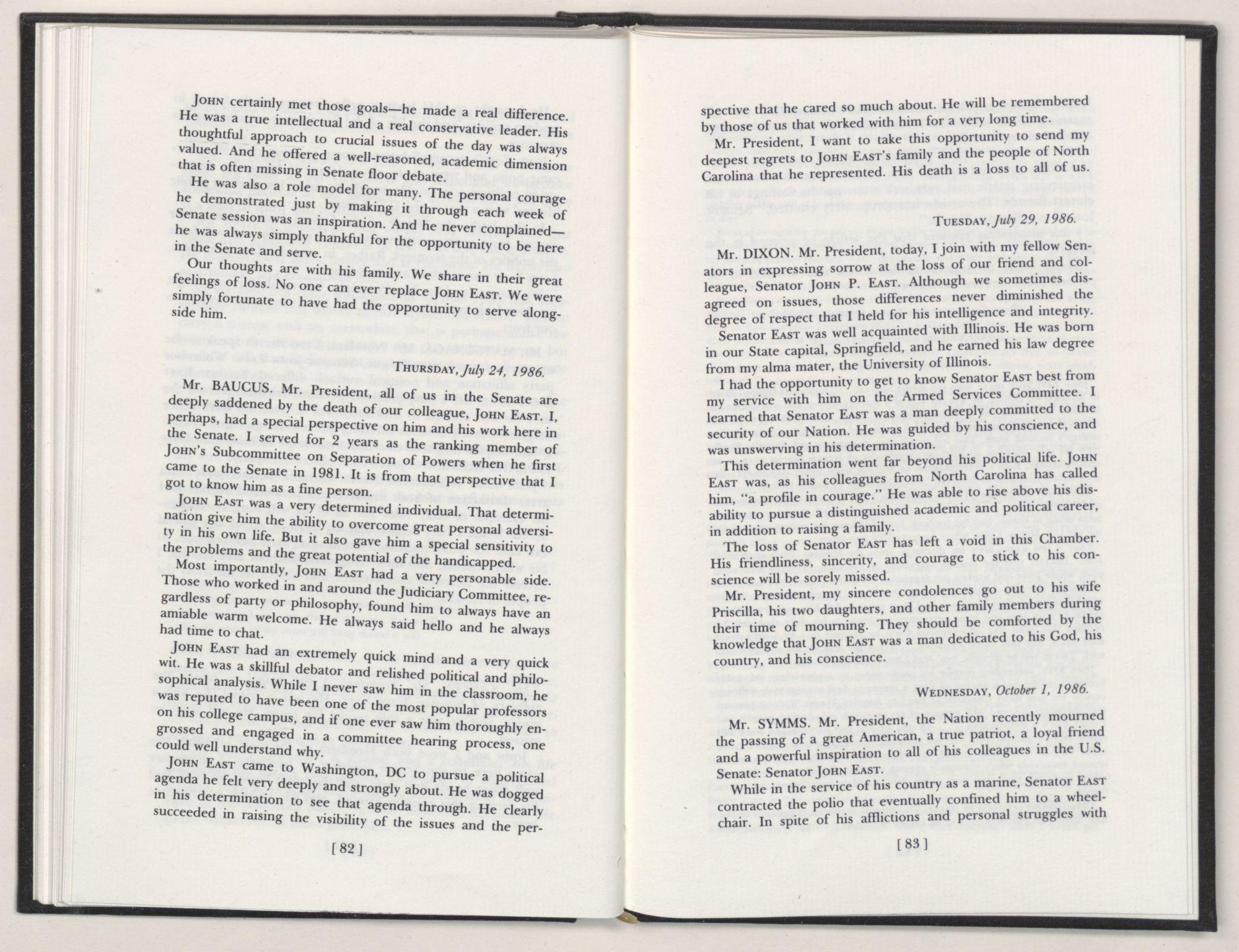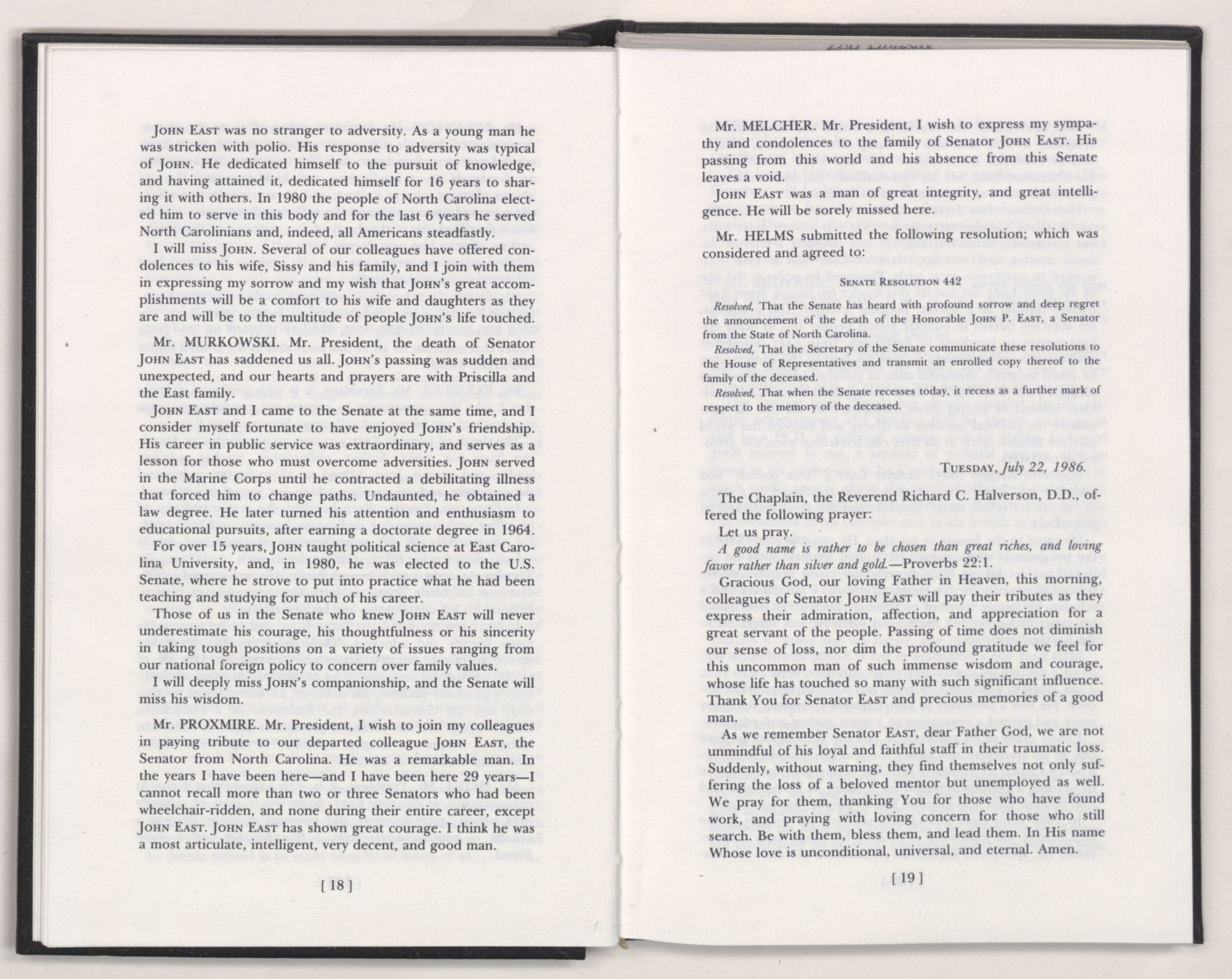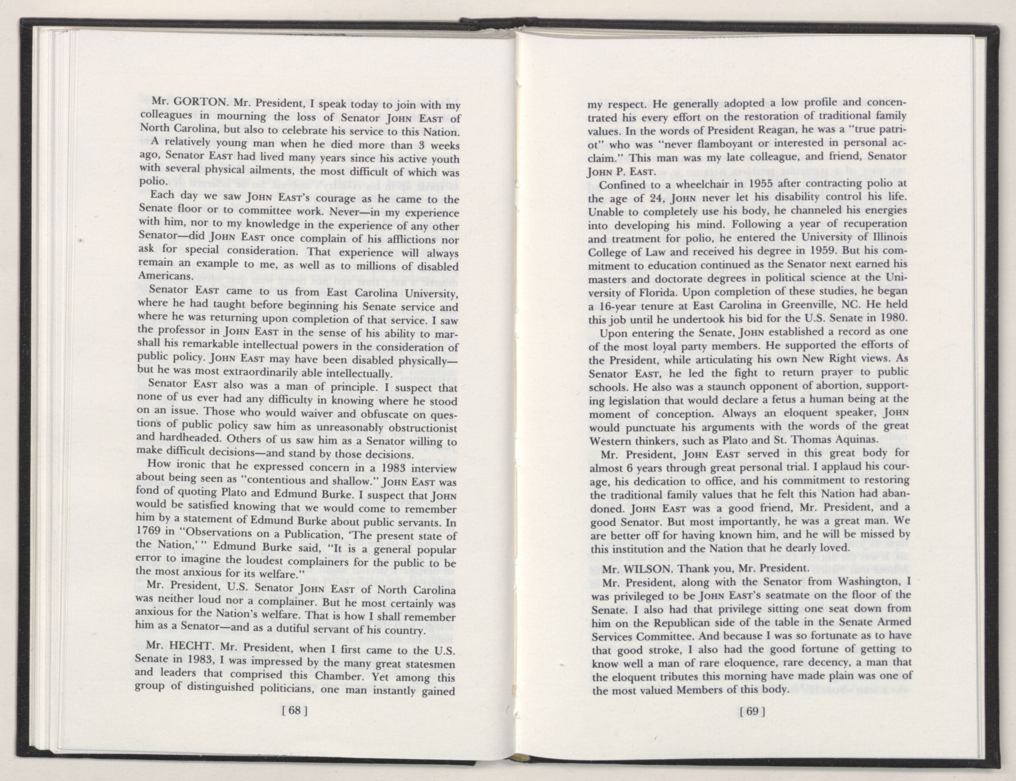 “No senator ever had a finer colleague than JOHN EAST,” Helms said. “I've never known a man with more compassion than Senator EAST.”