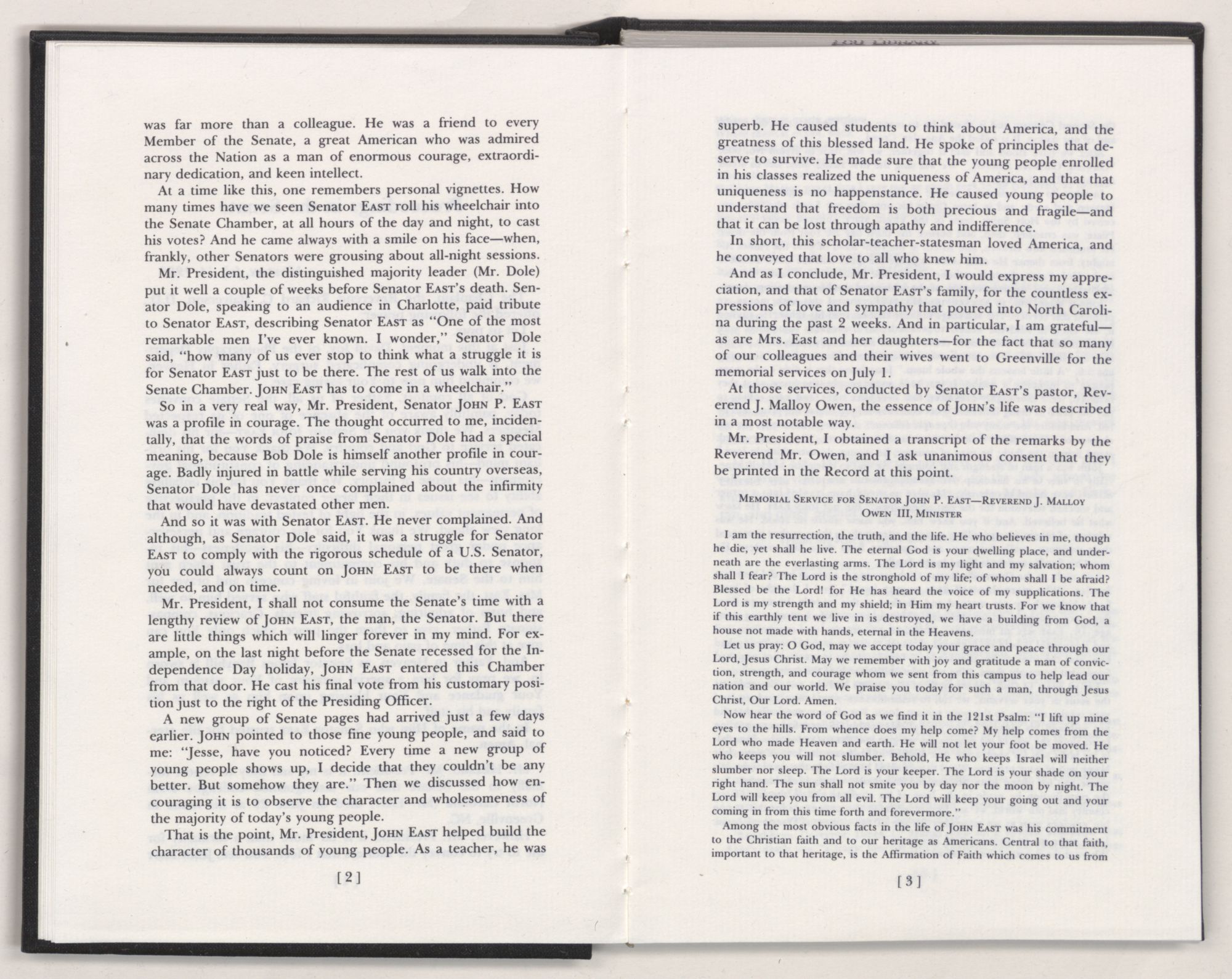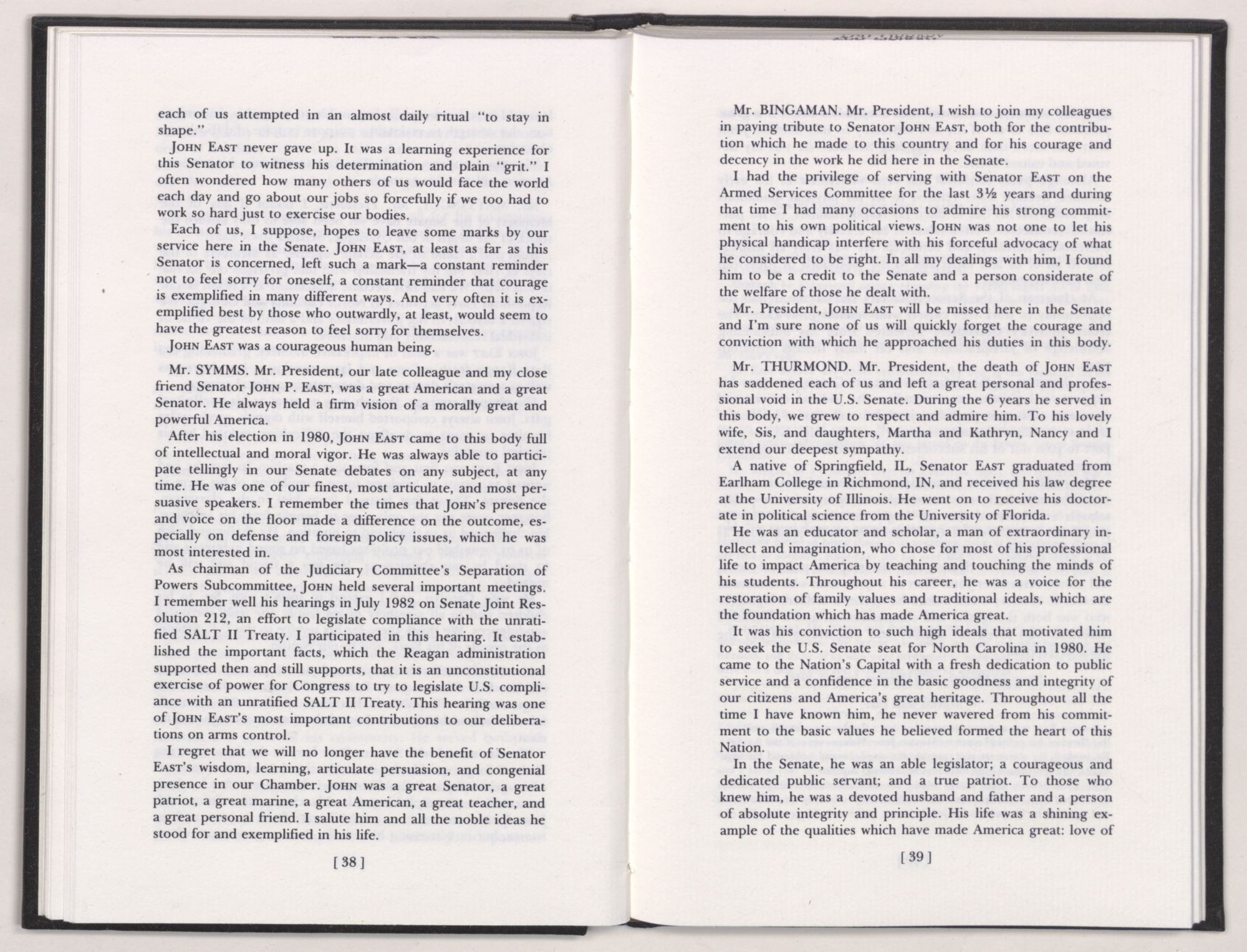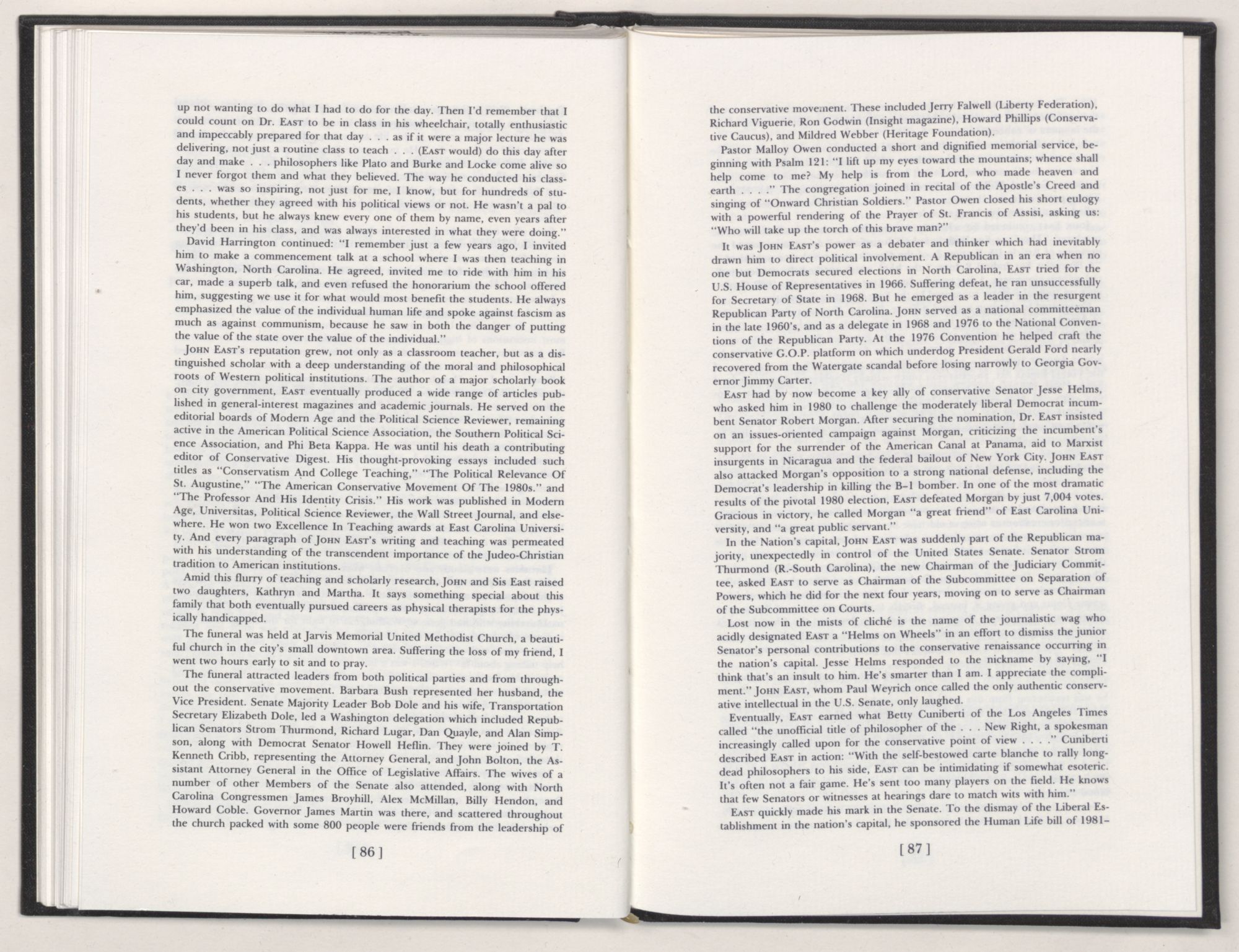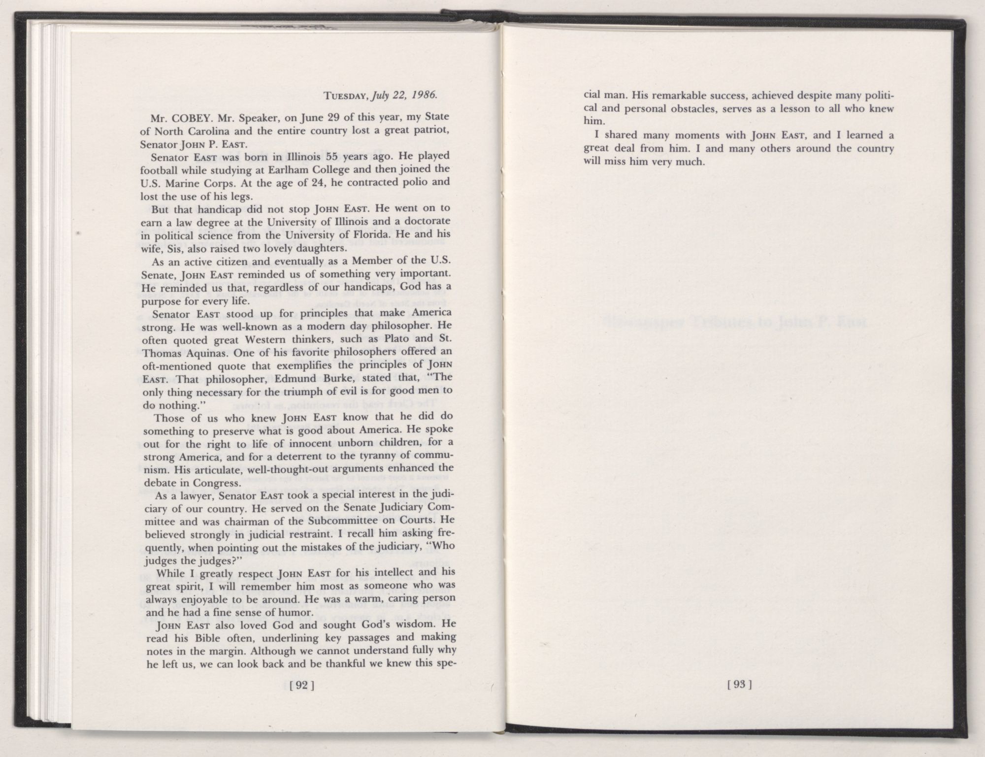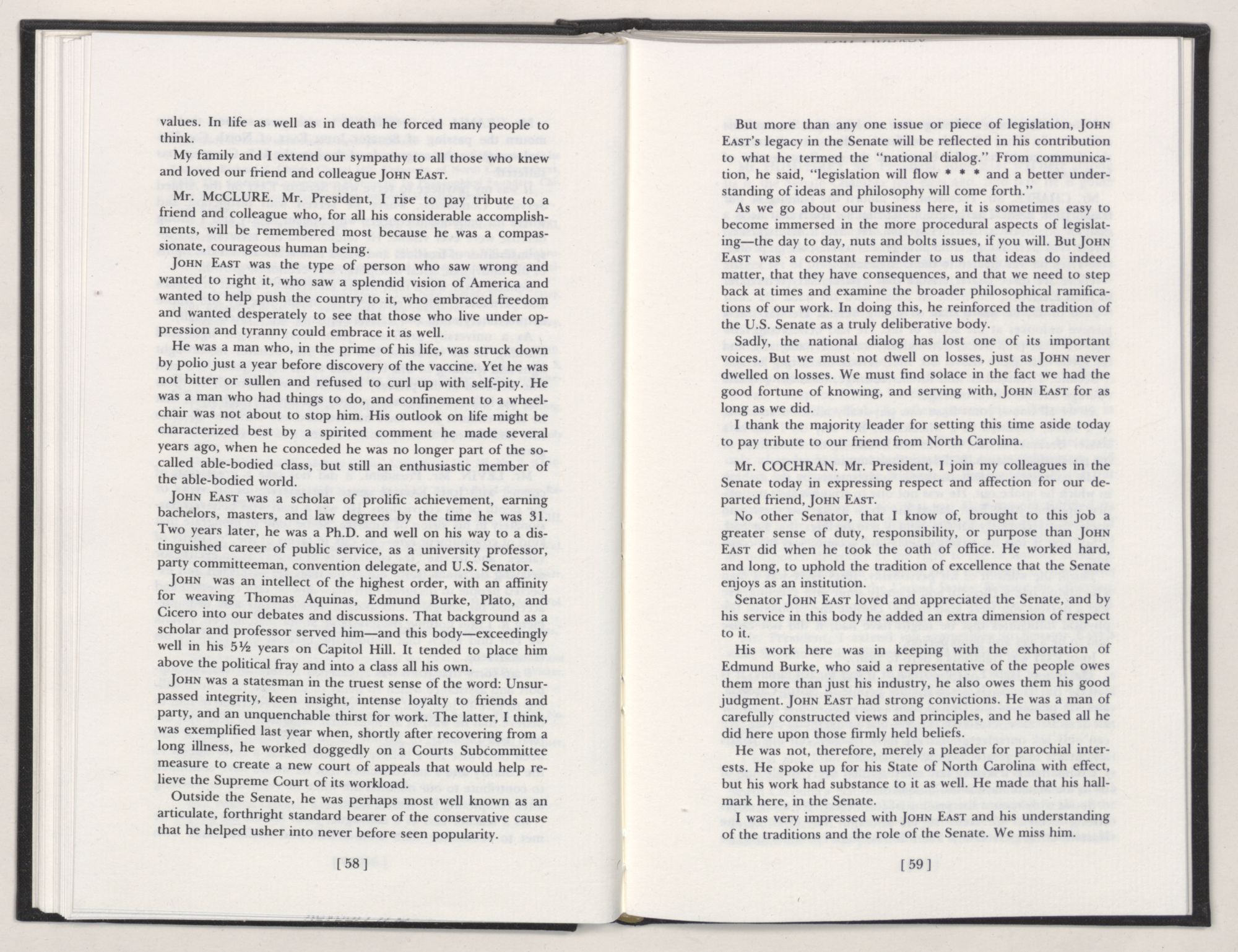 “No senator ever had a finer colleague than JOHN EAST,” Helms said. “I've never known a man with more compassion than Senator EAST.”