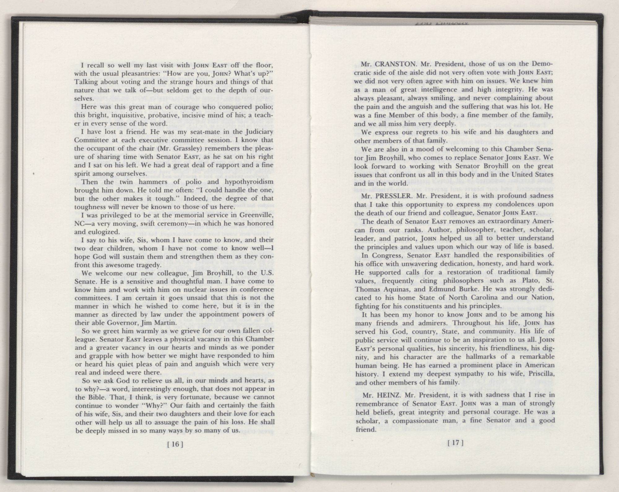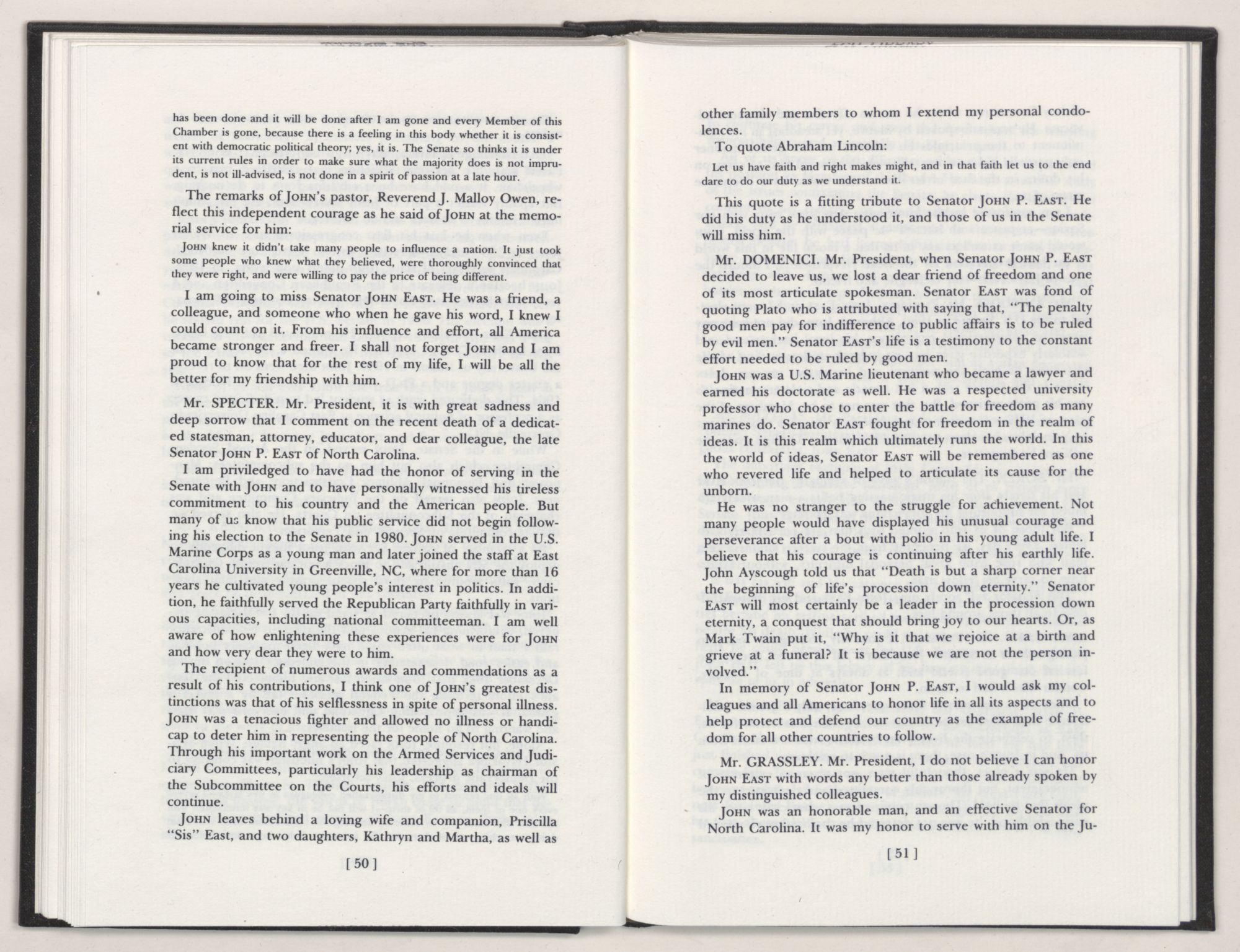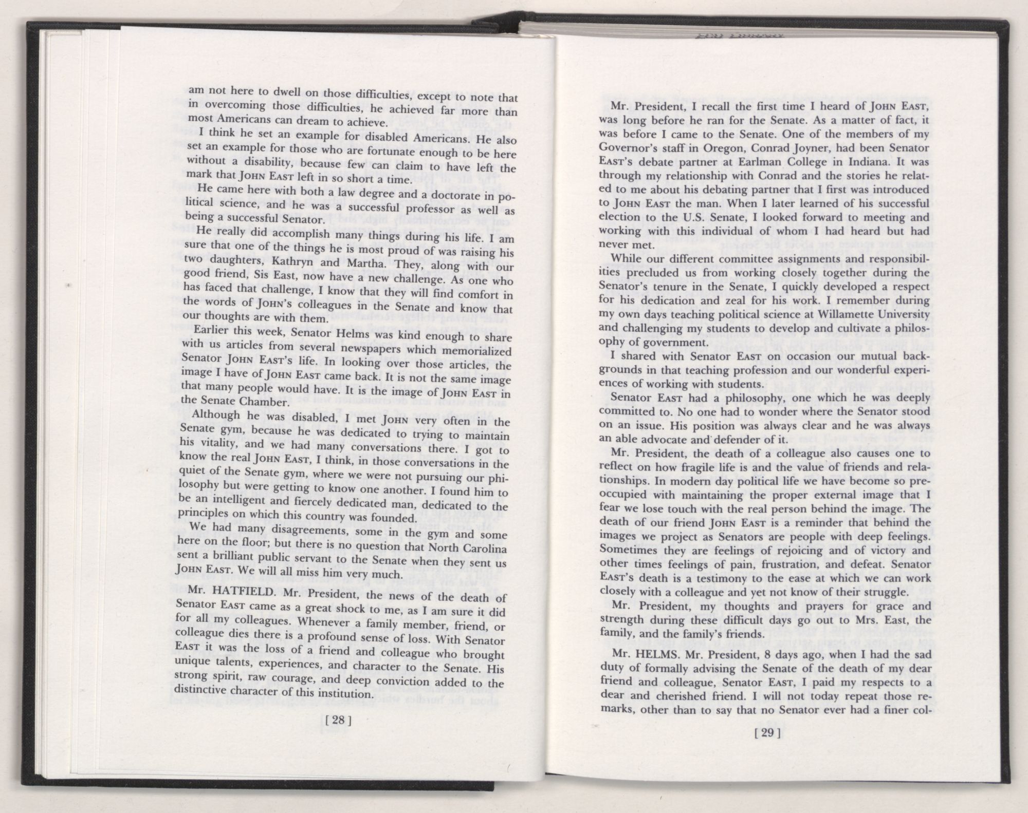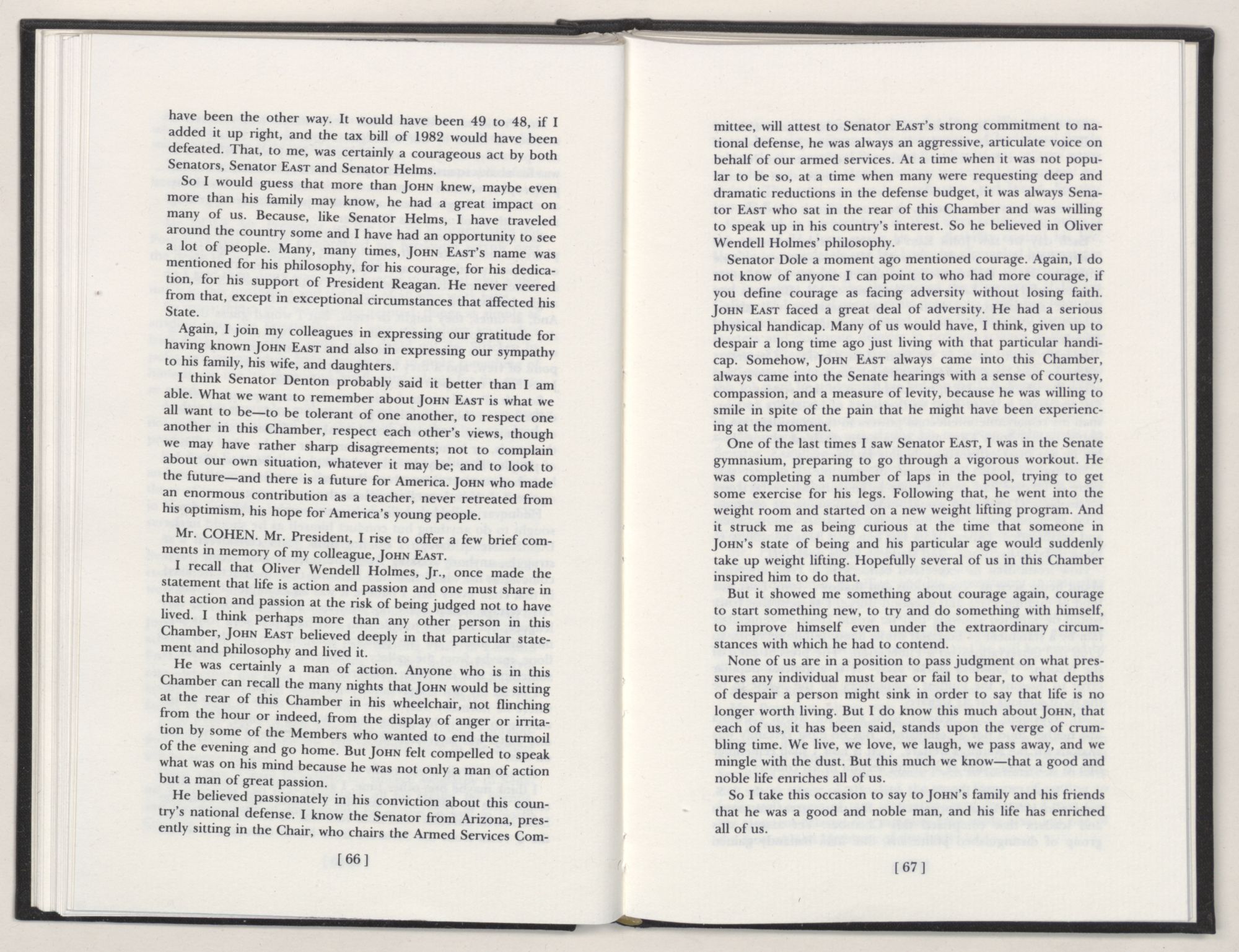 “No senator ever had a finer colleague than JOHN EAST,” Helms said. “I've never known a man with more compassion than Senator EAST.”