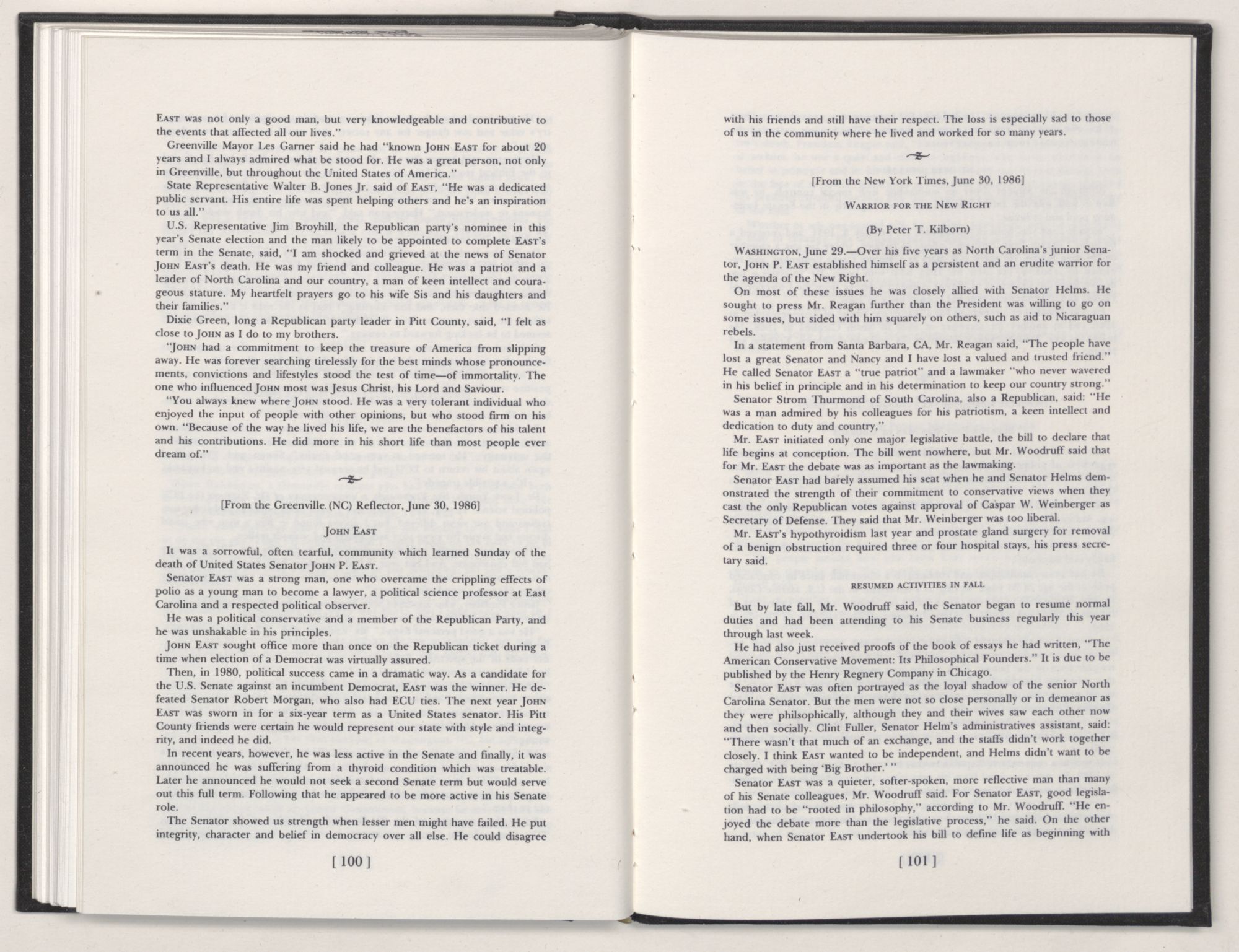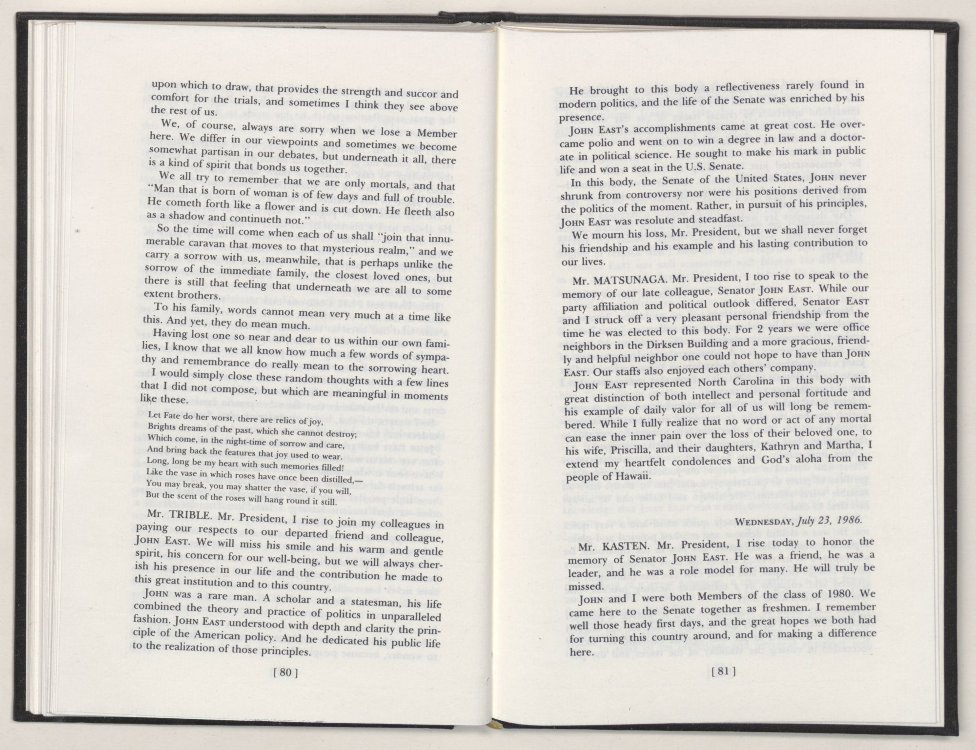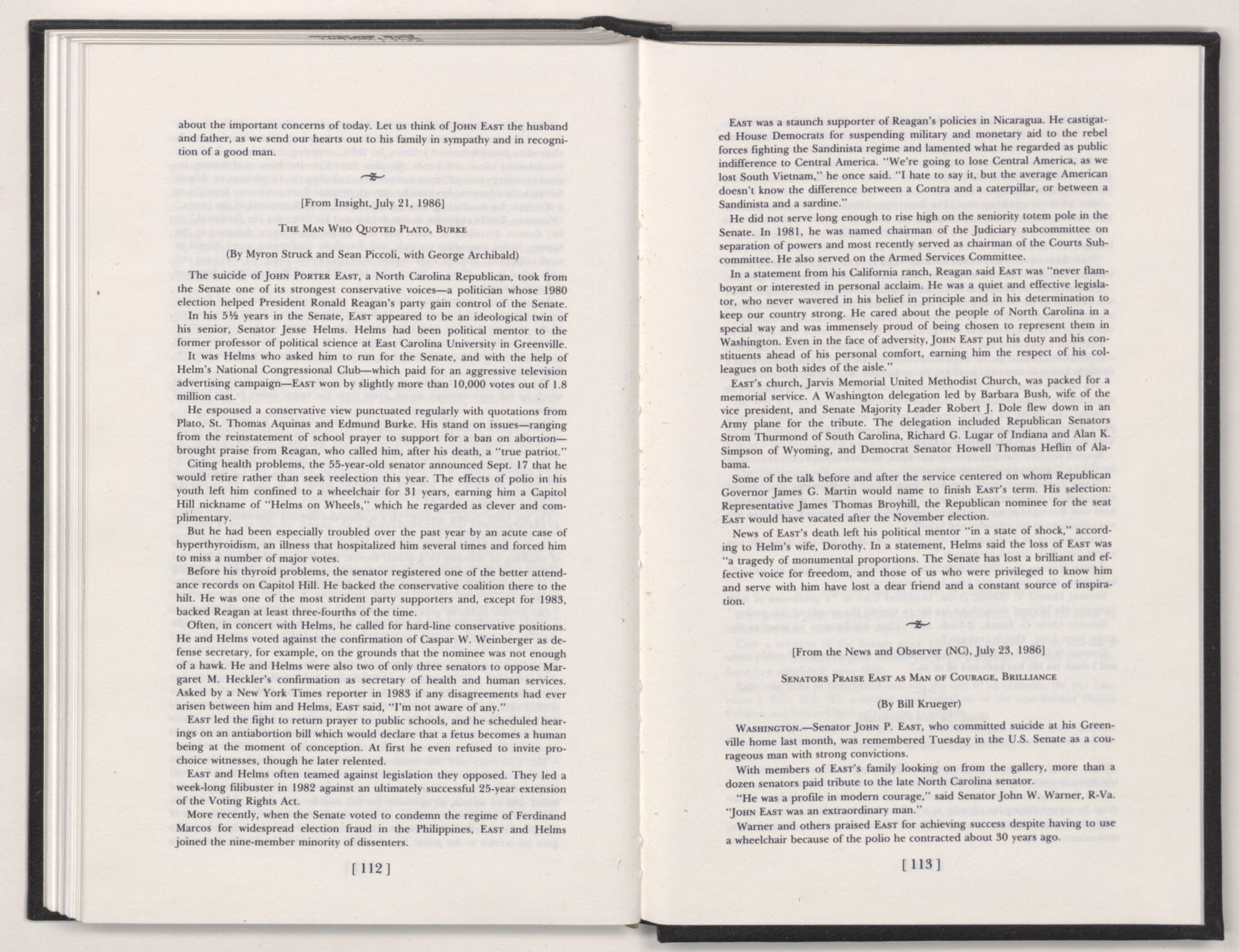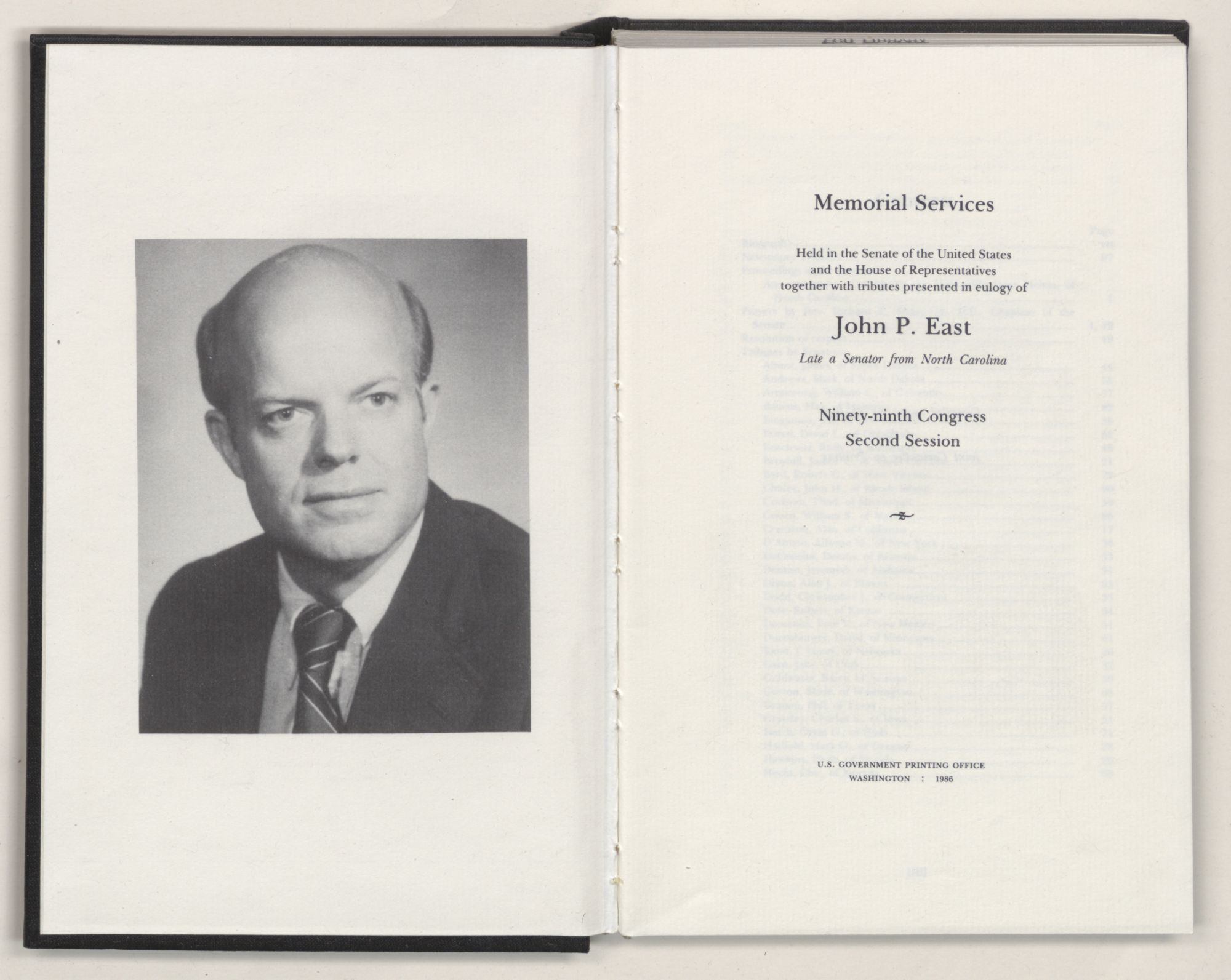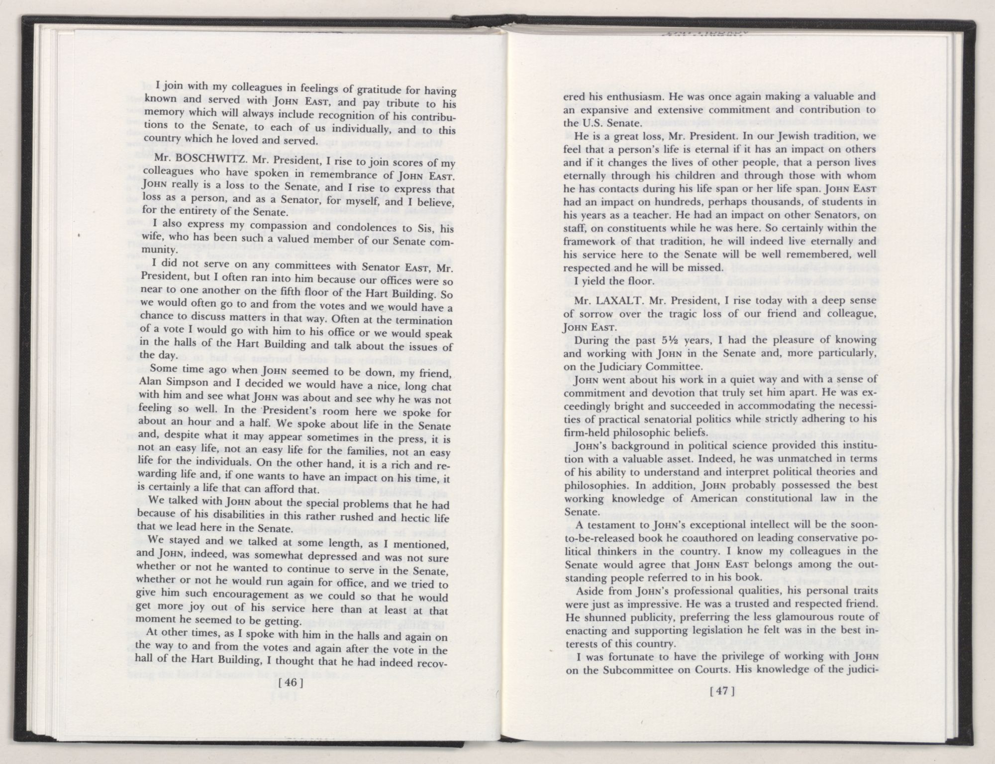 “No senator ever had a finer colleague than JOHN EAST,” Helms said. “I've never known a man with more compassion than Senator EAST.”