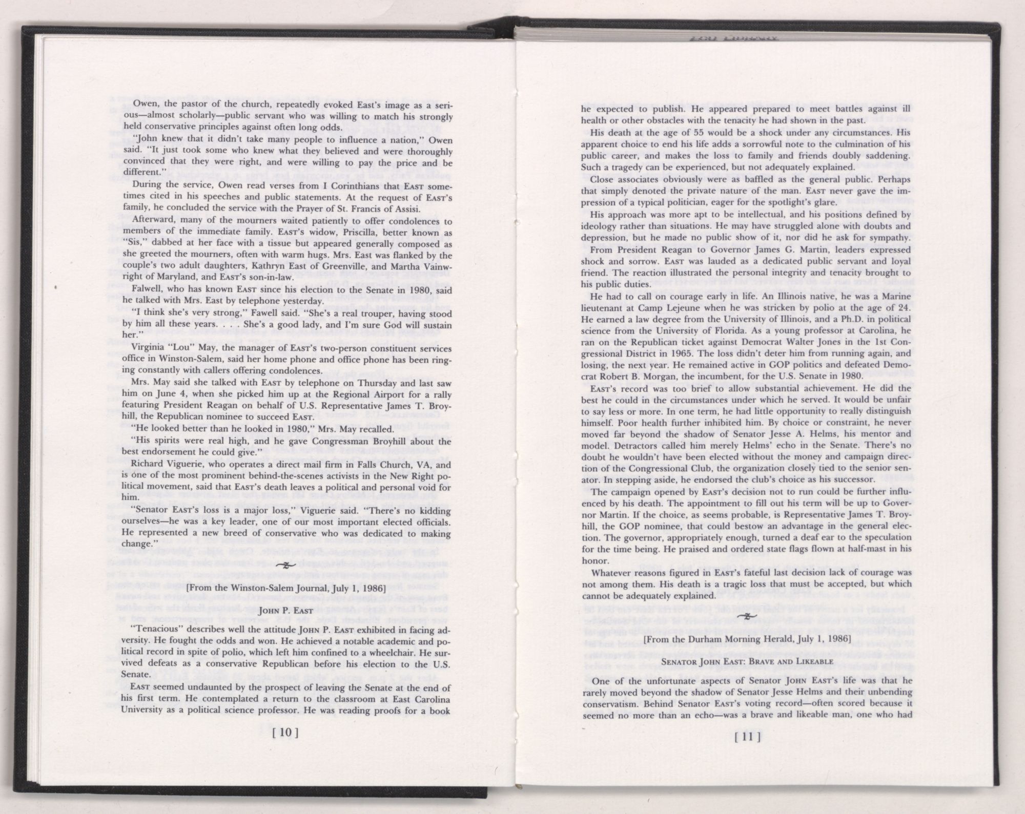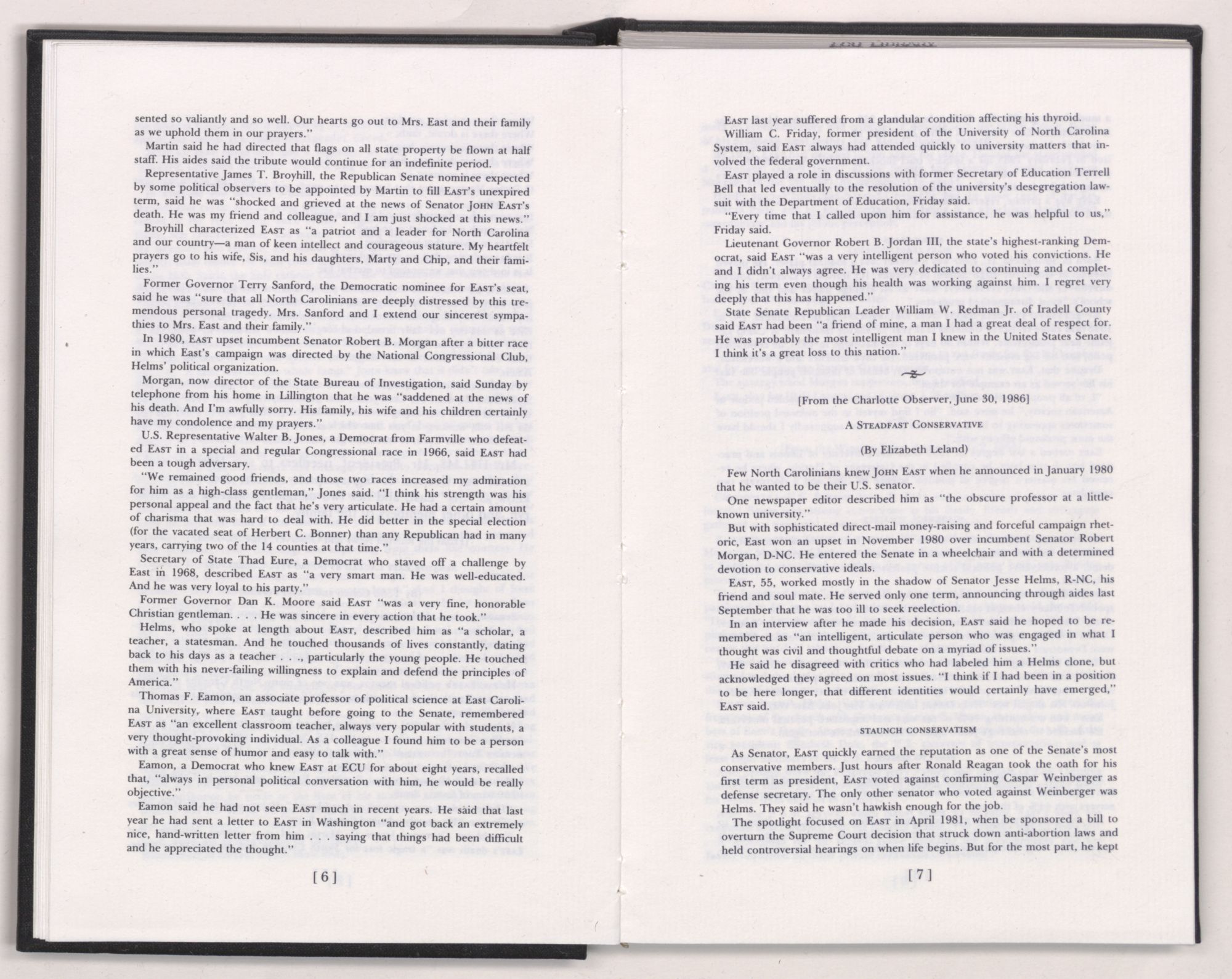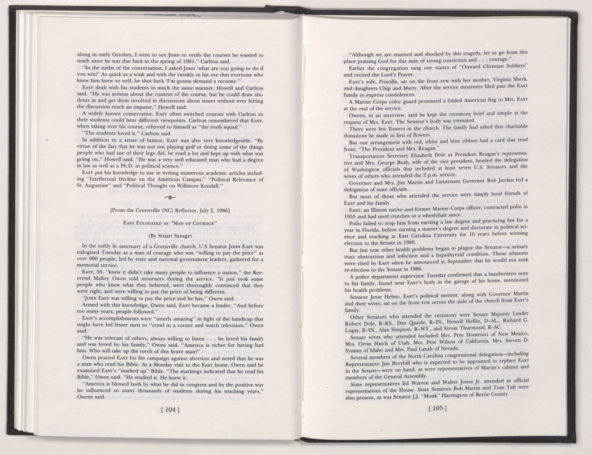 In a statement from his California ranch, Reagan said EAST was “never flamboyant or interested in personal acclaim. He was a quiet and effective legislator, who never wavered in his belief in principle and in his determination to keep our country strong. He cared about the people of North Carolina in a special way and was immensely proud of being chosen to represent them in Washington. Even in the face of adversity, JOHN EAST put his duty and his constituents ahead of his personal comfort, earning him the respect of his colleagues on both sides of the aisle.”