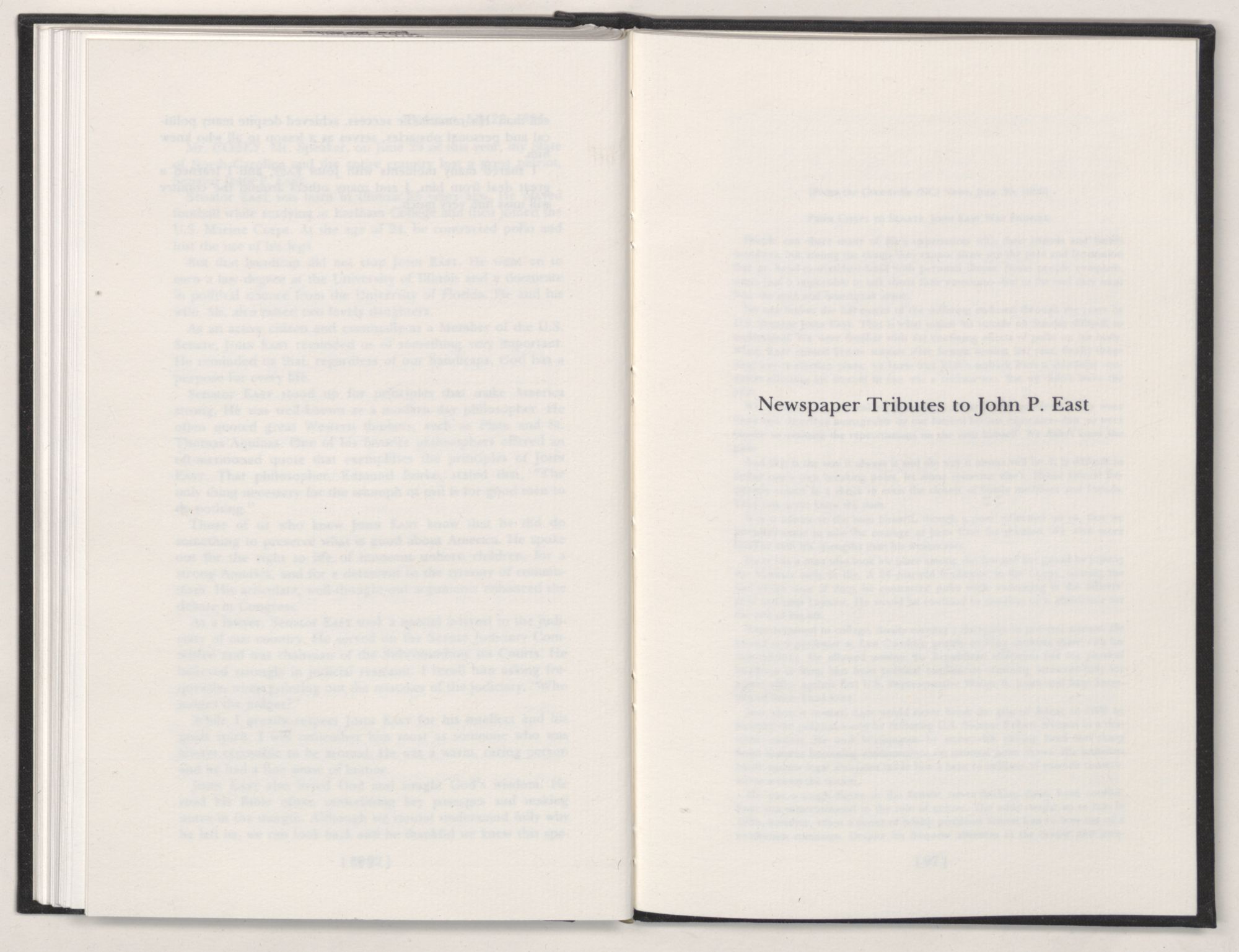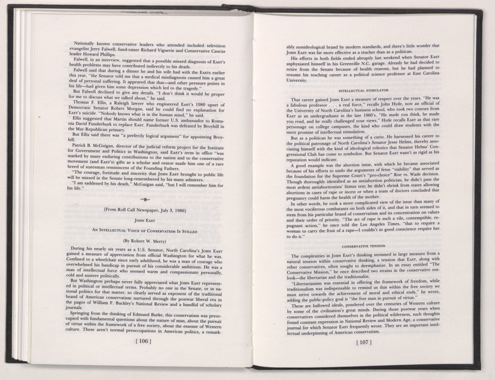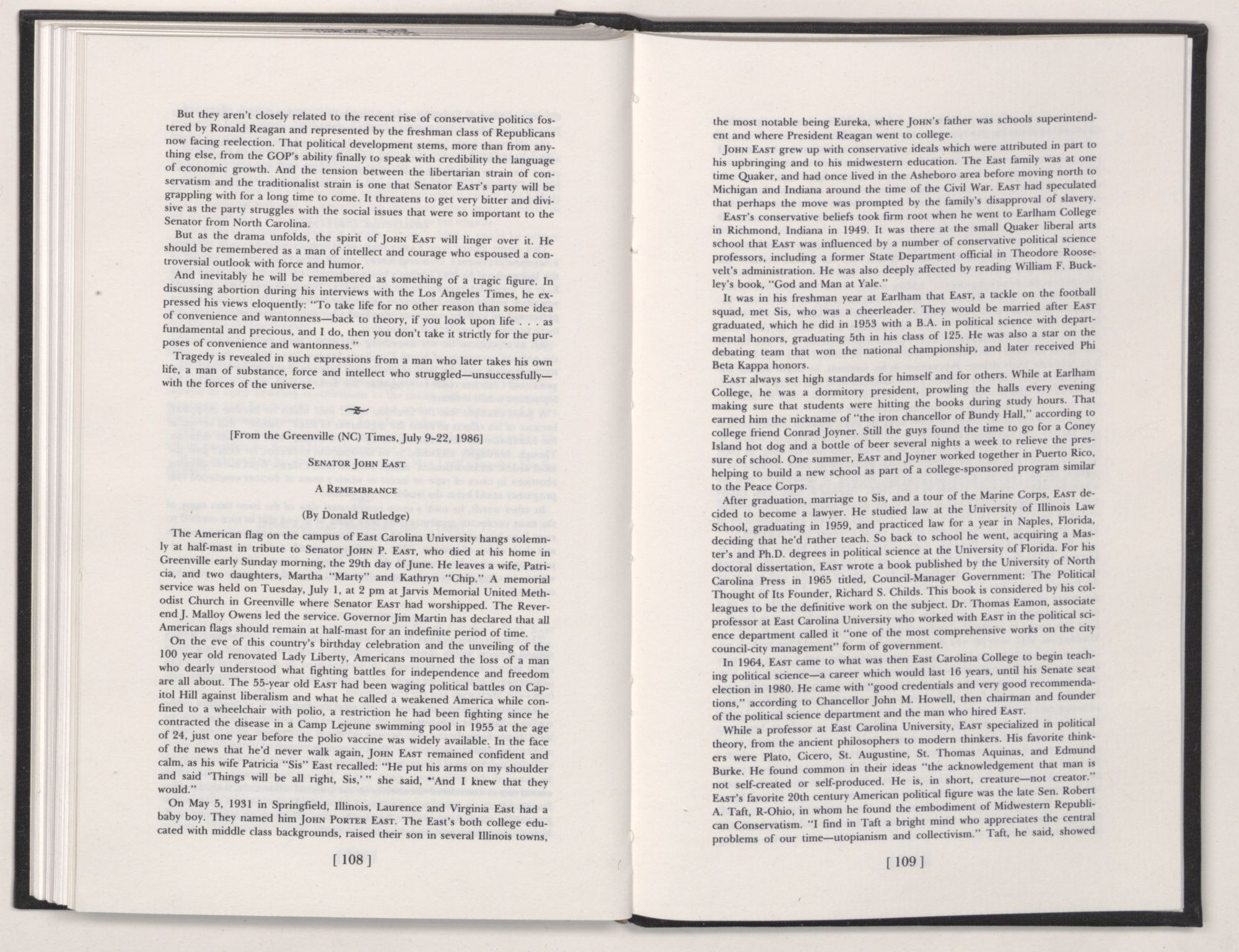 In a statement from his California ranch, Reagan said EAST was “never flamboyant or interested in personal acclaim. He was a quiet and effective legislator, who never wavered in his belief in principle and in his determination to keep our country strong. He cared about the people of North Carolina in a special way and was immensely proud of being chosen to represent them in Washington. Even in the face of adversity, JOHN EAST put his duty and his constituents ahead of his personal comfort, earning him the respect of his colleagues on both sides of the aisle.”