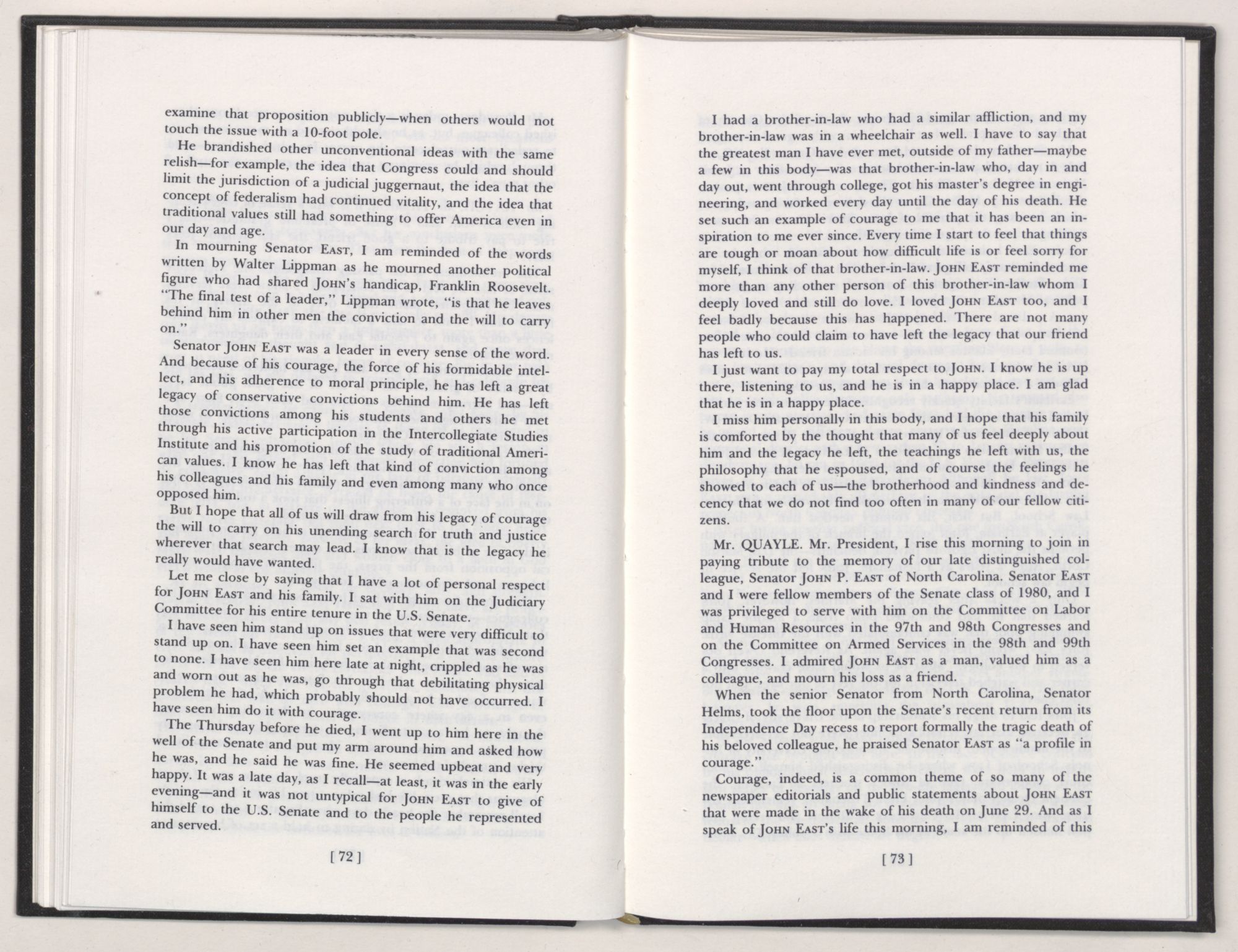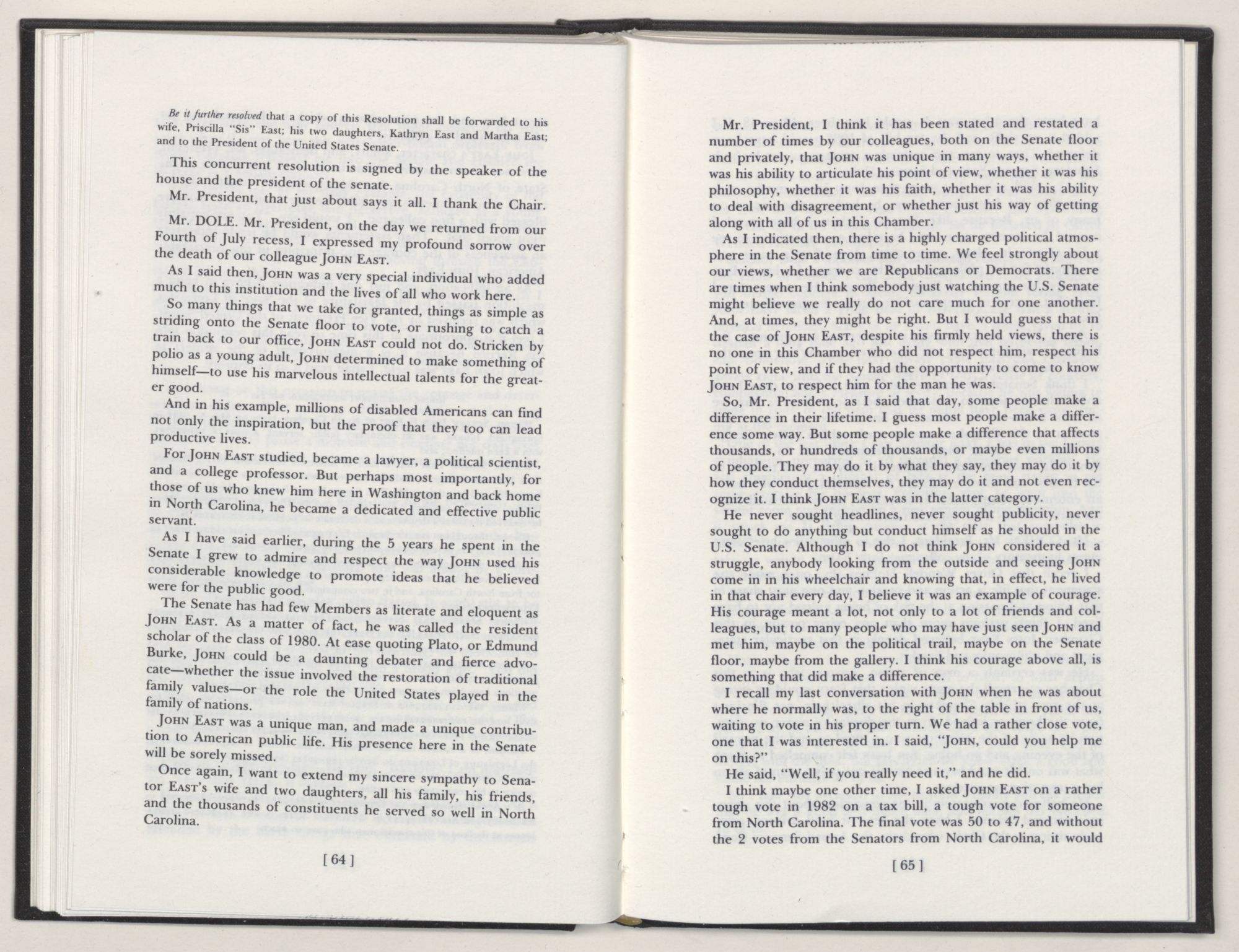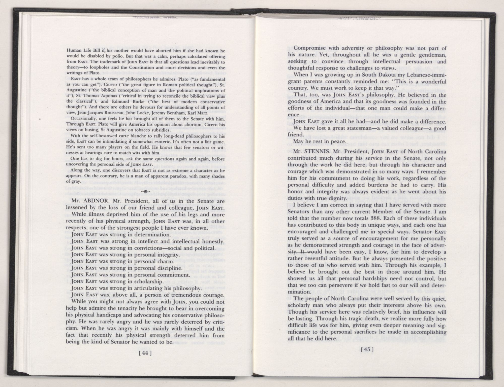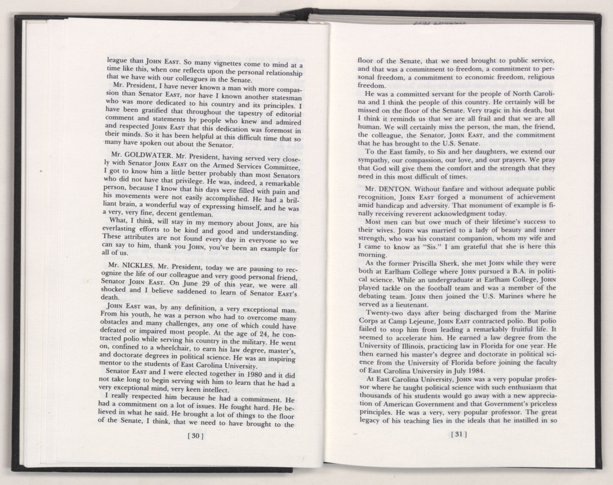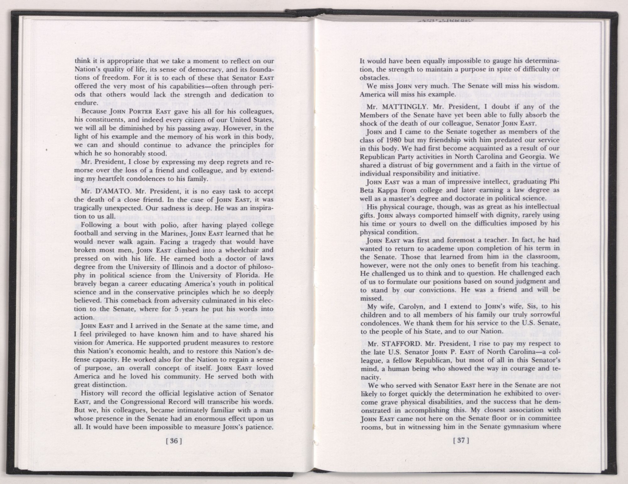 “I think he set an example for disabled Americans,” said Senator Ted Stevens, R-Alaska. “There is no question that North Carolina sent a brilliant public servant to the Senate when they sent us JOHN EAST.”