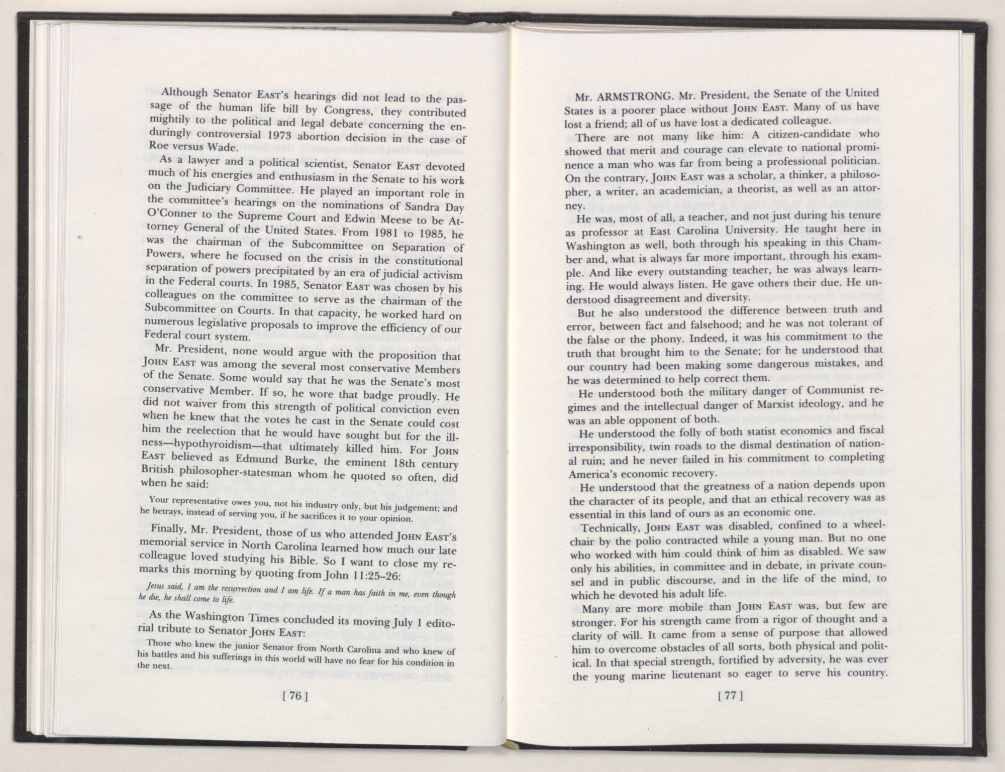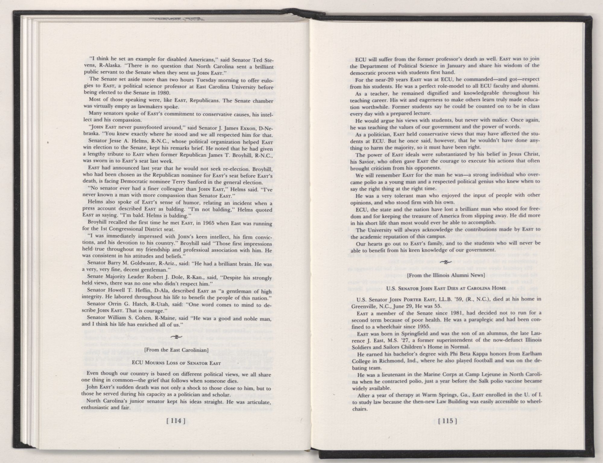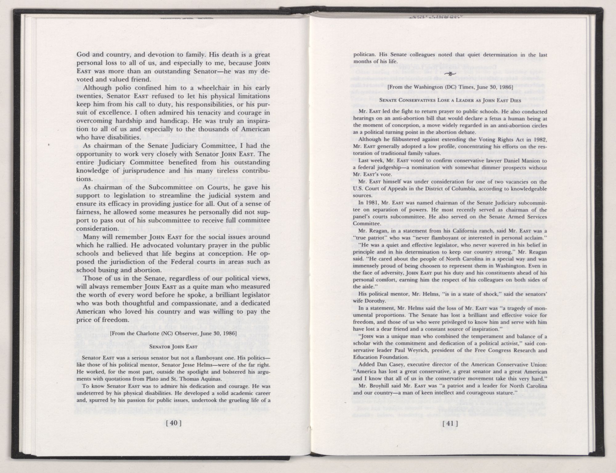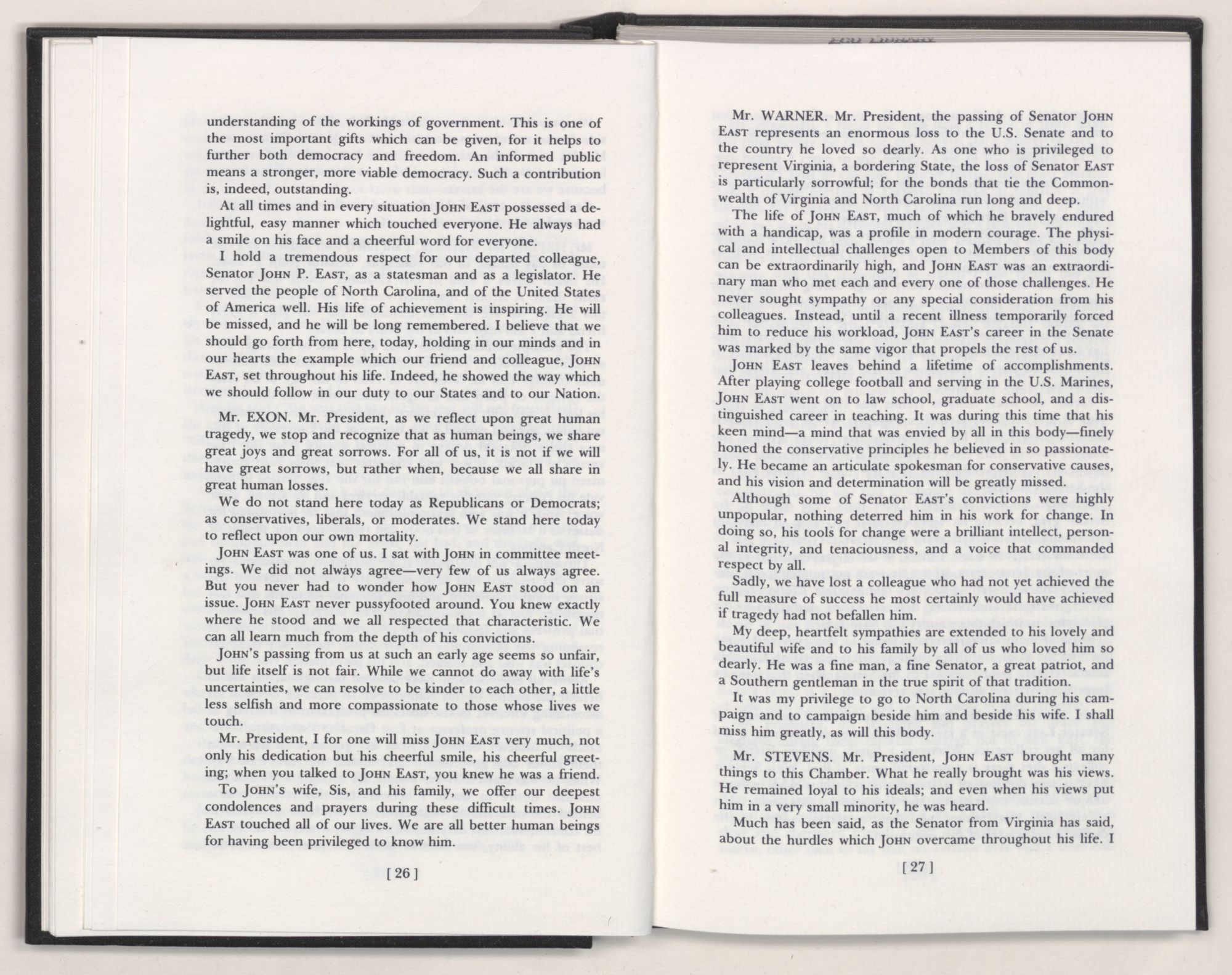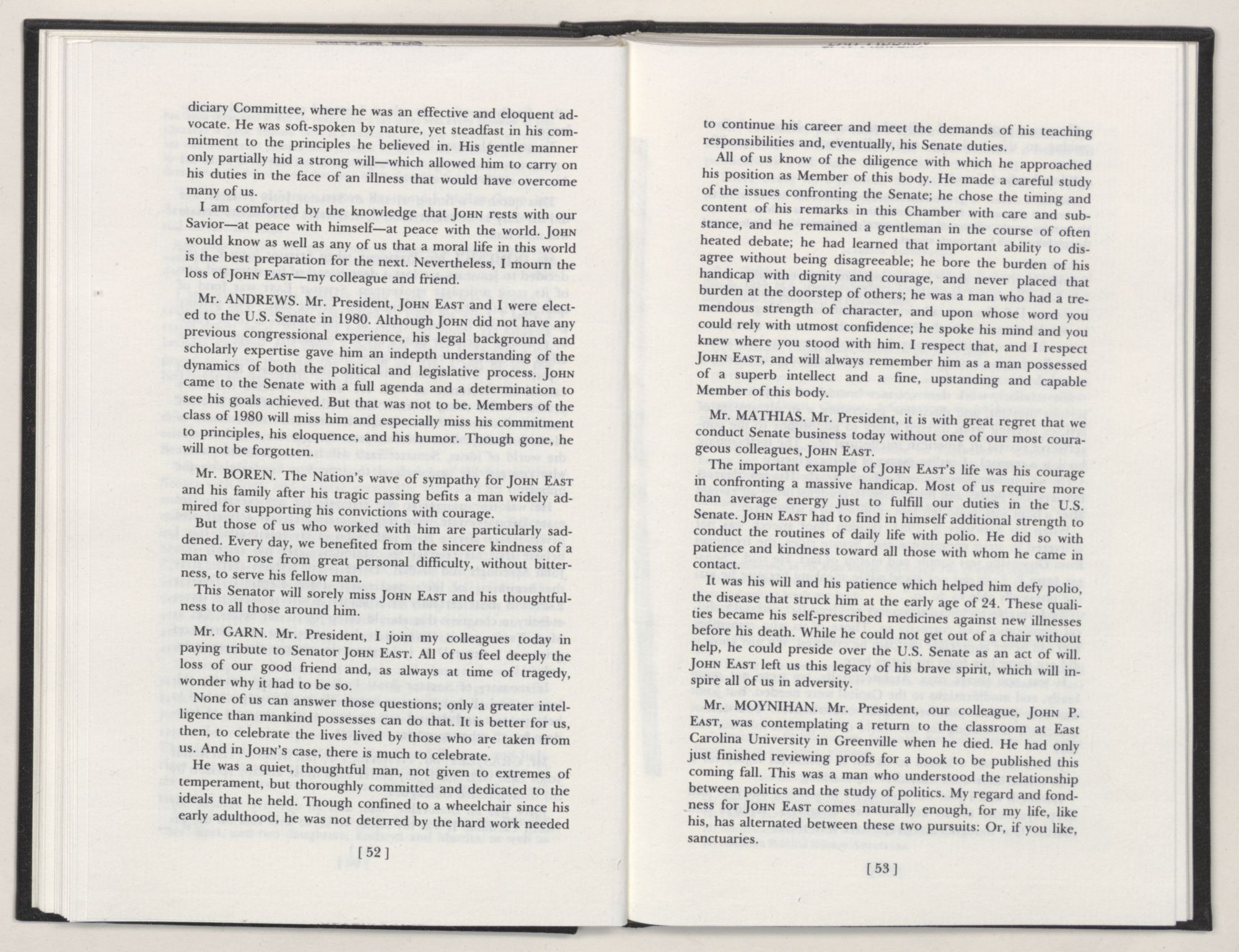 “I think he set an example for disabled Americans,” said Senator Ted Stevens, R-Alaska. “There is no question that North Carolina sent a brilliant public servant to the Senate when they sent us JOHN EAST.”