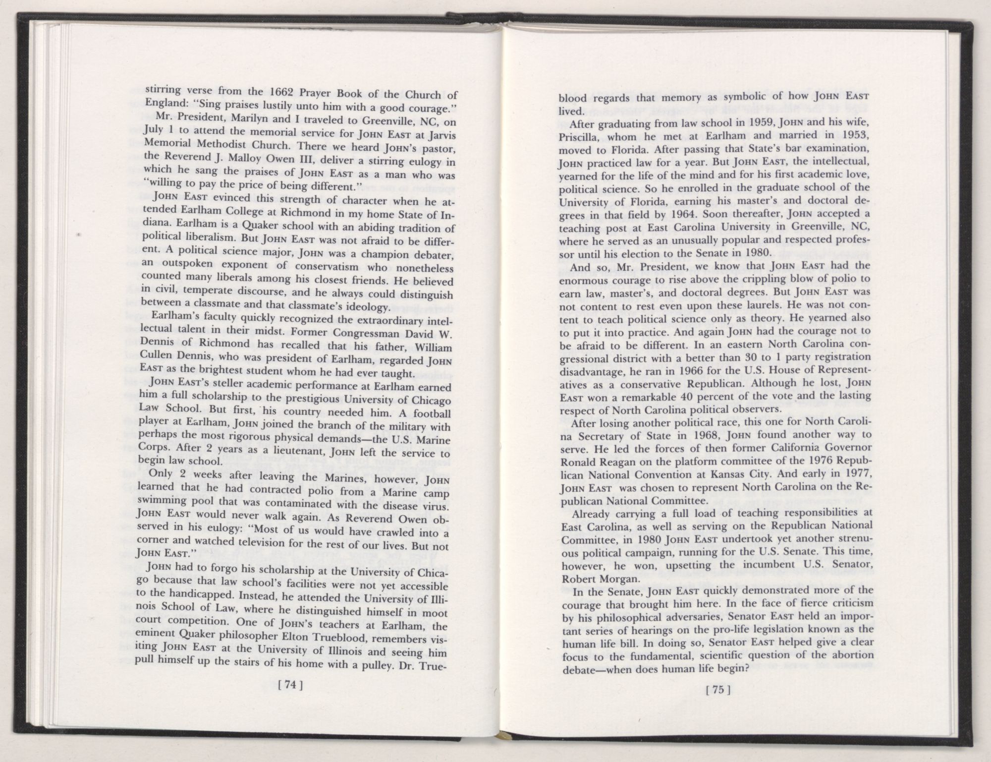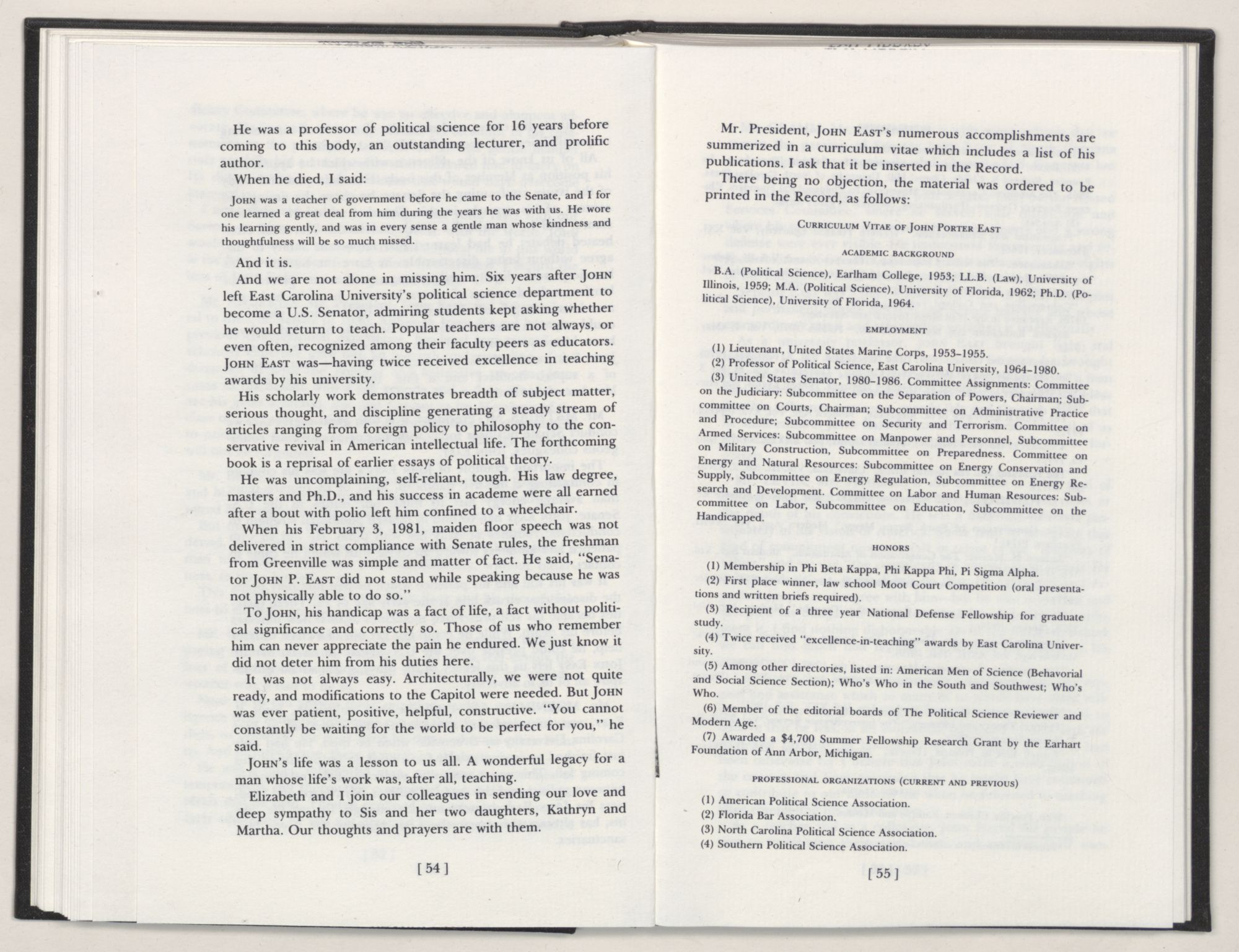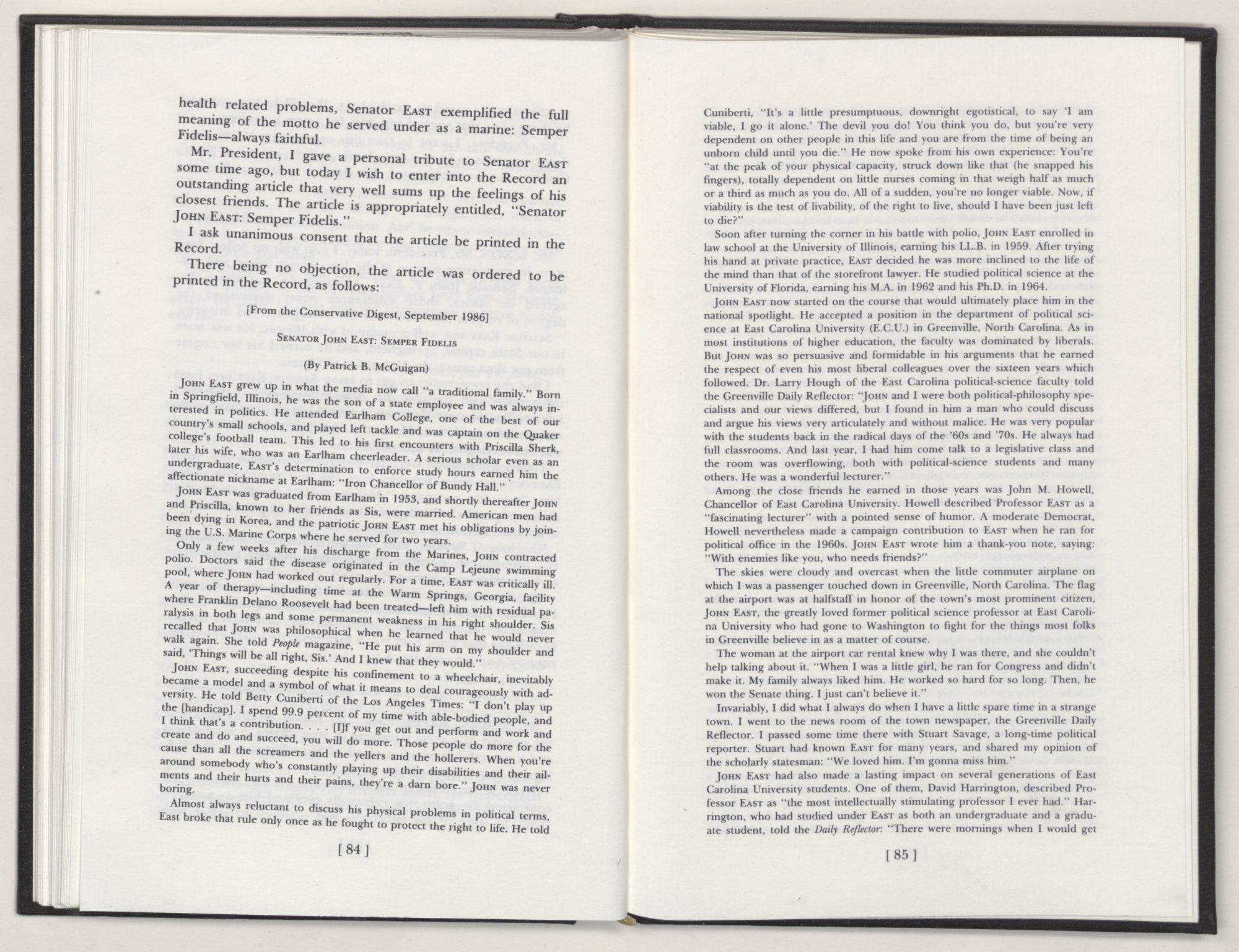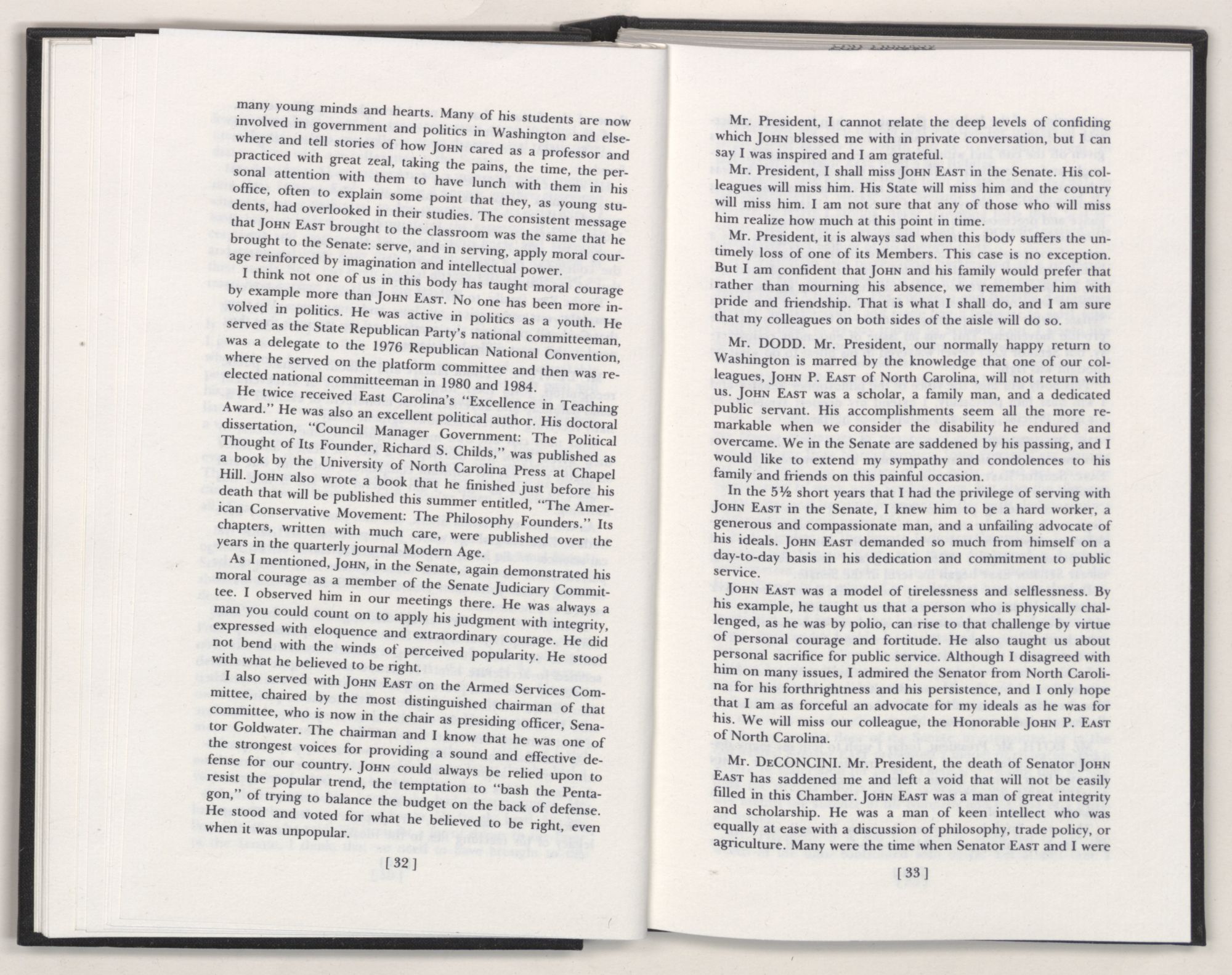 “I think he set an example for disabled Americans,” said Senator Ted Stevens, R-Alaska. “There is no question that North Carolina sent a brilliant public servant to the Senate when they sent us JOHN EAST.”
