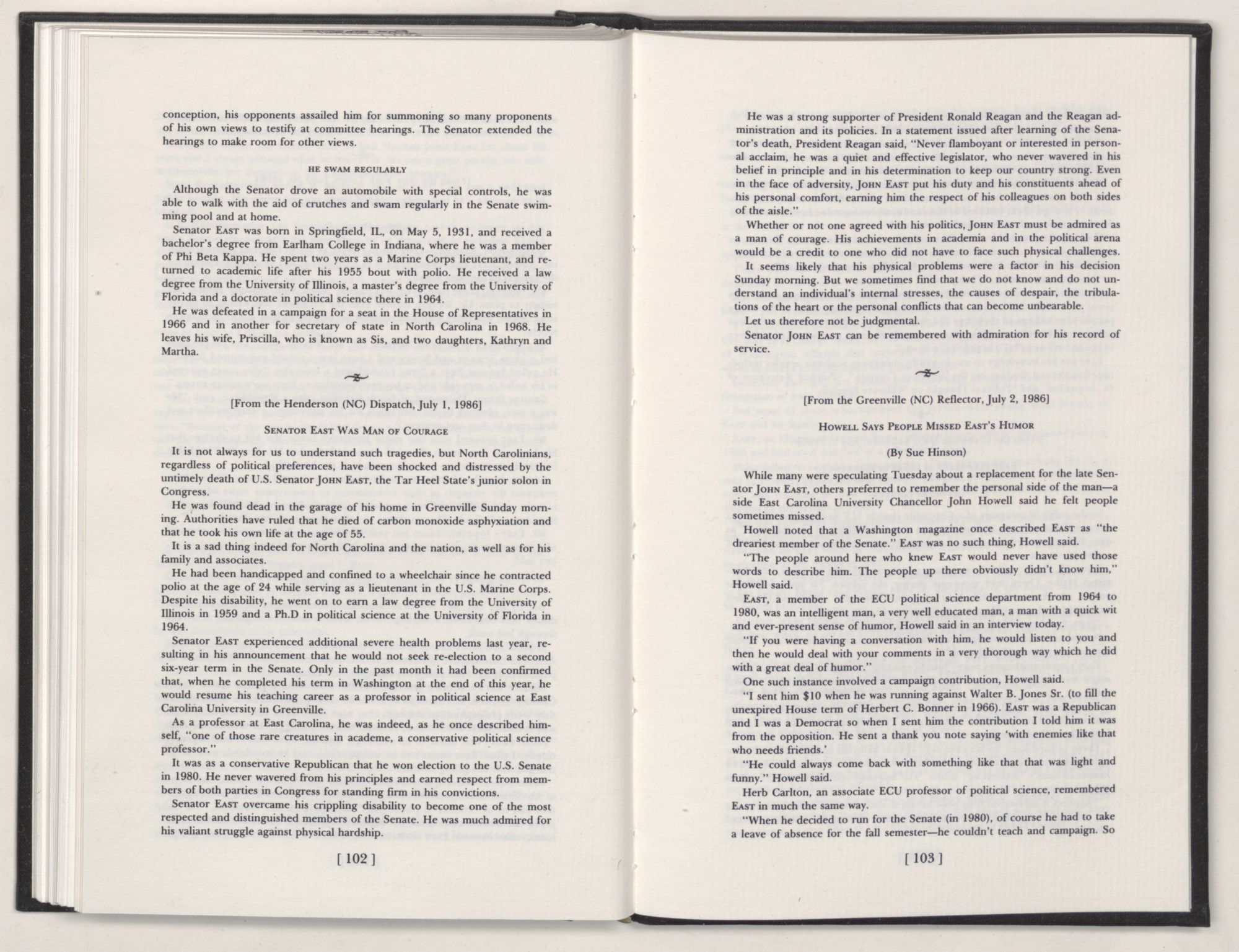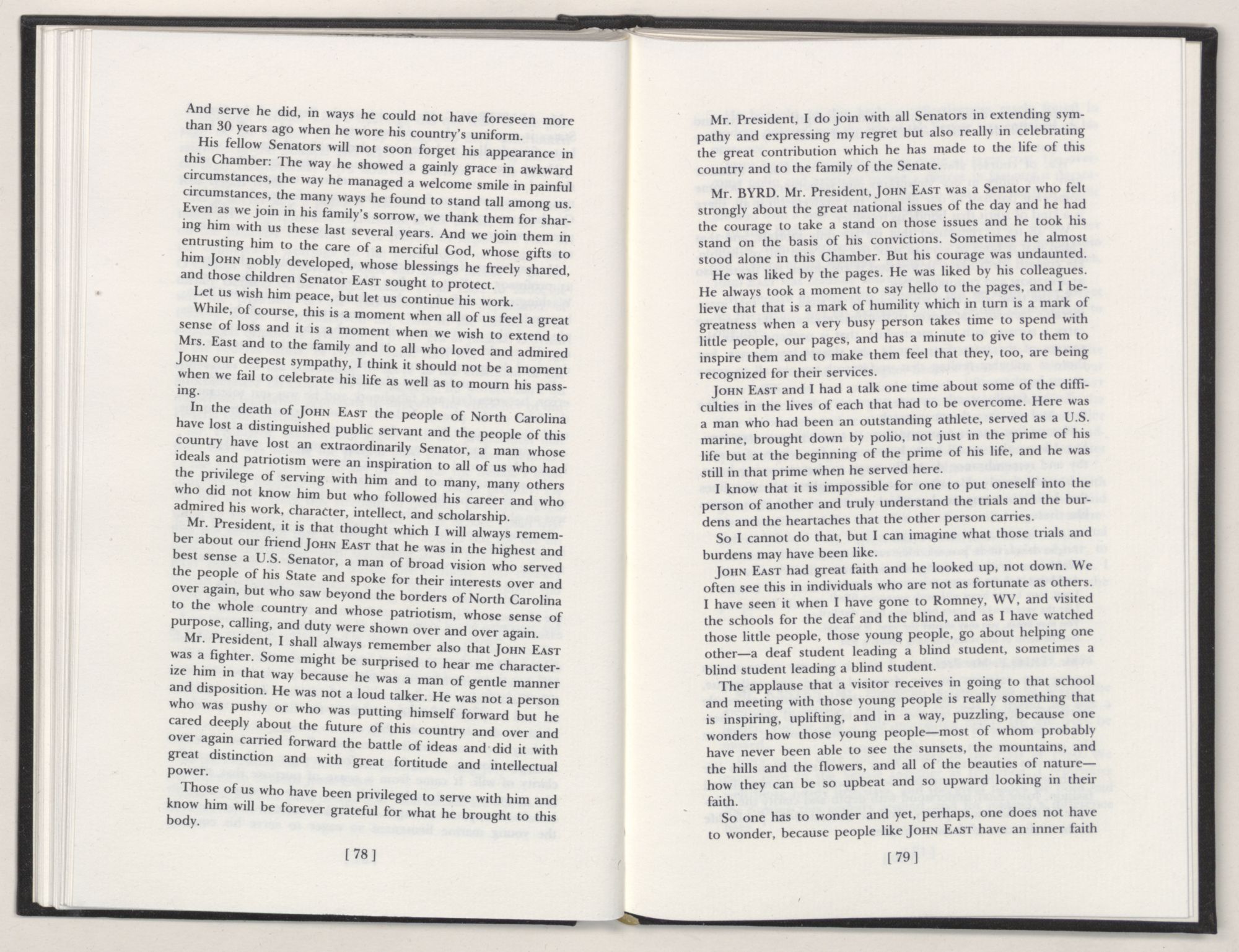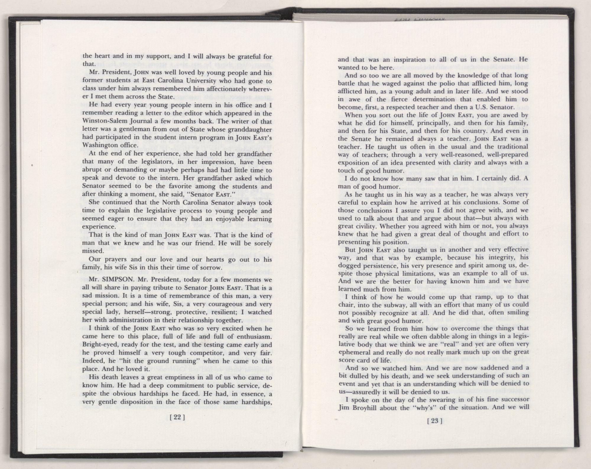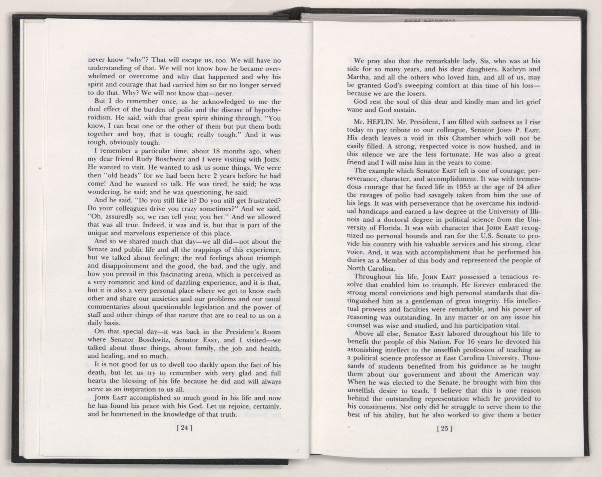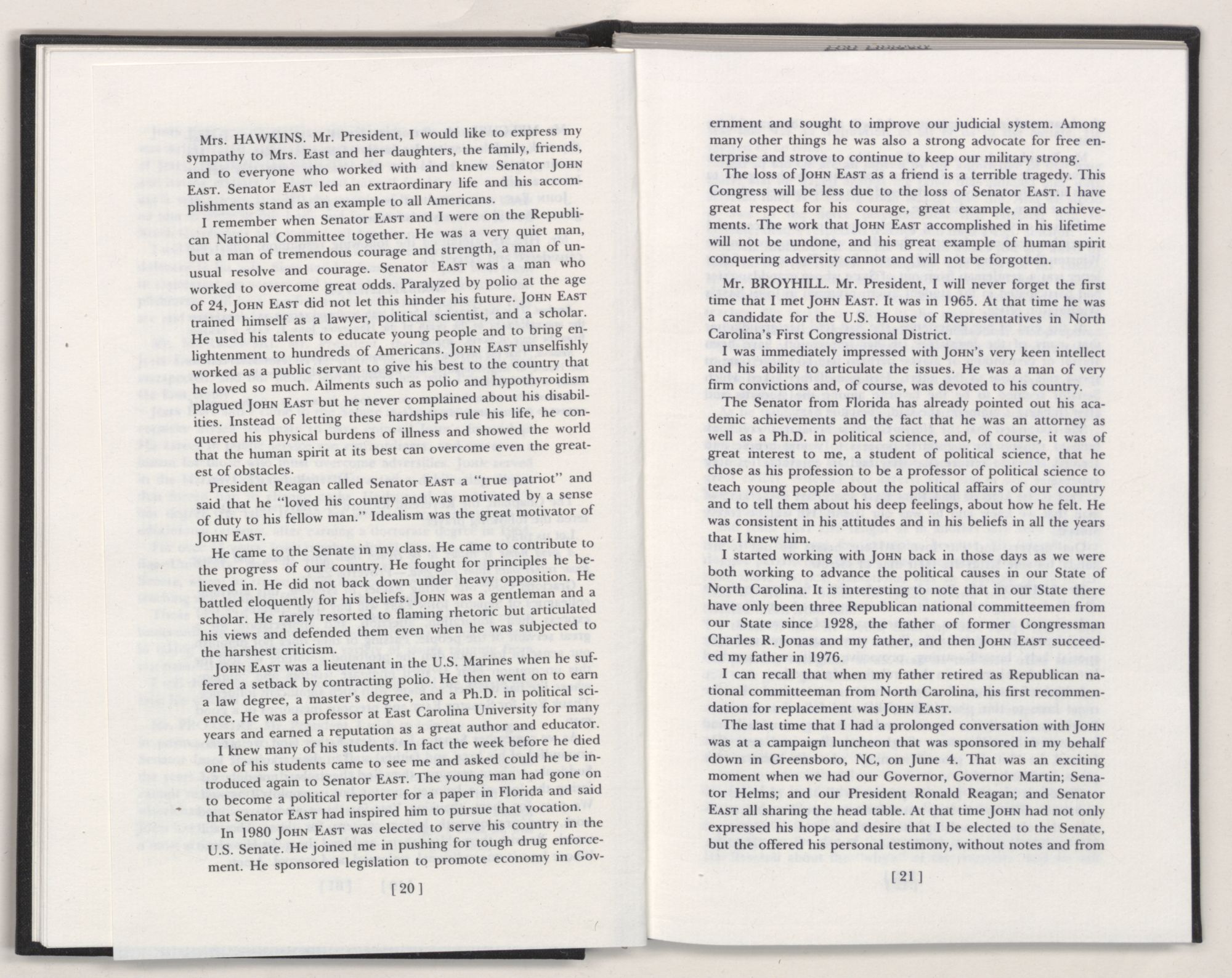 “I think he set an example for disabled Americans,” said Senator Ted Stevens, R-Alaska. “There is no question that North Carolina sent a brilliant public servant to the Senate when they sent us JOHN EAST.”