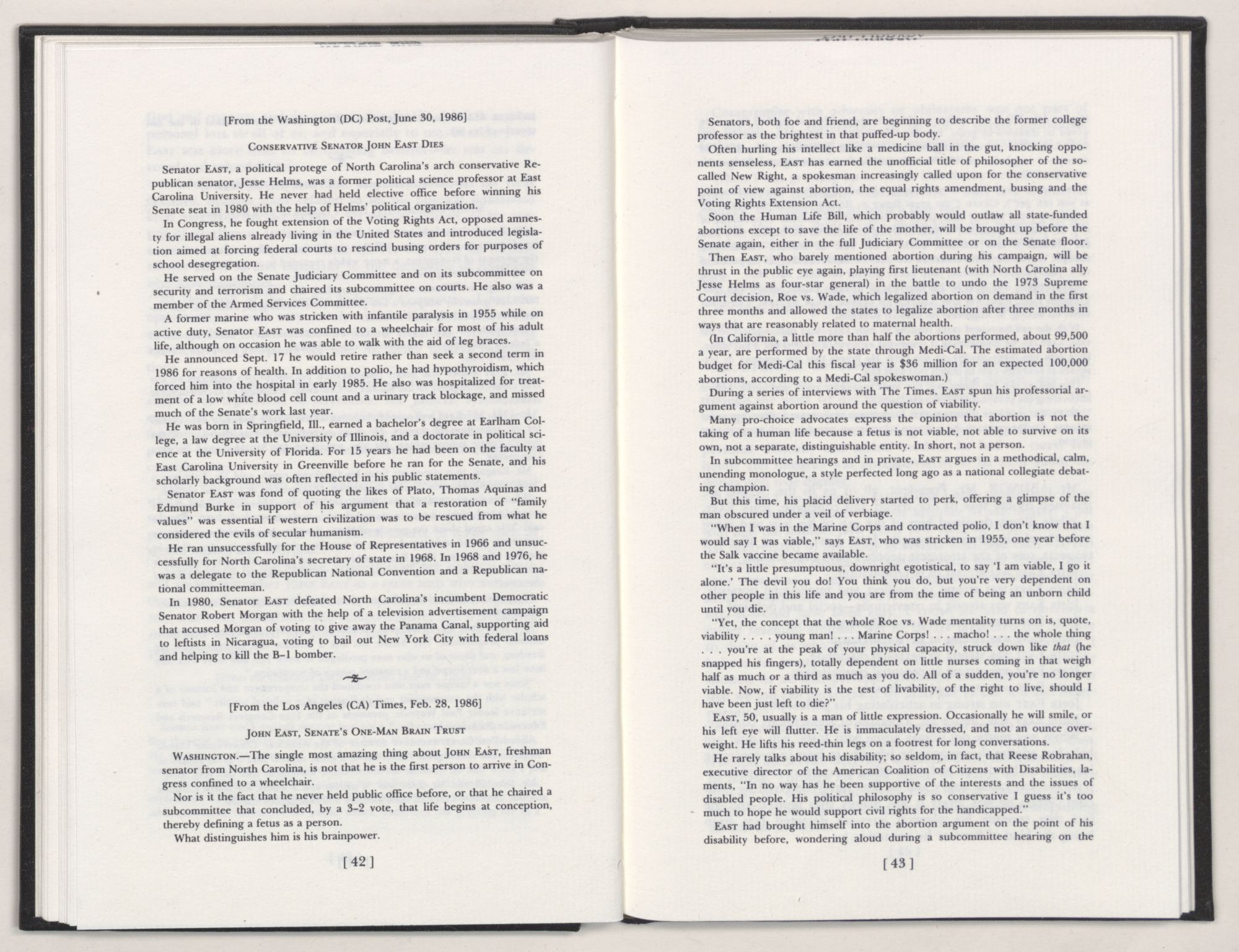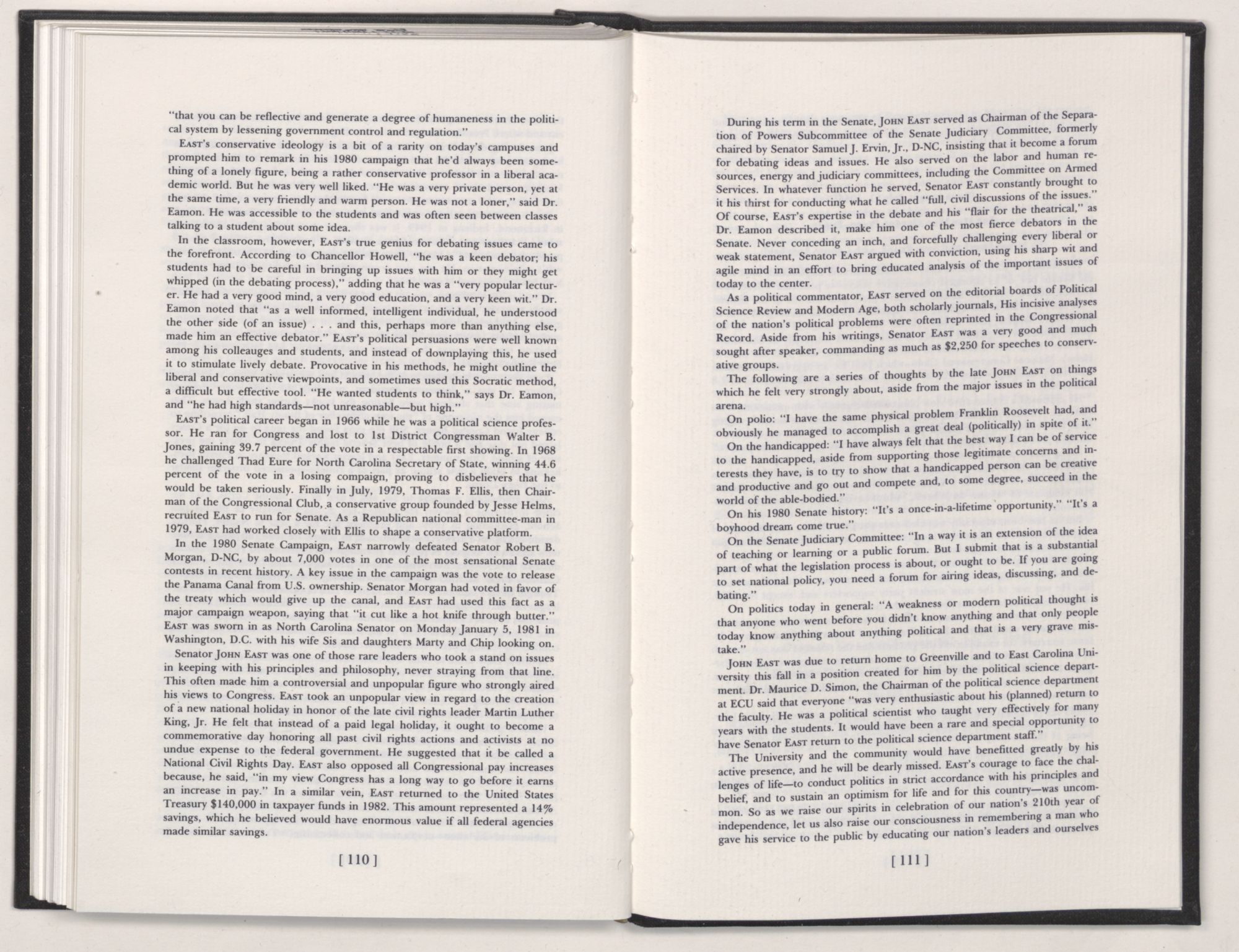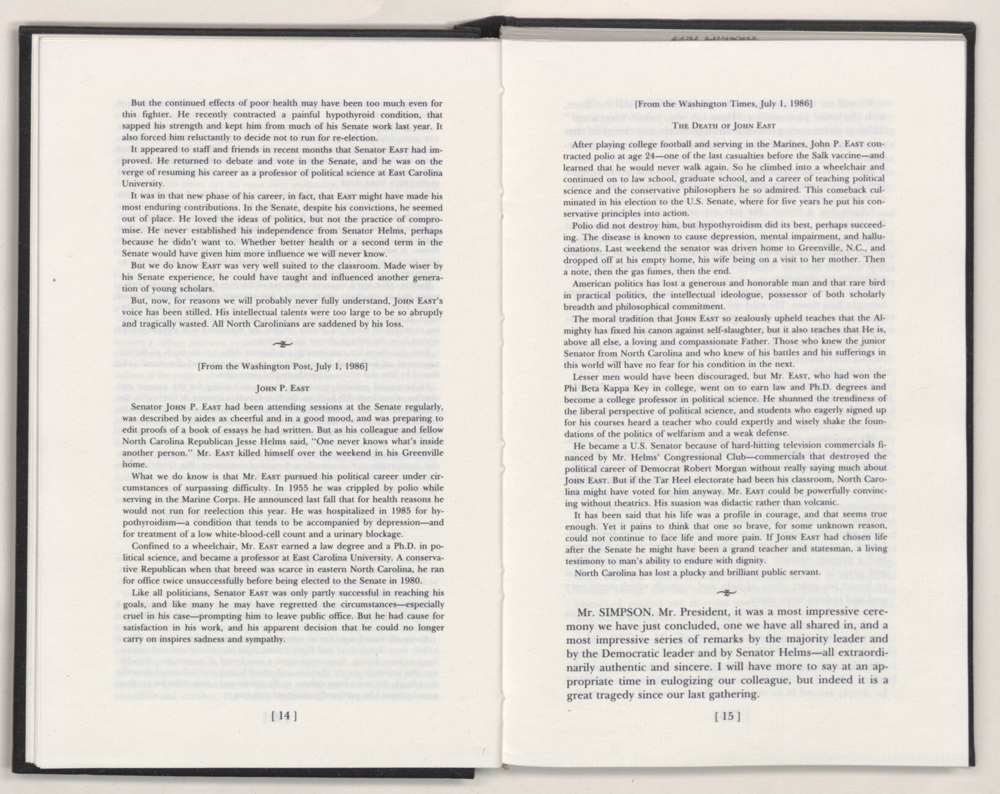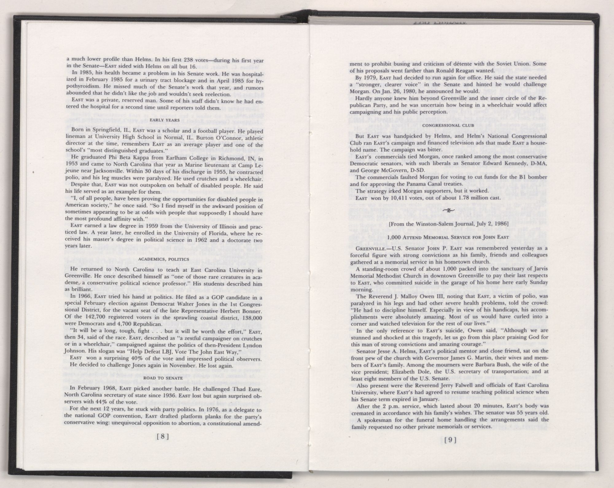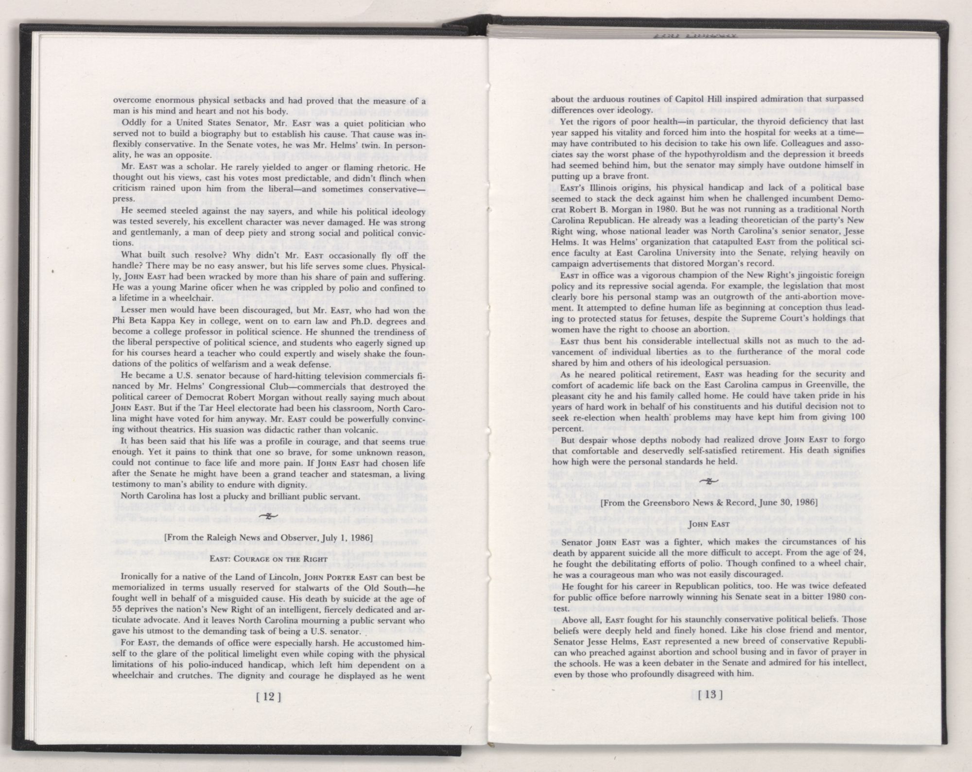 “I think he set an example for disabled Americans,” said Senator Ted Stevens, R-Alaska. “There is no question that North Carolina sent a brilliant public servant to the Senate when they sent us JOHN EAST.”