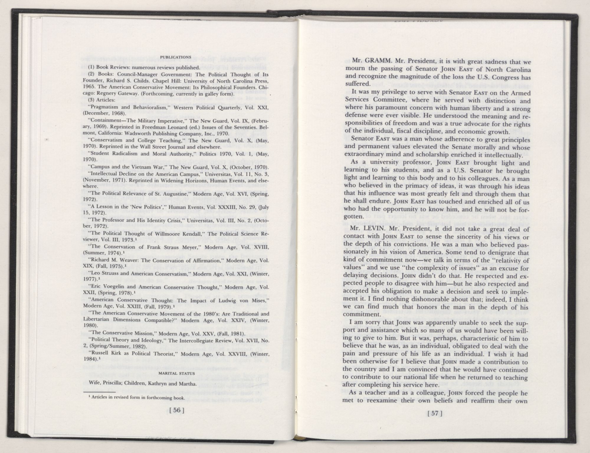 EAST was the author of a book on council-manage government published by the University of North Carolina Press and was on the editorial boards of Modern Age and the Political Science Review at the time of his death.