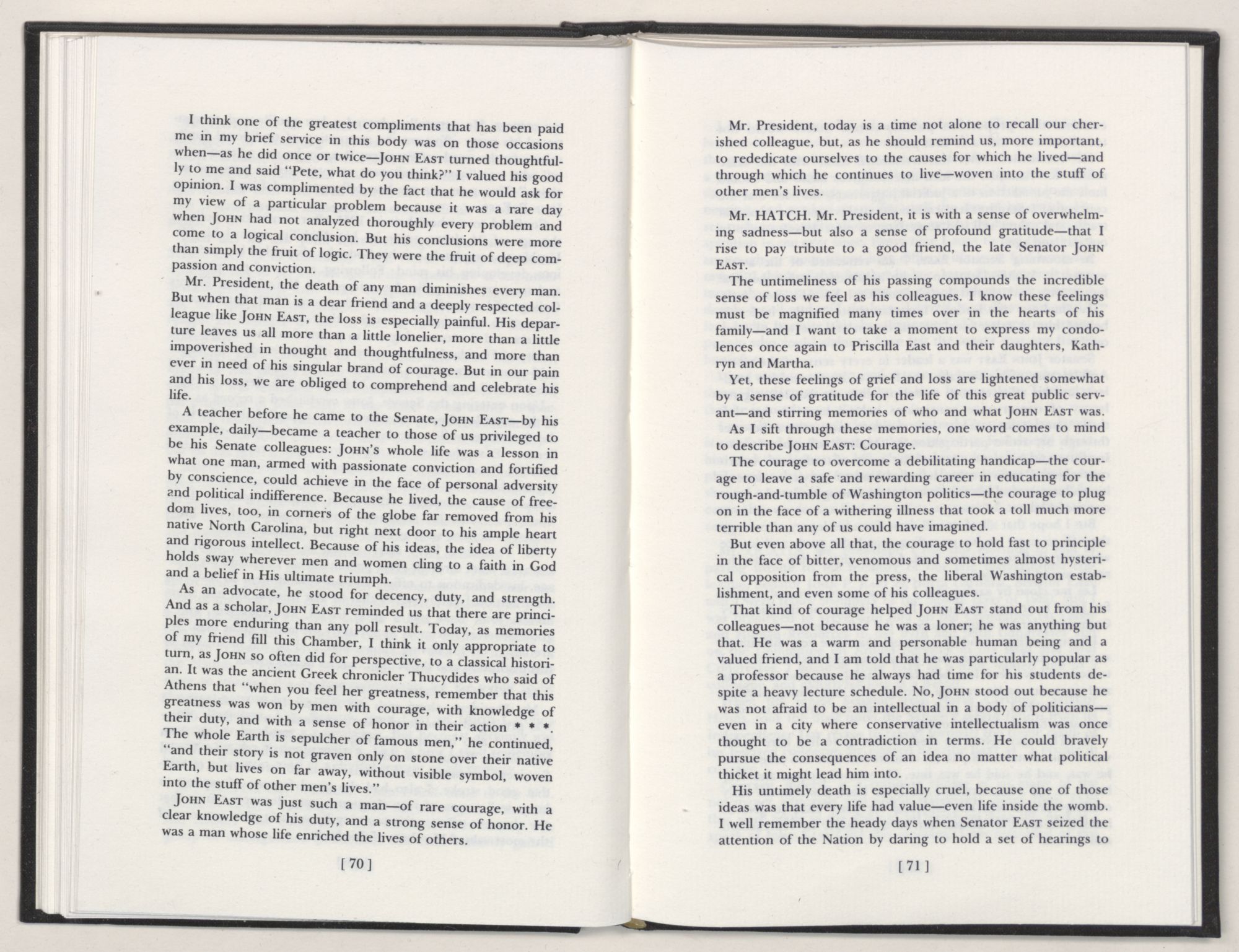 Senator Orrin G. Hatch, R-Utah, said: “One word comes to mind to describe JOHN EAST. That is courage.”