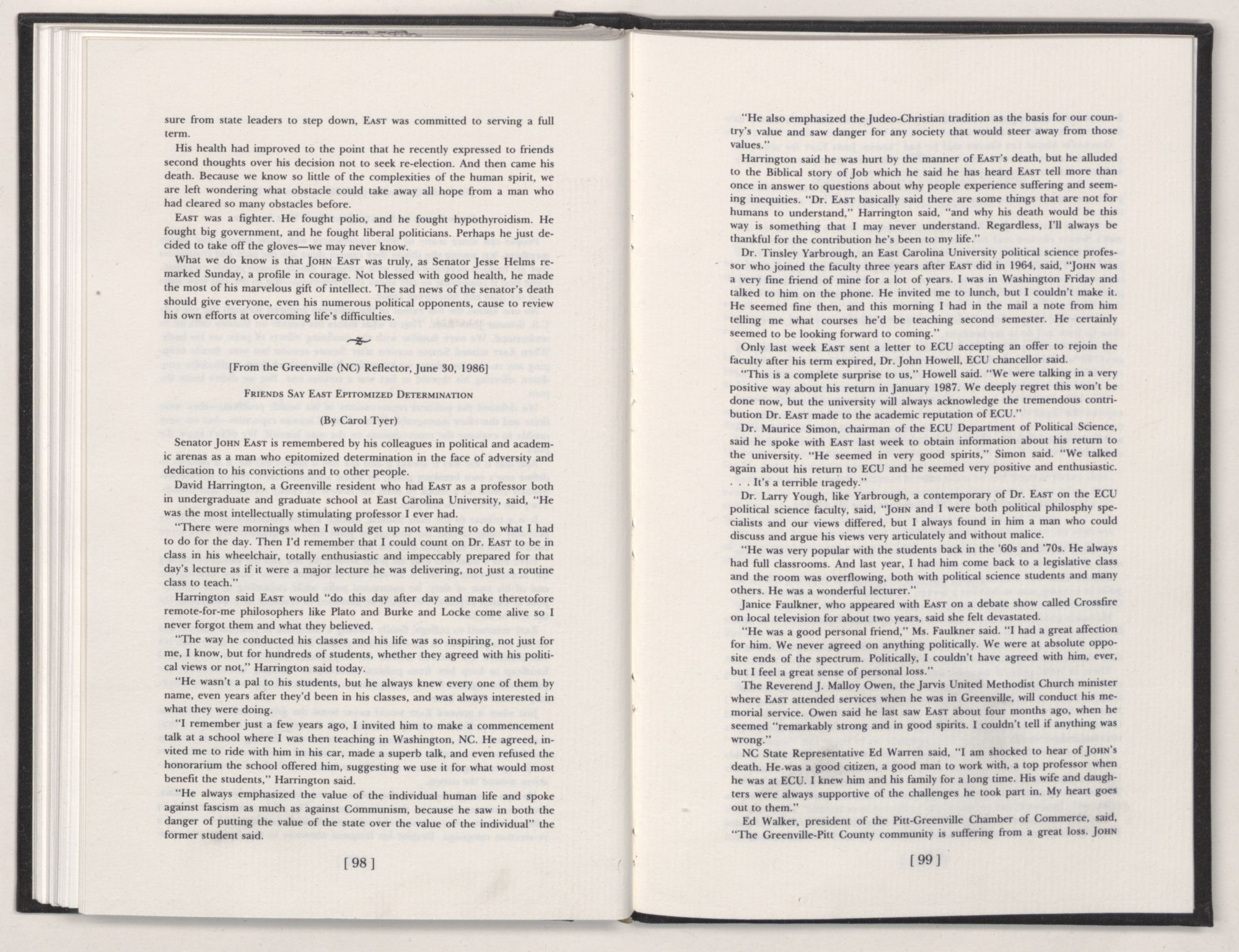JOHN EAST was due to return home to Greenville and to East Carolina University this fall in a position created for him by the political science department. Dr. Maurice D. Simon, the Chairman of the political science department at ECU said that everyone “was very enthusiastic about his (planned) return to the faculty. He was a political scientist who taught very effectively for many years with the students. It would have been a rare and special opportunity to have Senator EAST return to the political science department staff.”