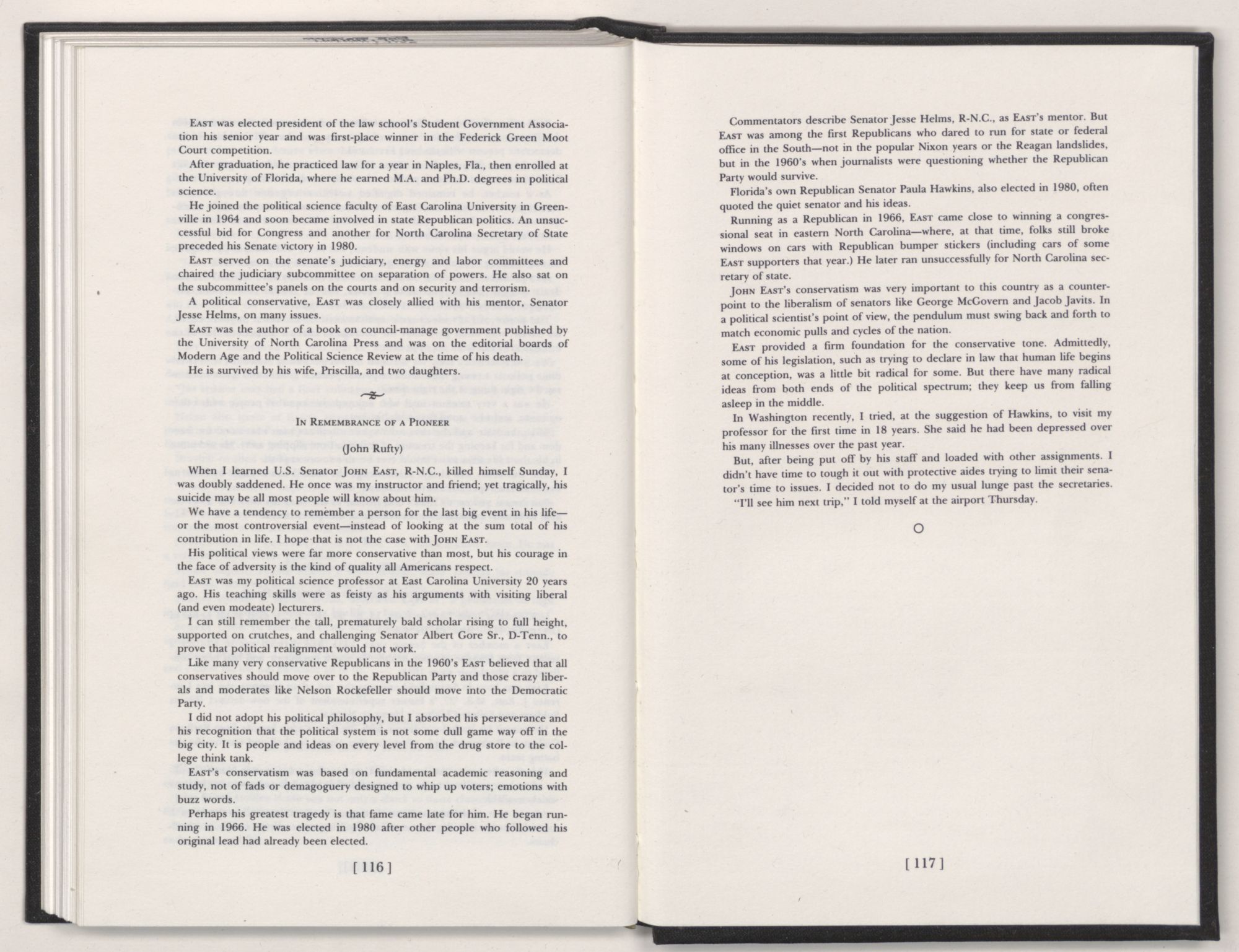 “JOHN EAST never pussyfooted around,” said Senator J. James Exxon, D-Nebraska. “You knew exactly where he stood and we all respected him for that.