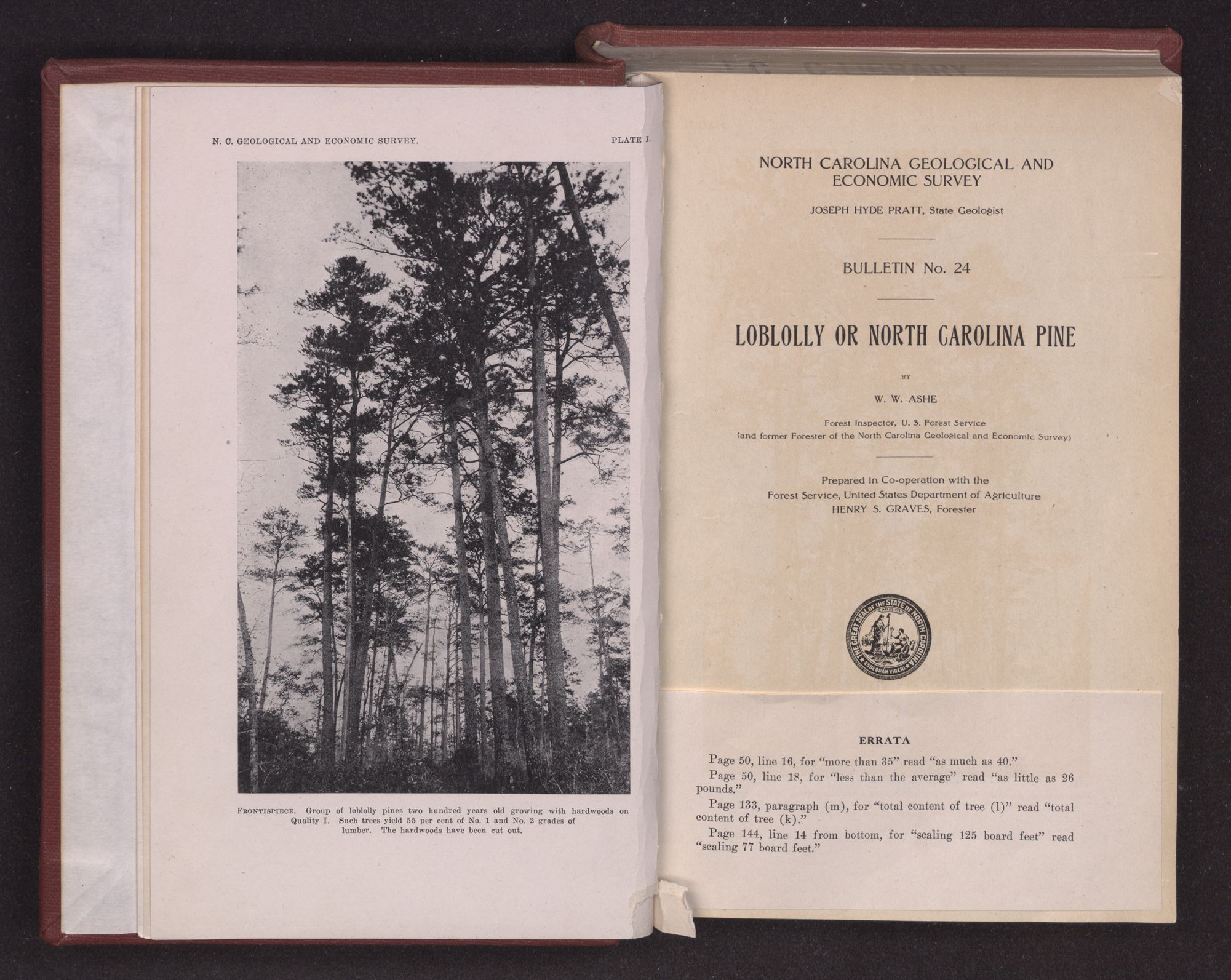 24. Loblolly or North Carolina Pine, by W. W. Ashe, Forest Inspector, U. S. Forest Service (and former Forester of the North Carolina Geological and Economic Survey). Pepared in Coöperation with the Forest Service, U. S. Department of Agriculture, 1914. 8°, 176 pp., 27 plates, 5 figs. Postage 10 cents.