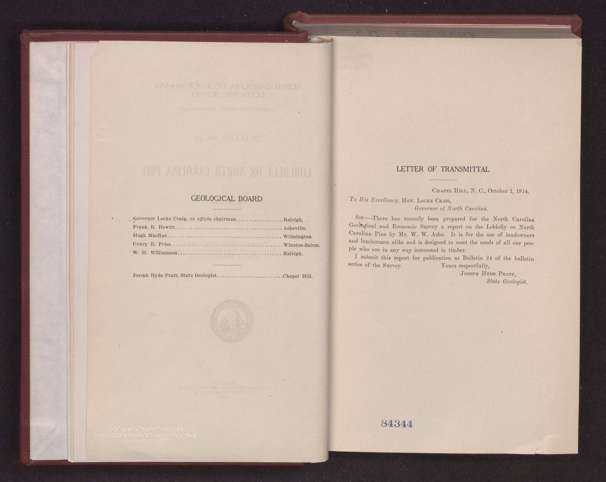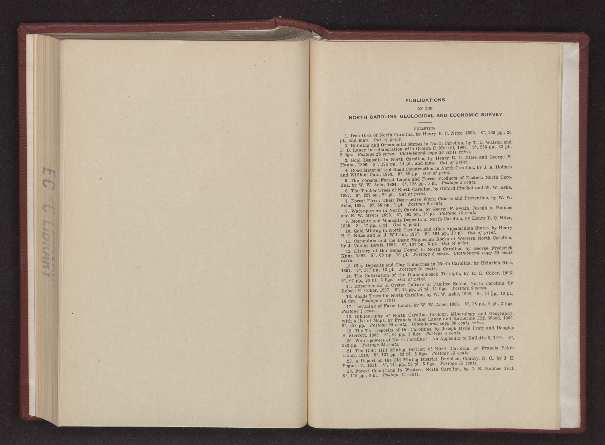 18. Bibliography of North Carolina Geology, Mineralogy and Geography, with a list of Maps, by Francis Baker Laney and Katherine Hill Wood, 1909. 8°, 428 pp. Postage 25 cents. Cloth-bound copy 30 cents extra.