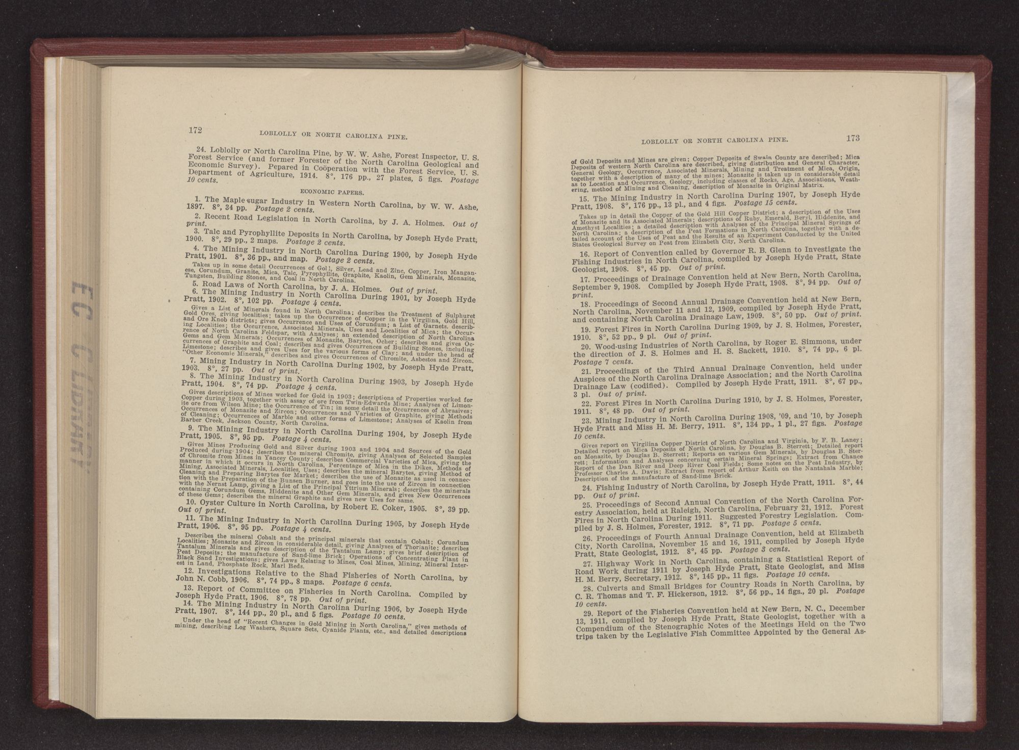 24. Fishing Industry of North Carolina, by Joseph Hyde Pratt, 1911. 8°, 44 pp. Out of print.