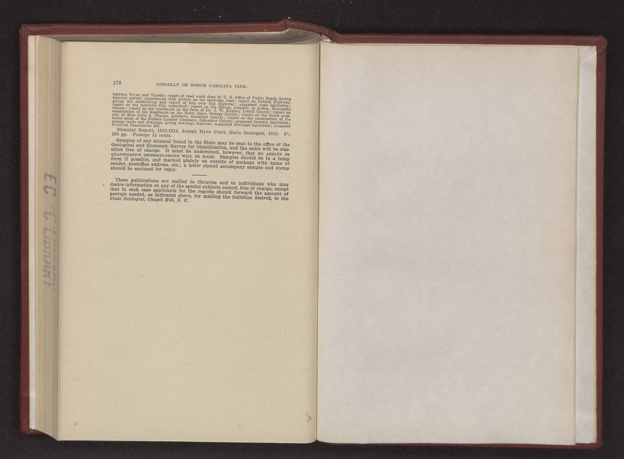 Biennial Report, 1913-1914, Joseph Hyde Pratt, State Geologist, 1915. 8°, 190 pp. Postage 14 cents.