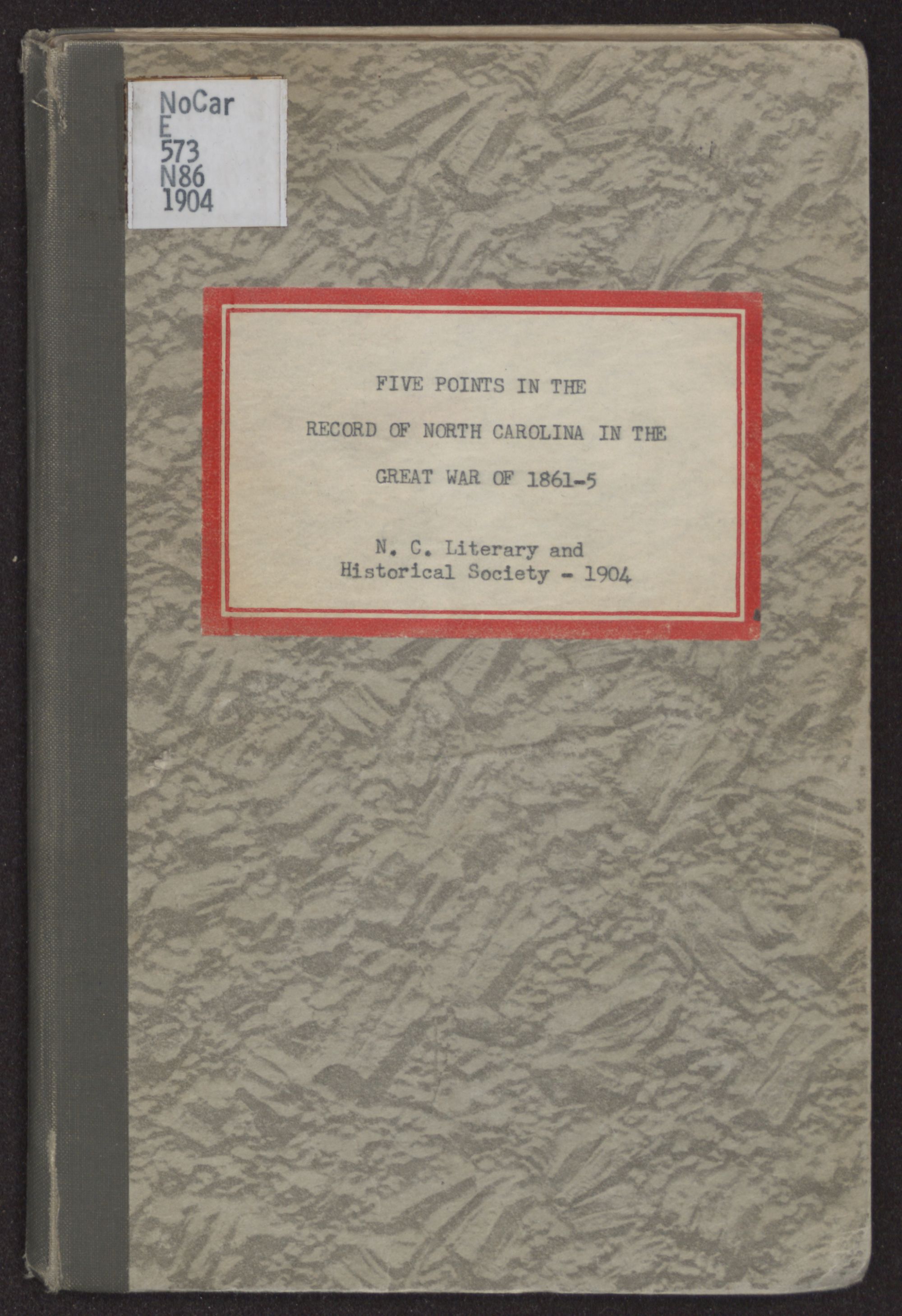 FIVE POINTS IN THERECORD OF NORTH CAROLINA IN THEGREAT WAR OF 1861-5N.C. Literary andHistorical Society--1904
